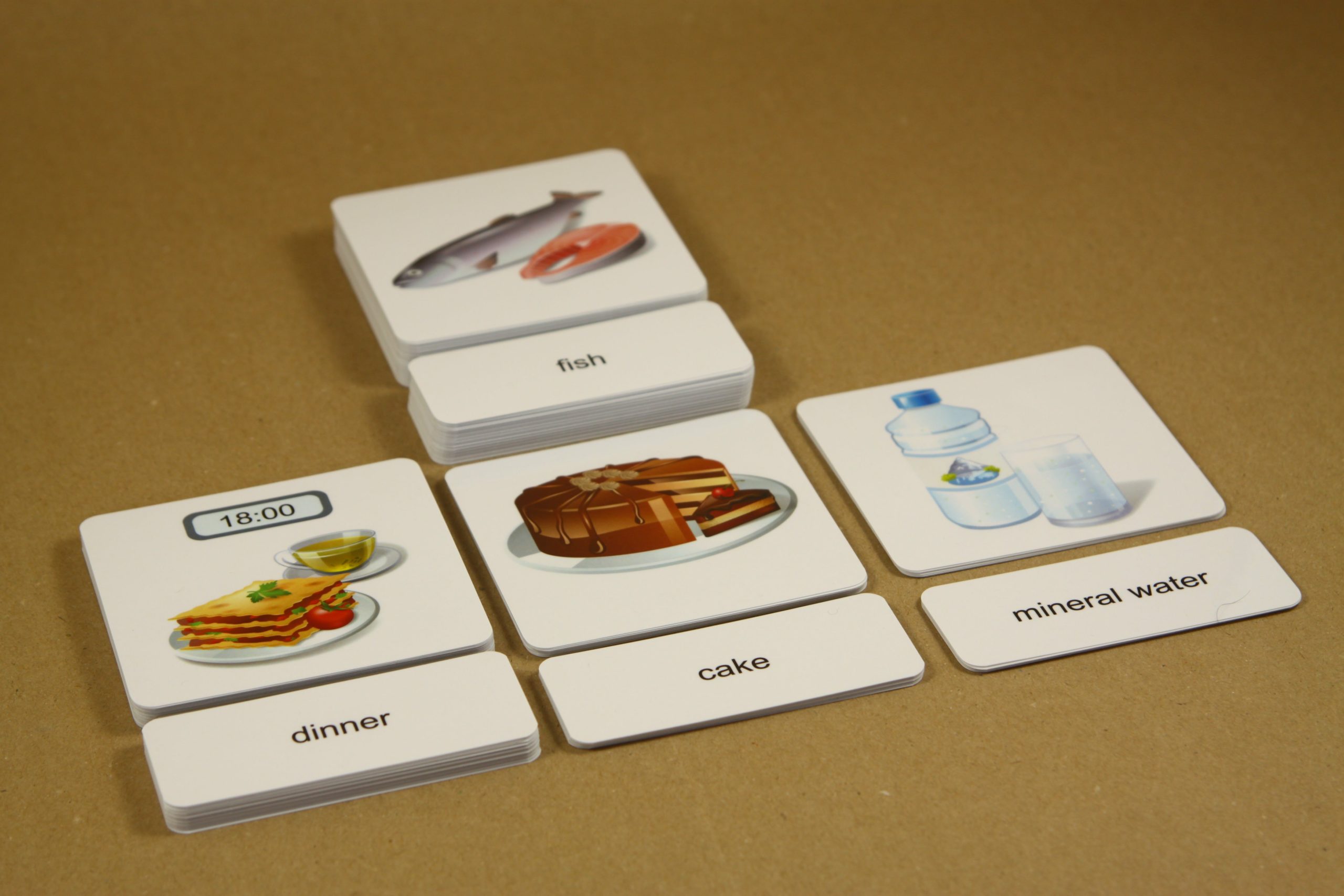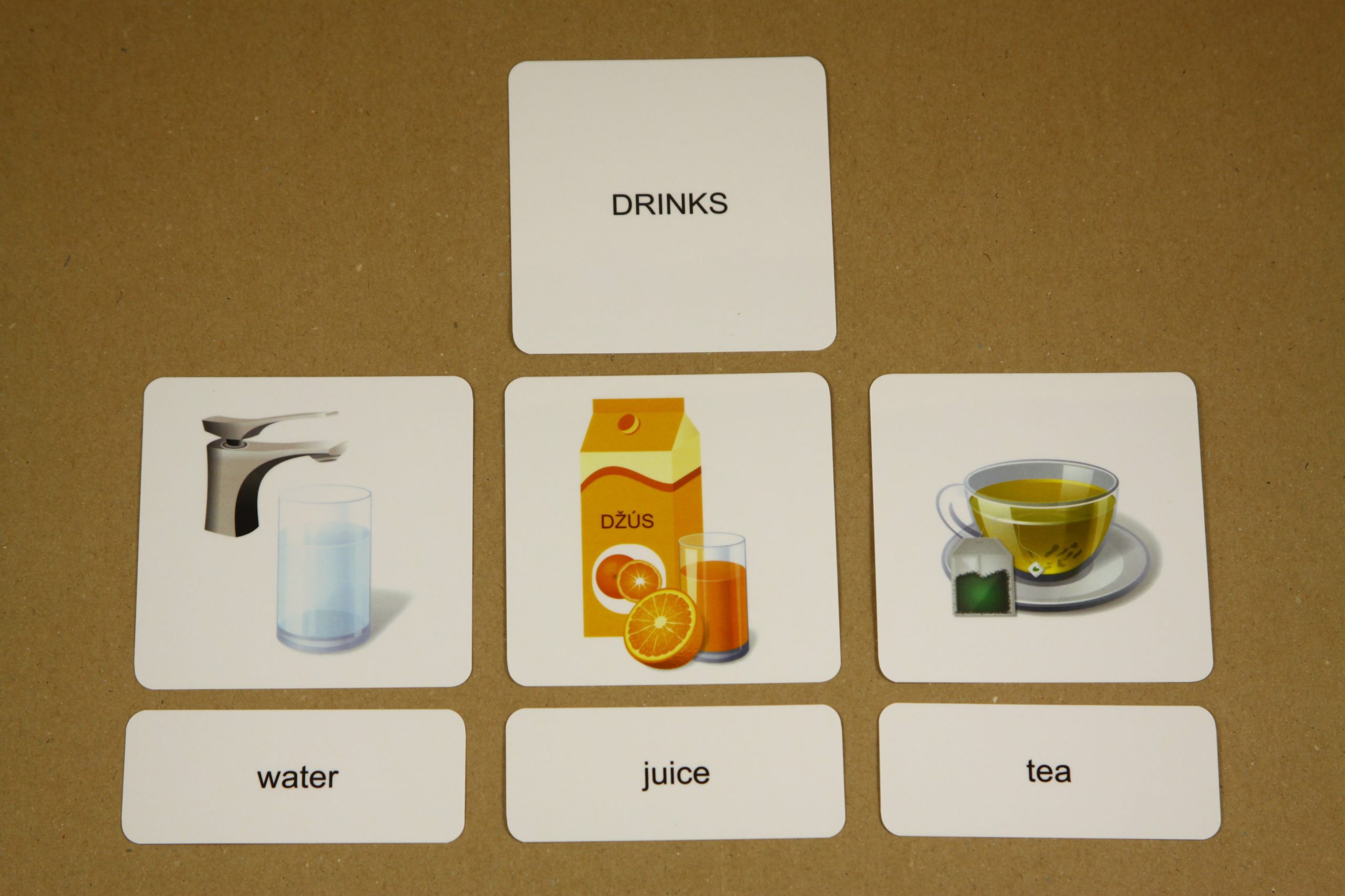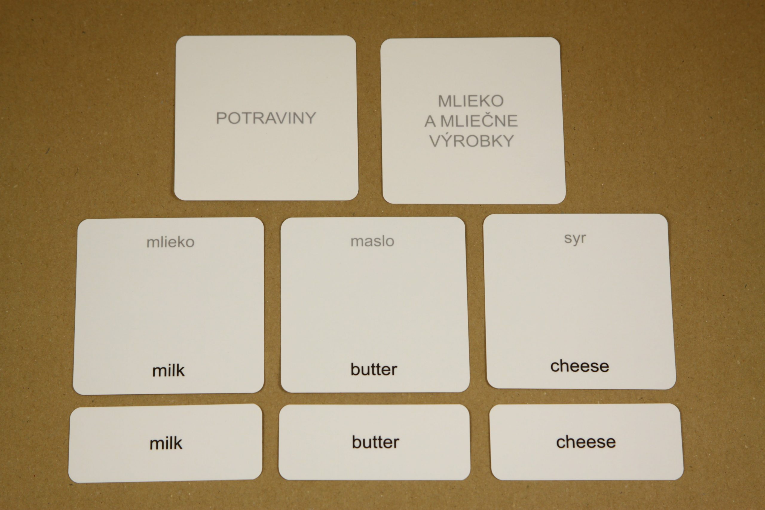 Úlohou detí je prikladať k základným kartám s obrázkom malé karty s textom. Po otočení základnej karty si môžu samy skontrolovať správnosť riešenia. Na rubovej strane základnej karty je anglický výraz aj jeho slovenský ekvivalent. Pri práci môžete použiť aj karty na triedenie.
