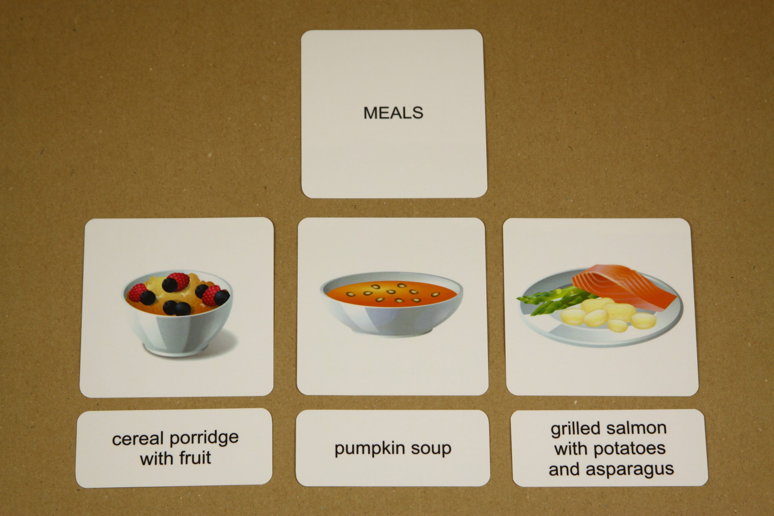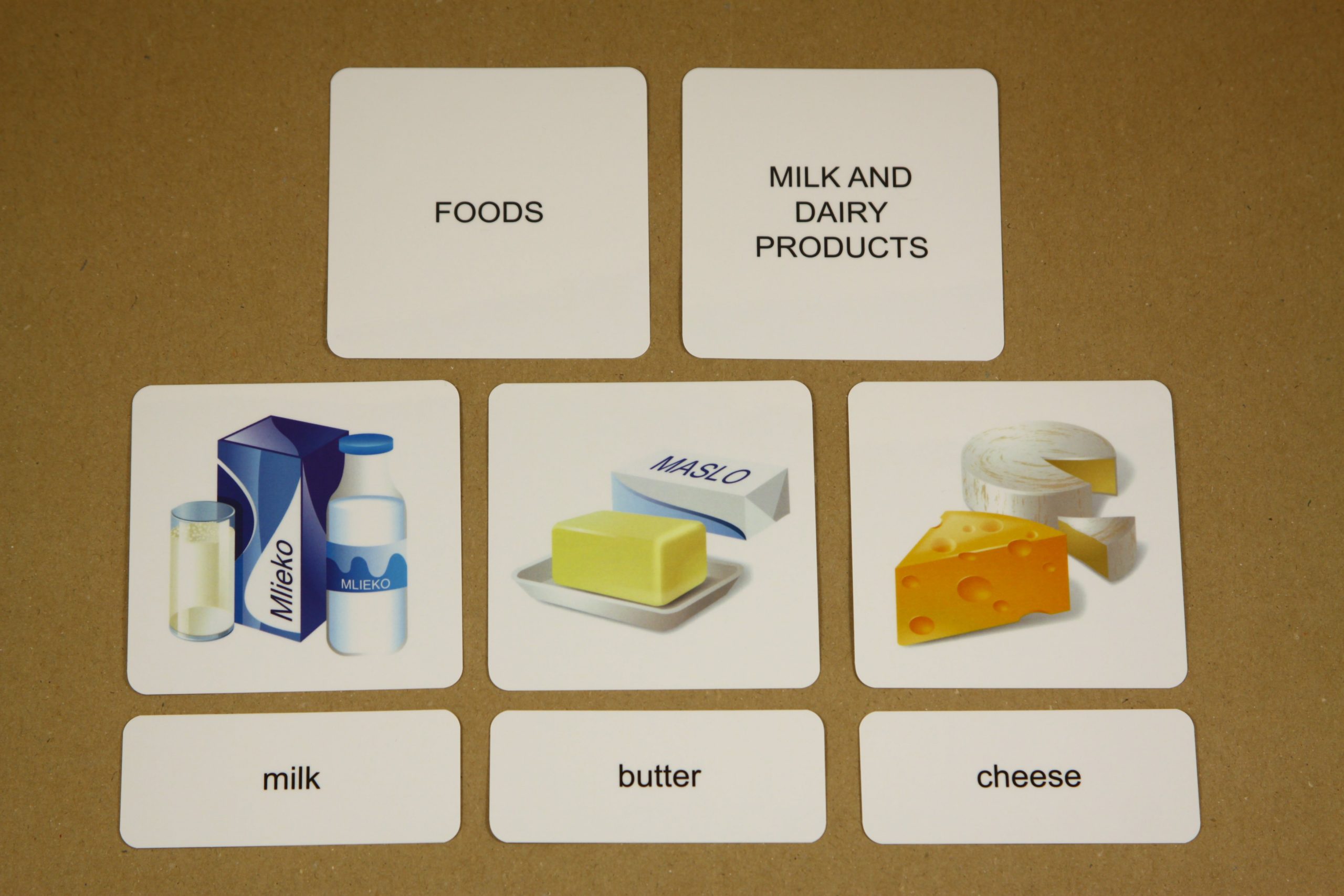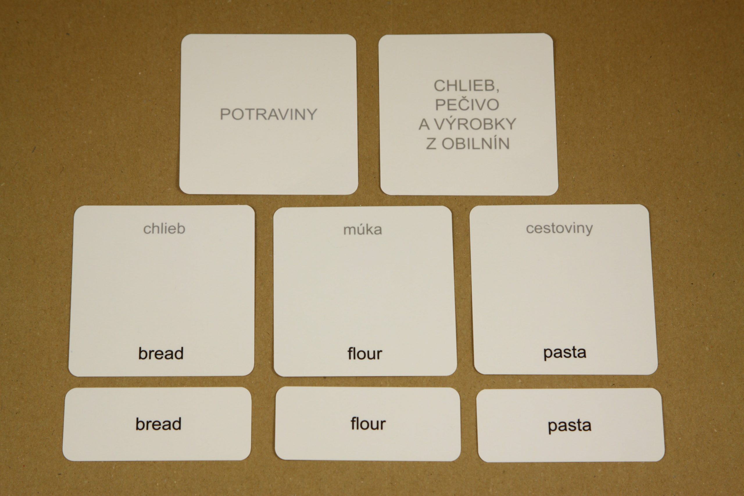 Úlohou detí je prikladať k základným kartám s obrázkom malé karty s textom. Po otočení základnej karty si môžu samy skontrolovať správnosť riešenia. Na rubovej strane základnej karty je anglický výraz aj jeho slovenský ekvivalent. Pri práci môžete použiť aj karty na triedenie.