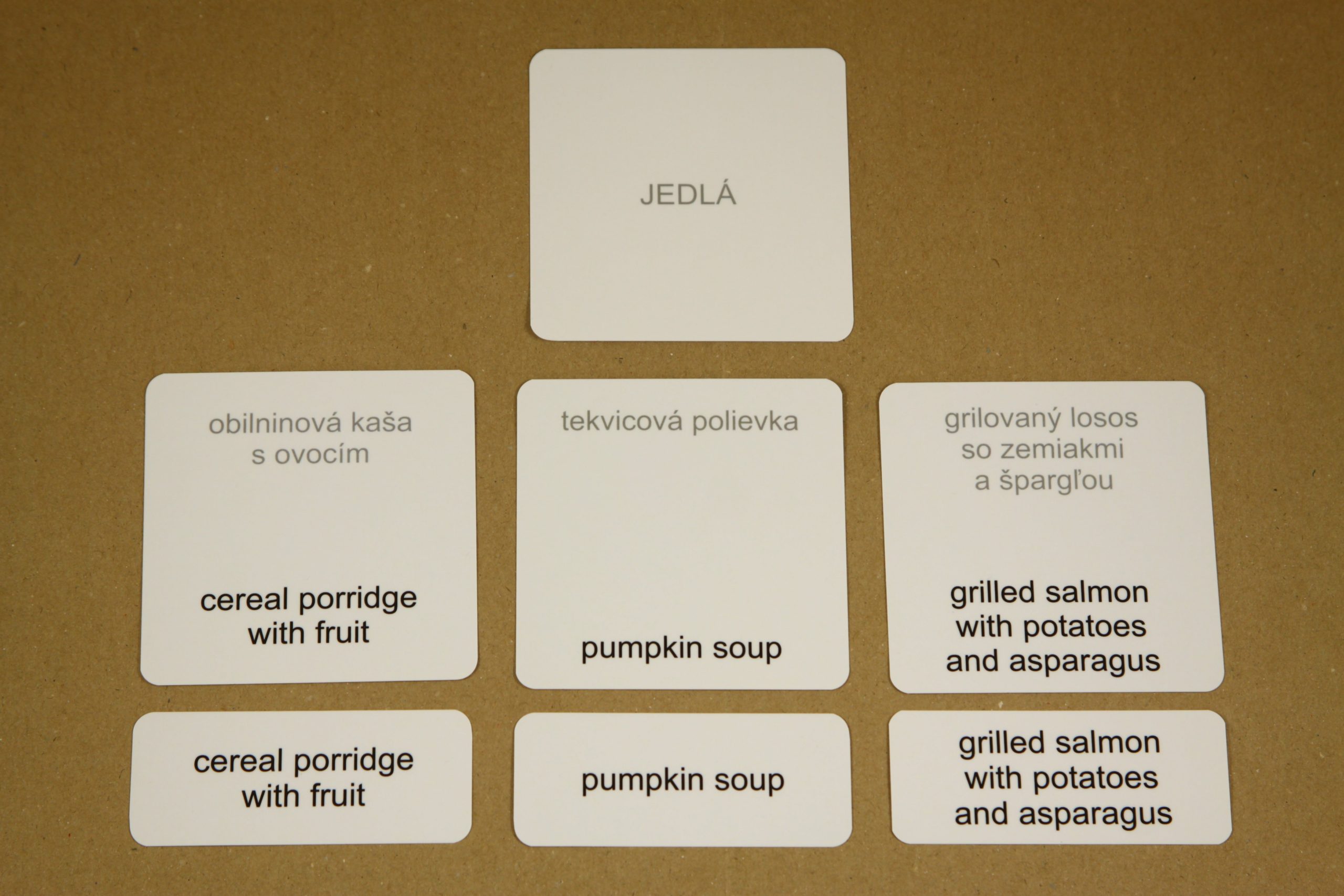 42 malých kariet s textom - tematický okruh Jedlá