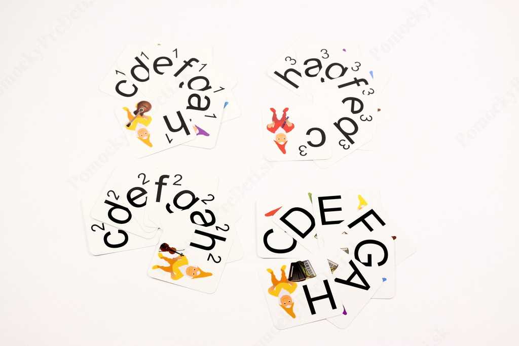 - Zvolíte si ľubovoľnú notu hudobnej abecedy (napr. „c“). Deti hľadajú karty, na ktorých je nota „c“ v rozličných oktávach (C1, C, c, c1, c2, c3, c4) – každú oktávu predstavuje jeden hudobný nástroj. Po otočení kariet si dieťa skontroluje správnosť riešenia. Všetky karty by mali mať kontrolné znaky (hudobné nástroje) rovnakej farby.