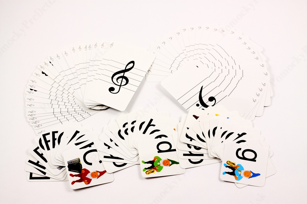 - 26 základných podlhovastých kariet s notou v husľovom kľúči v rozsahu od f do c4 (karty sú označené malým husľovým kľúčom vľavo hore)