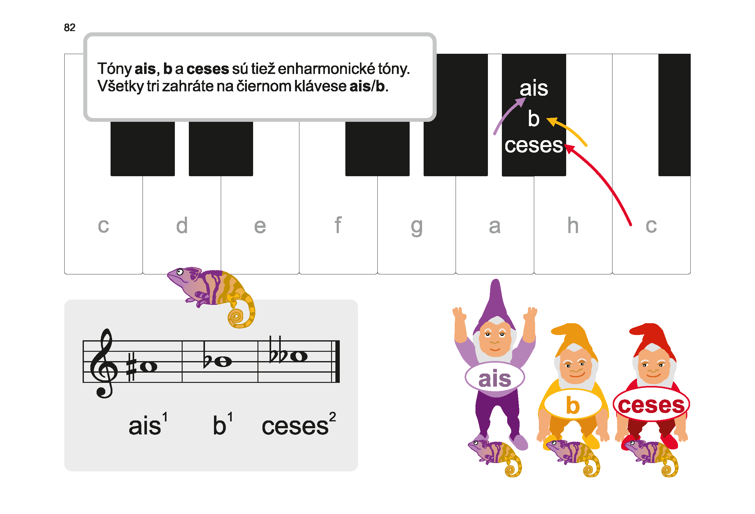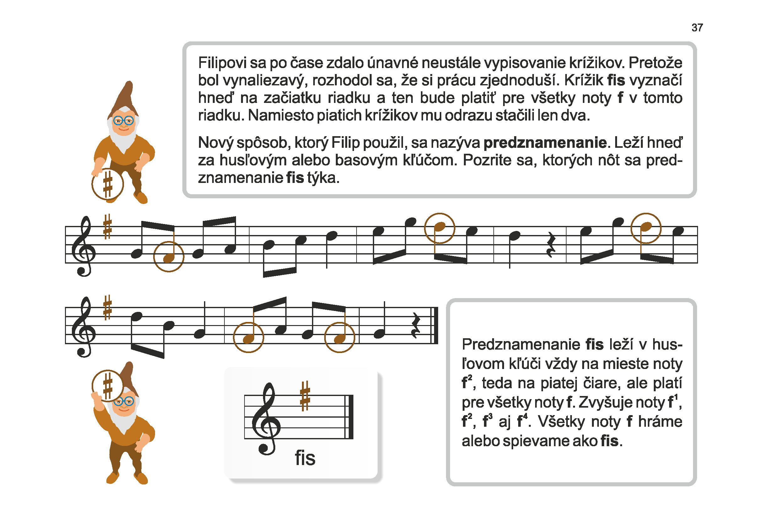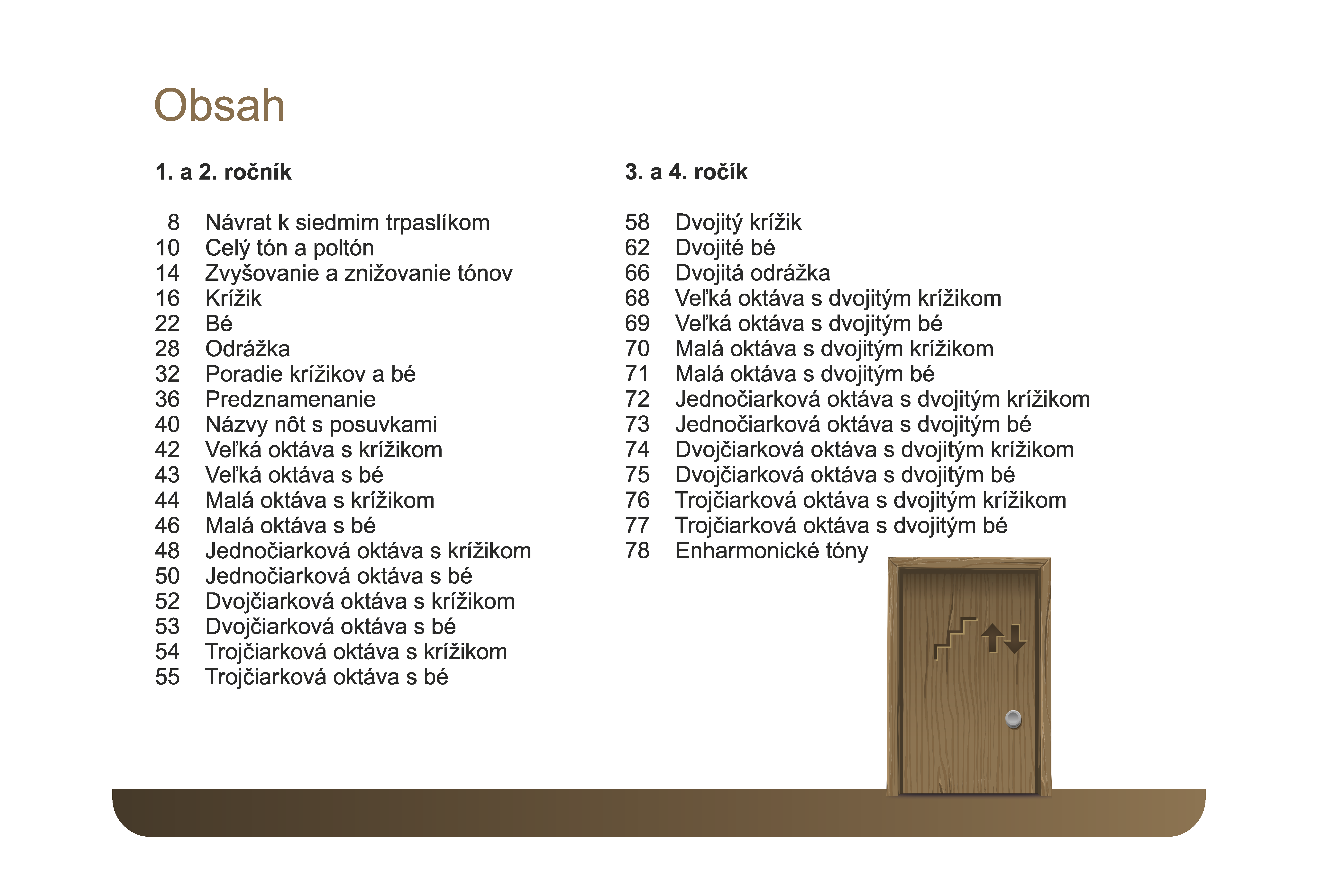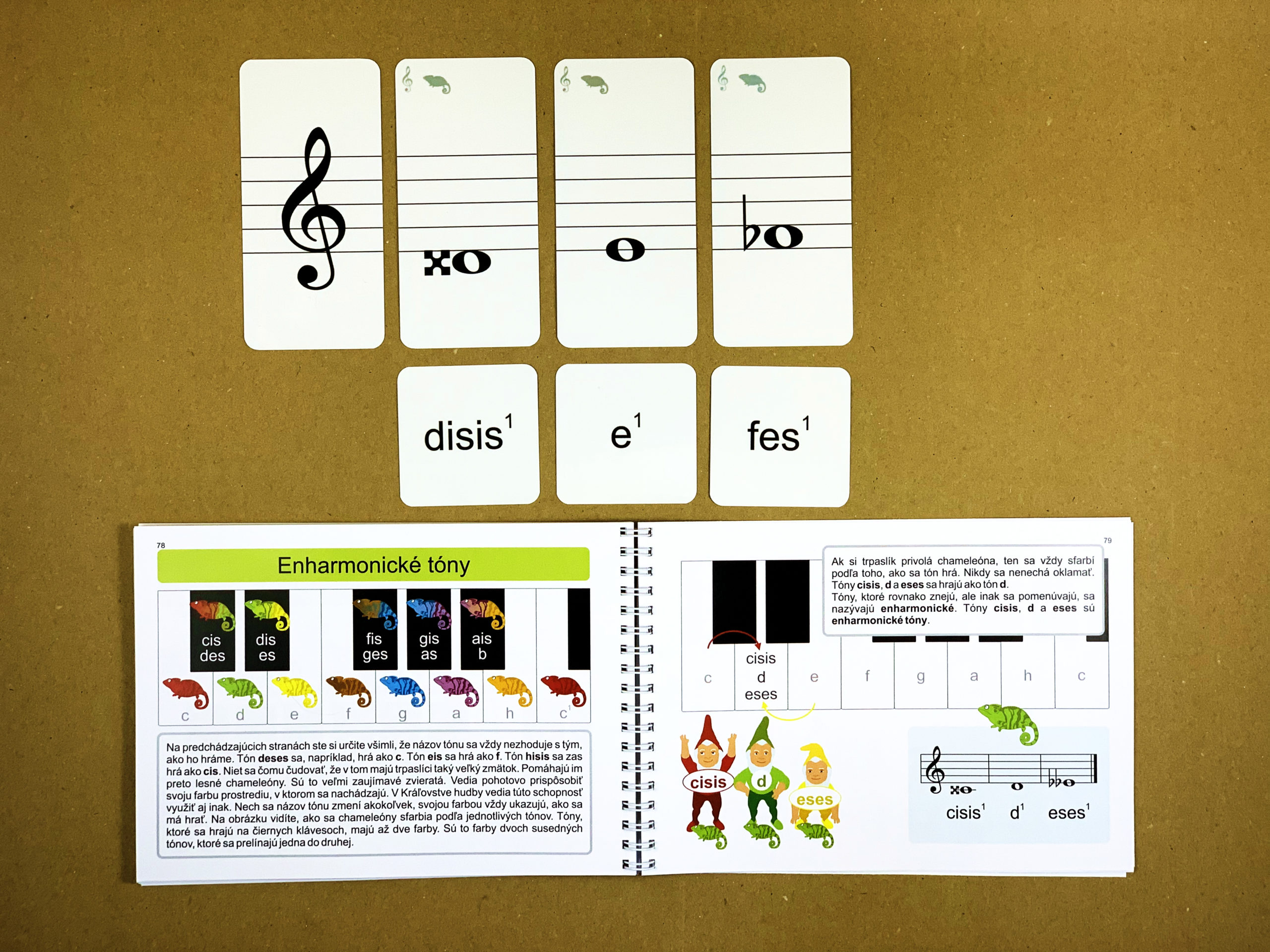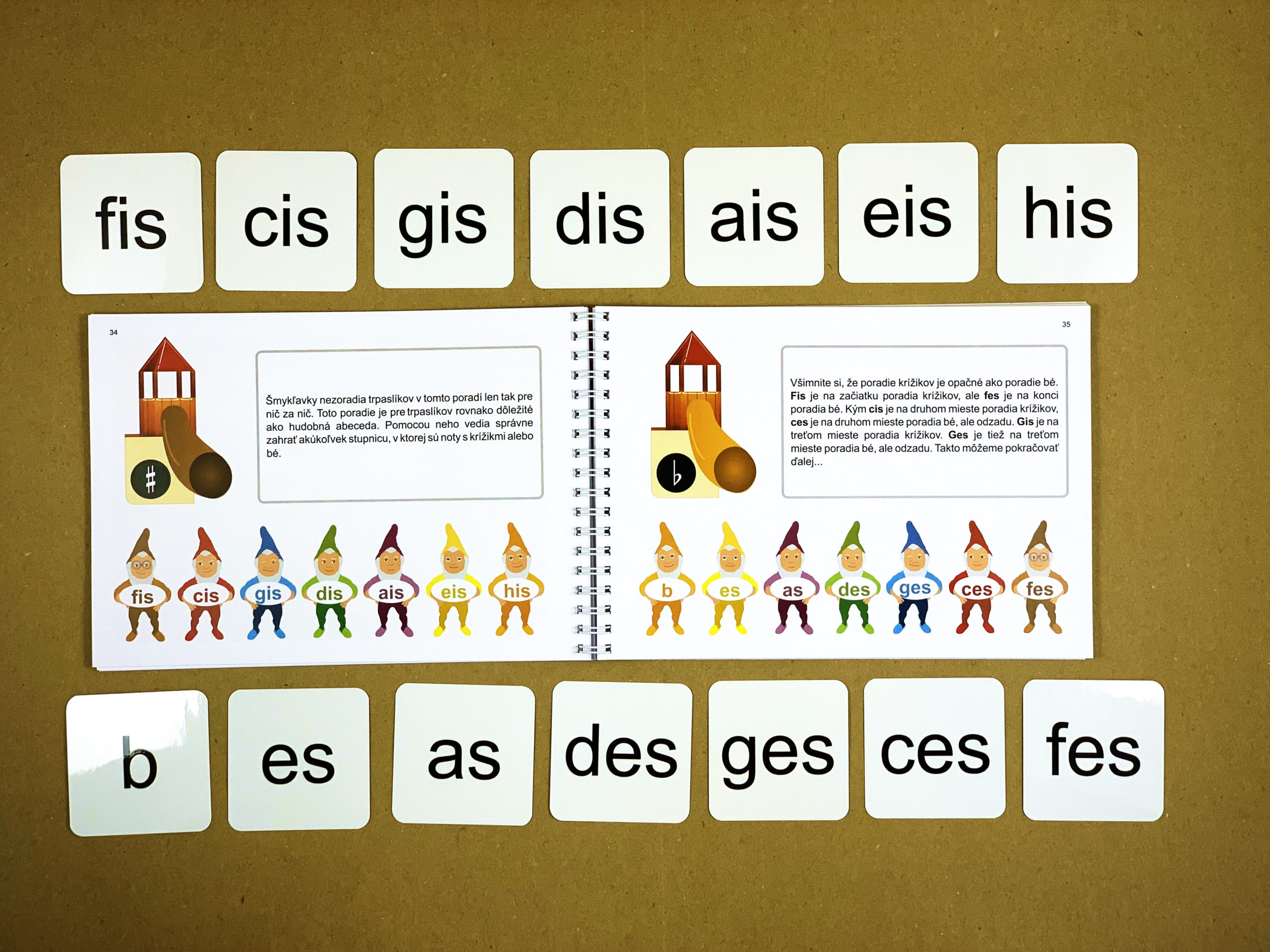 Súčasťou učebnej pomôcky je učebnica, ktorá obsahovo nadväzuje na titul Tónová sústava. V príbehu opäť figurujú postavy siedmich trpaslíkov. Ich zábavné schodisko pomáha deťom pochopiť funkciu posuviek v hudbe. Deti sa oboznamujú aj s významom predznamenania a enharmonickou zámenou tónov (obsah pozrite nižšie).