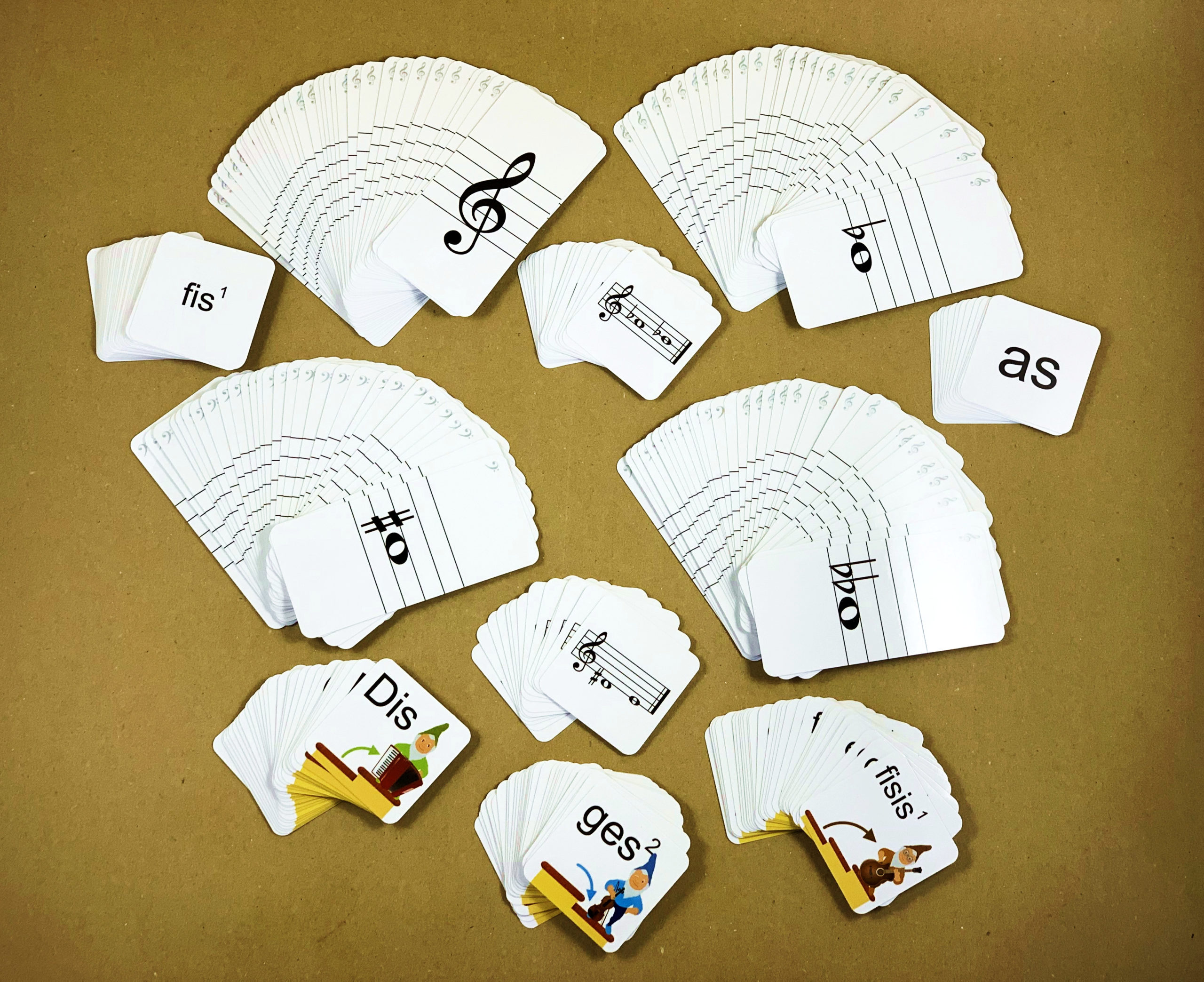 - 15 základných podlhovastých kariet s notou v husľovom kľúči v rozsahu od cis1 do cis3 (karty sú vľavo označené malým husľovým kľúčom)