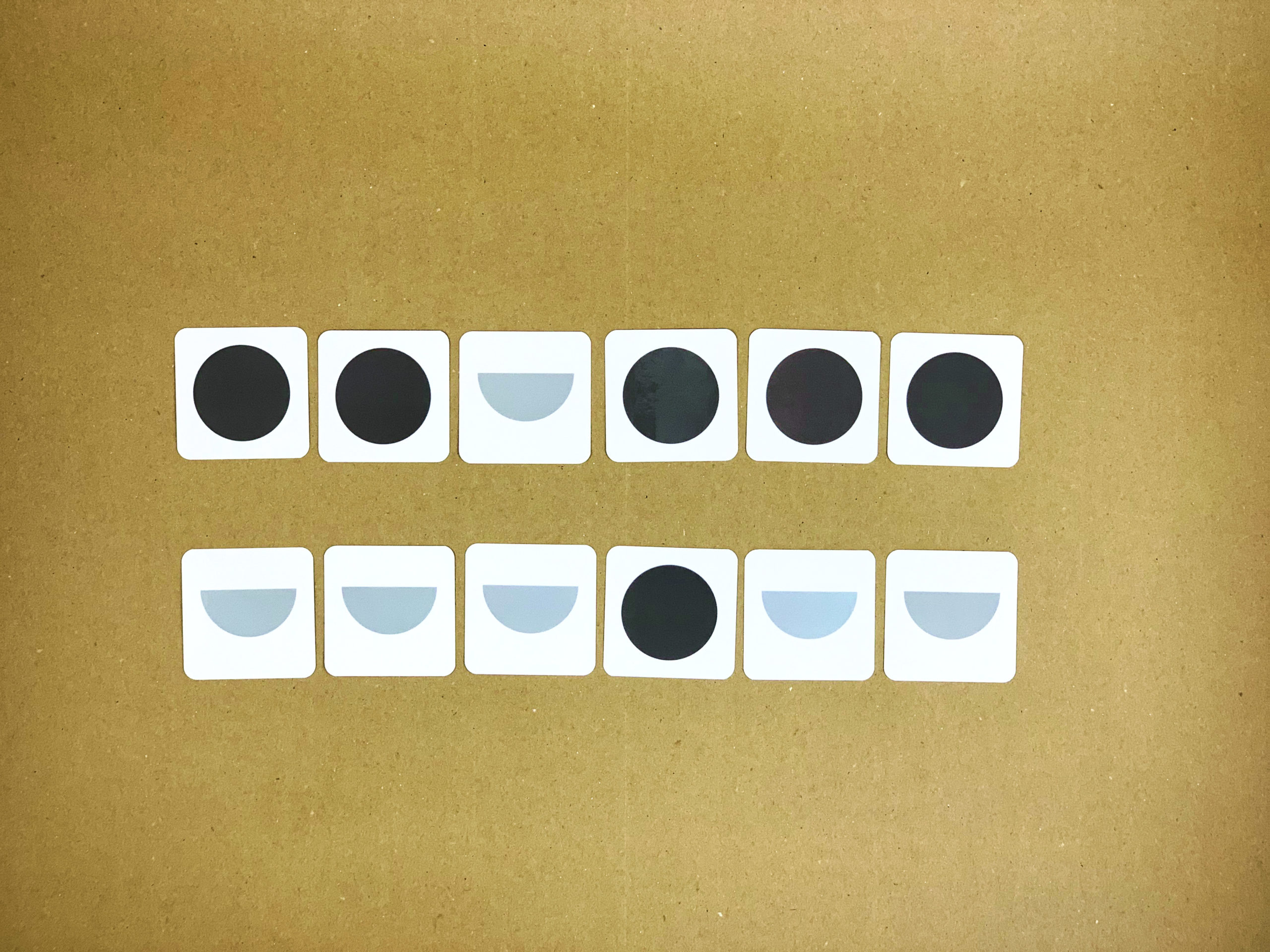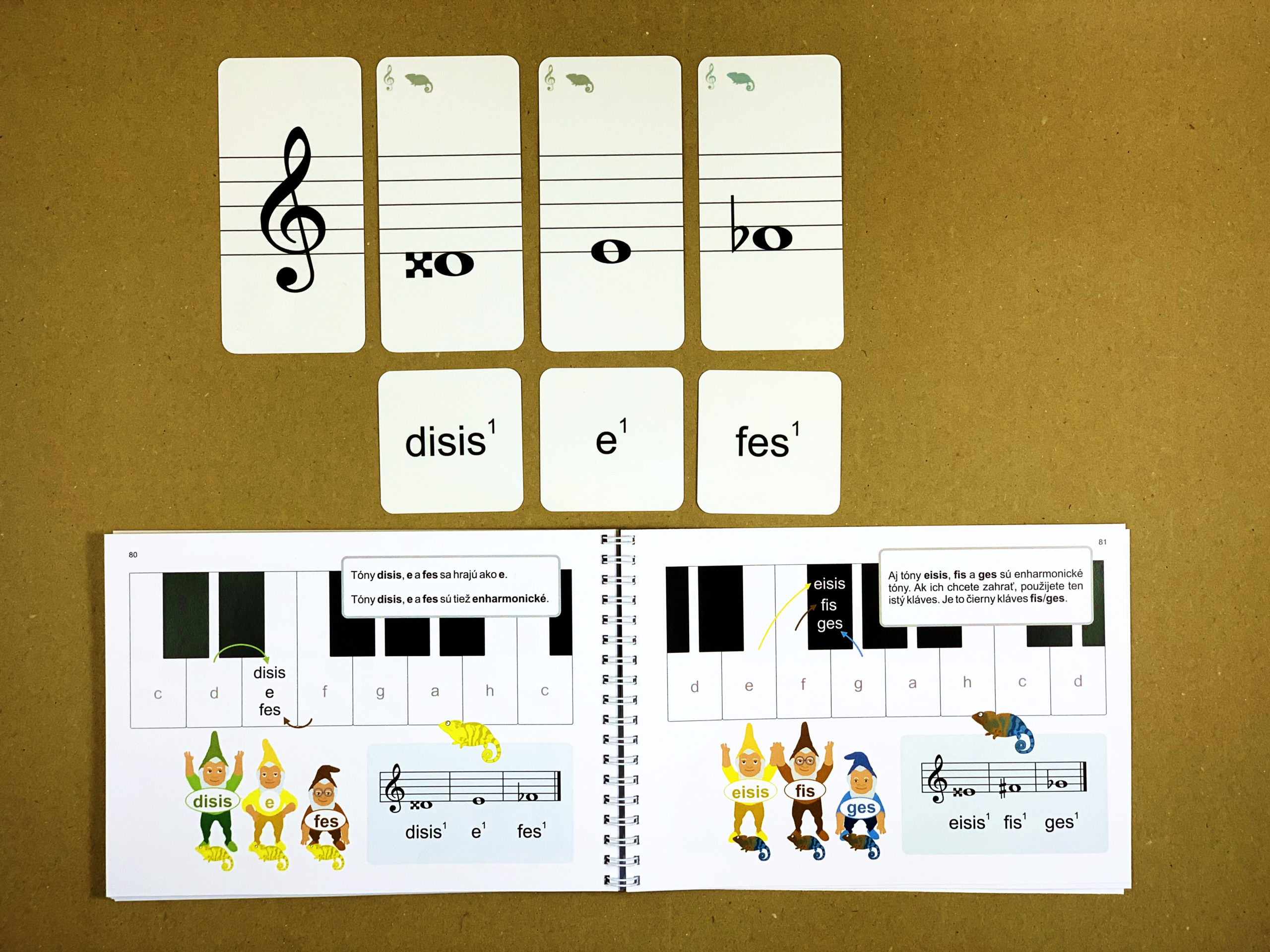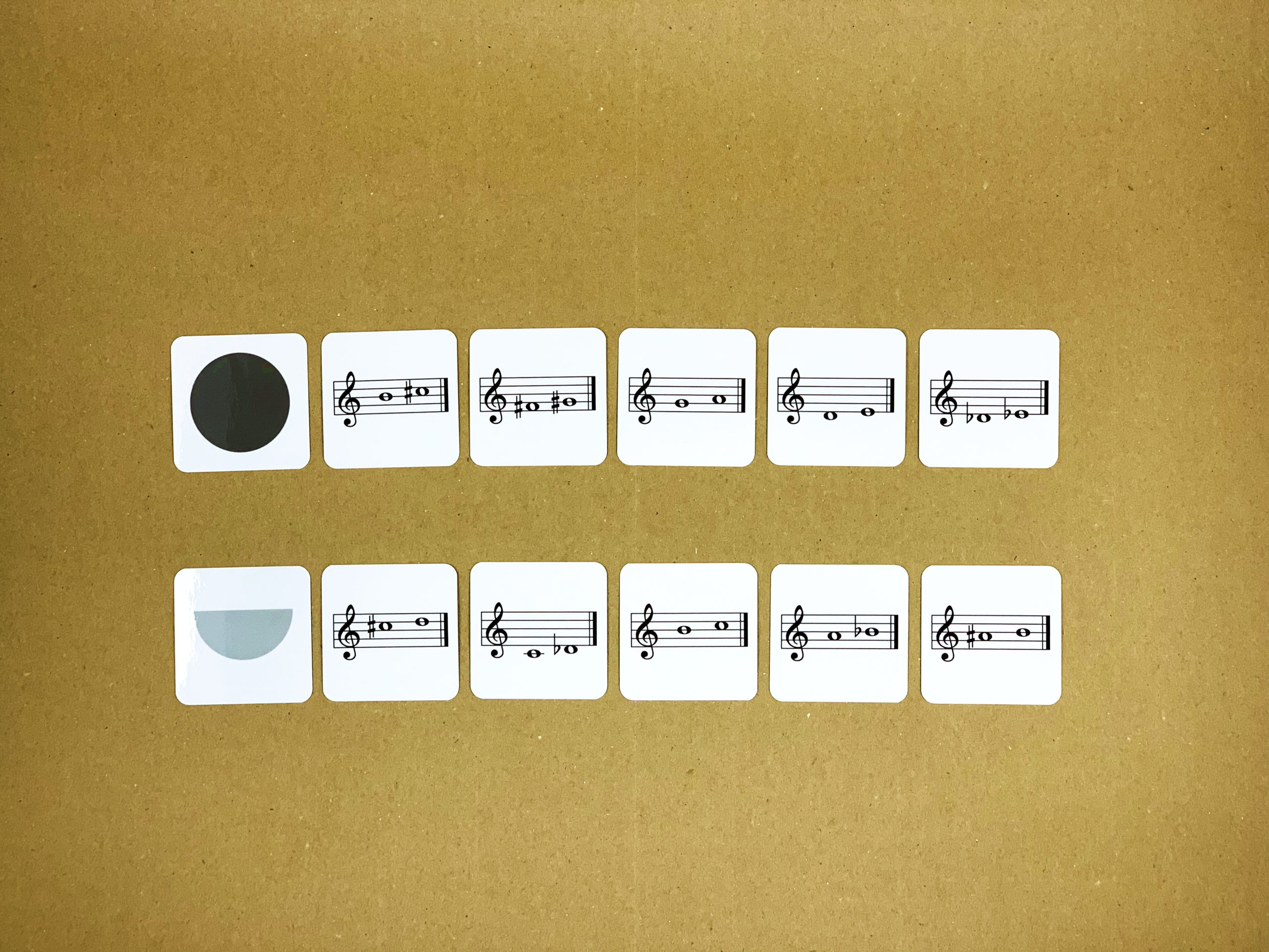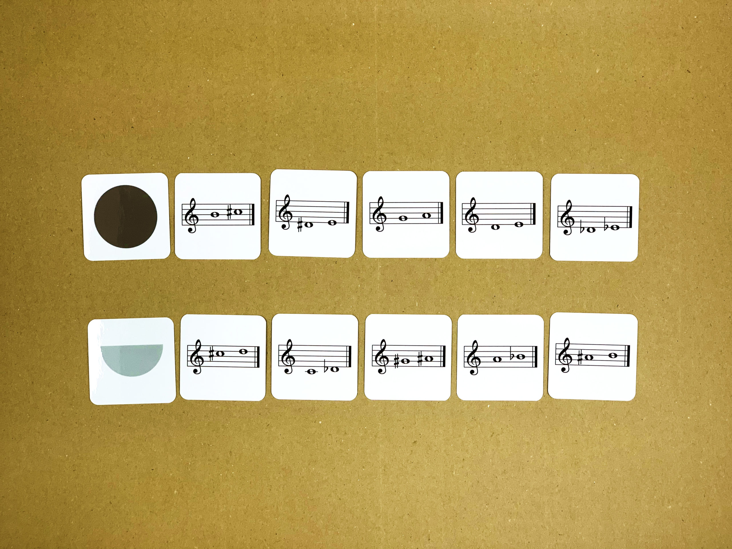 - 12 malých kariet s dvojicou tónov, ktoré tvoria poltón