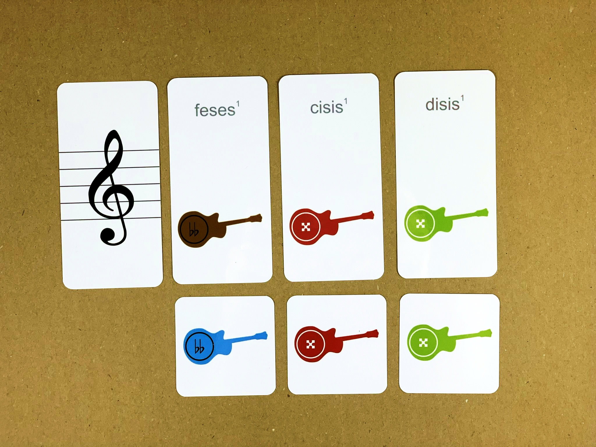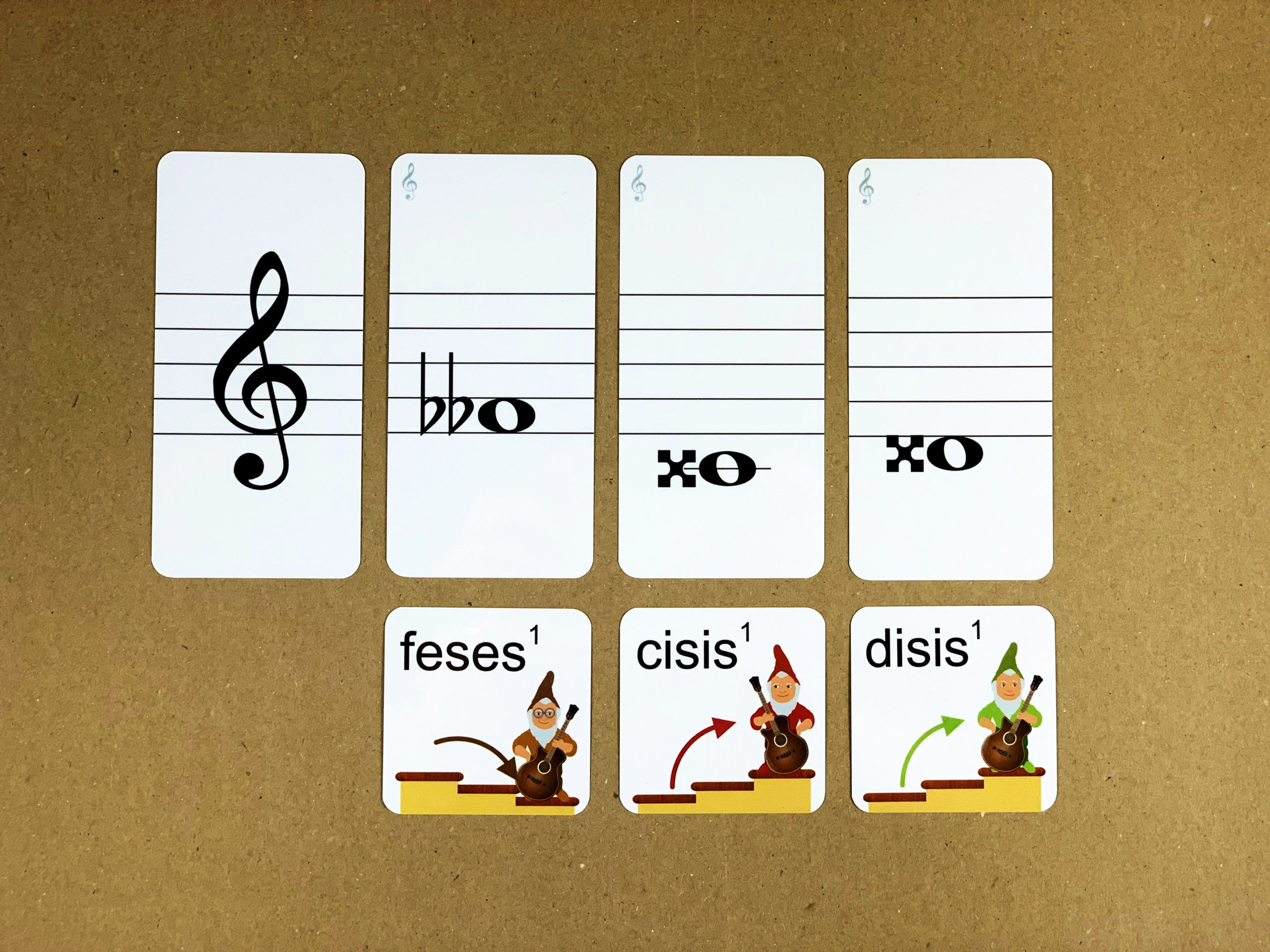 - 8 základných podlhovastých kariet s notou v husľovom kľúči v rozsahu od cisis1 do cisis2 (karty sú vľavo označené malým husľovým kľúčom)
