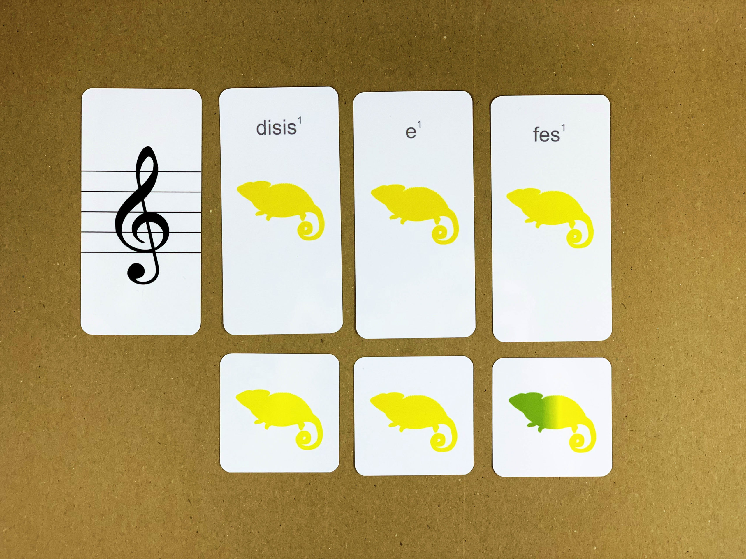 - 35 podlhovastých kariet s notou v husľovom kľúči (karty sú vľavo označené malým husľovým kľúčom a znakom chameleóna)