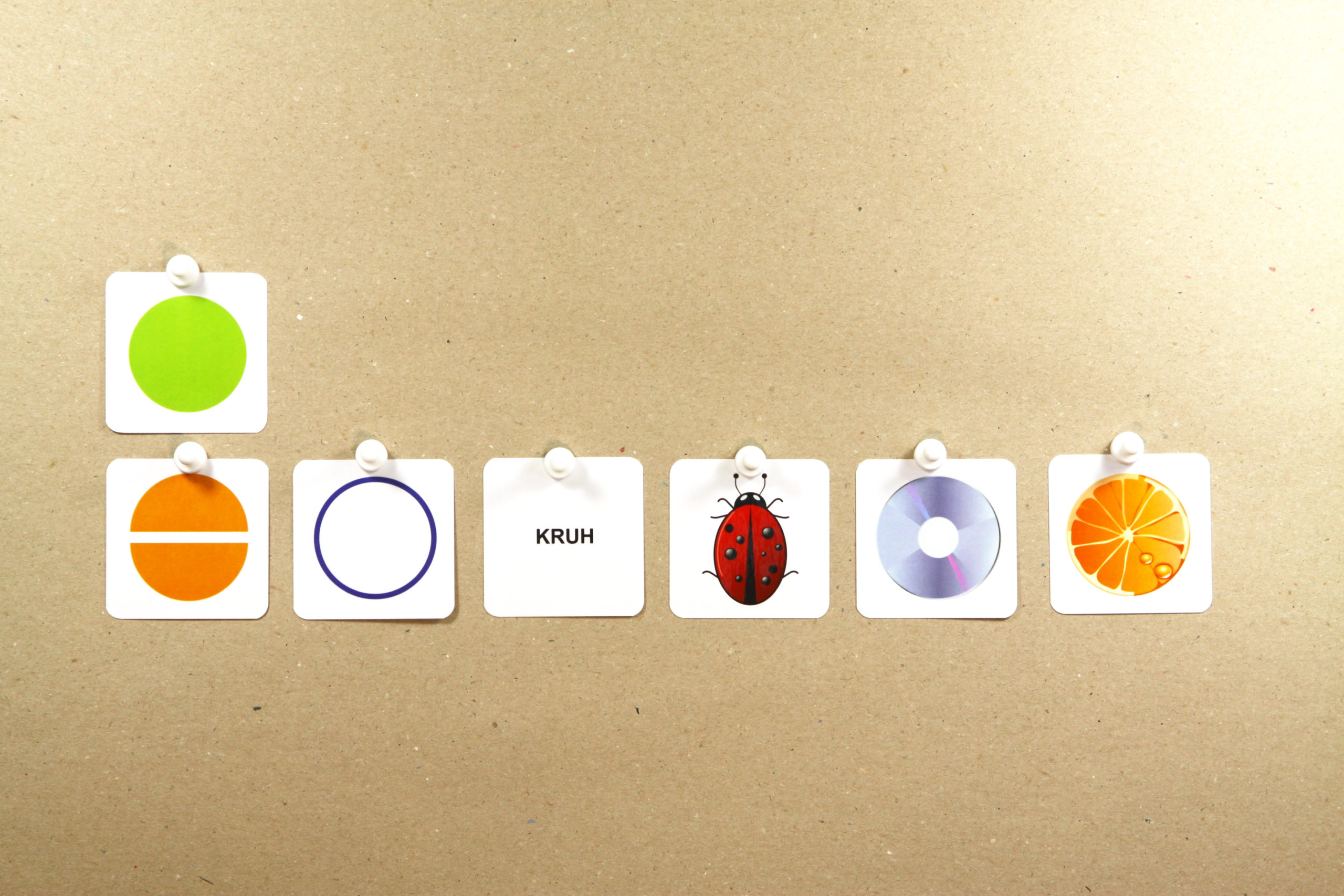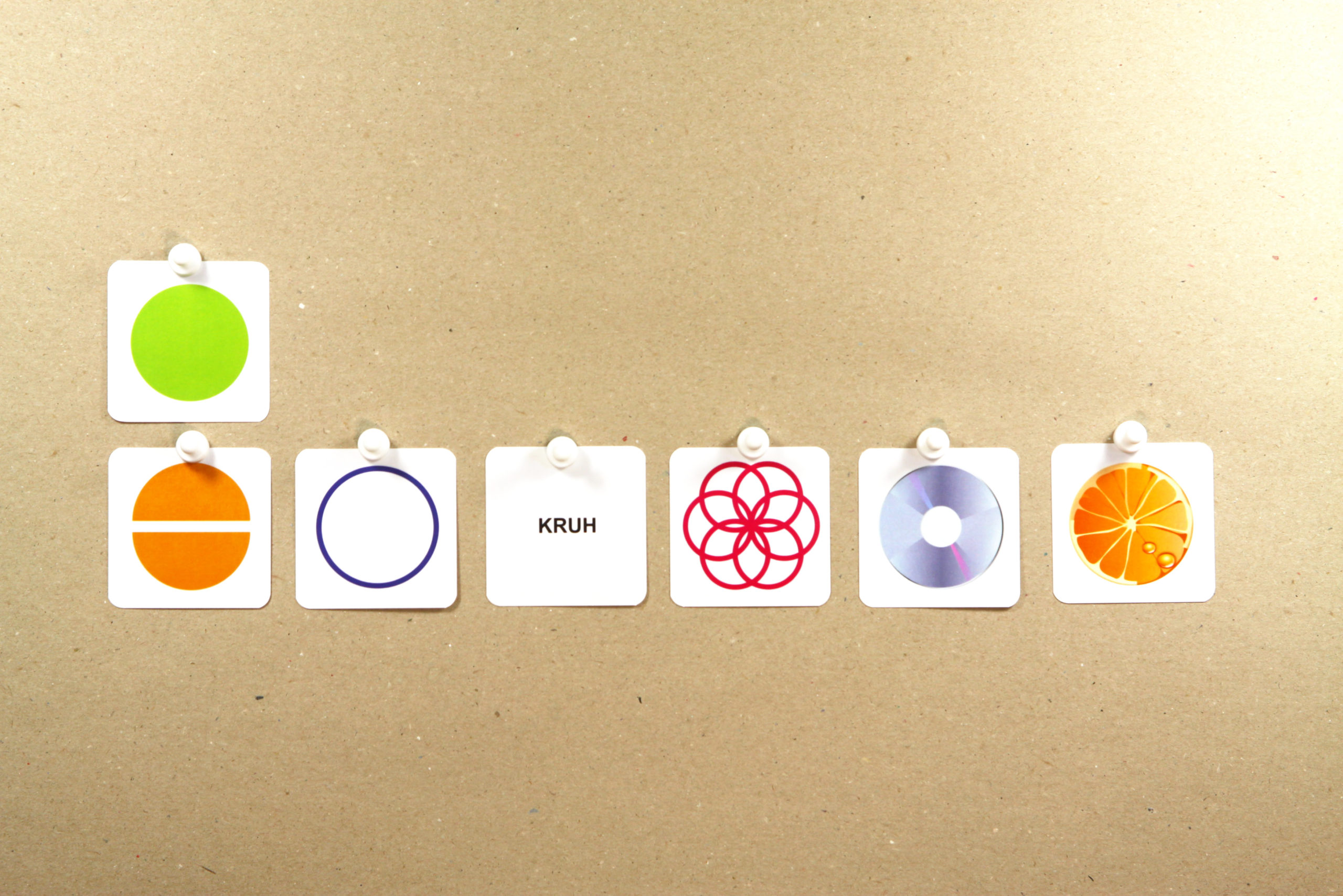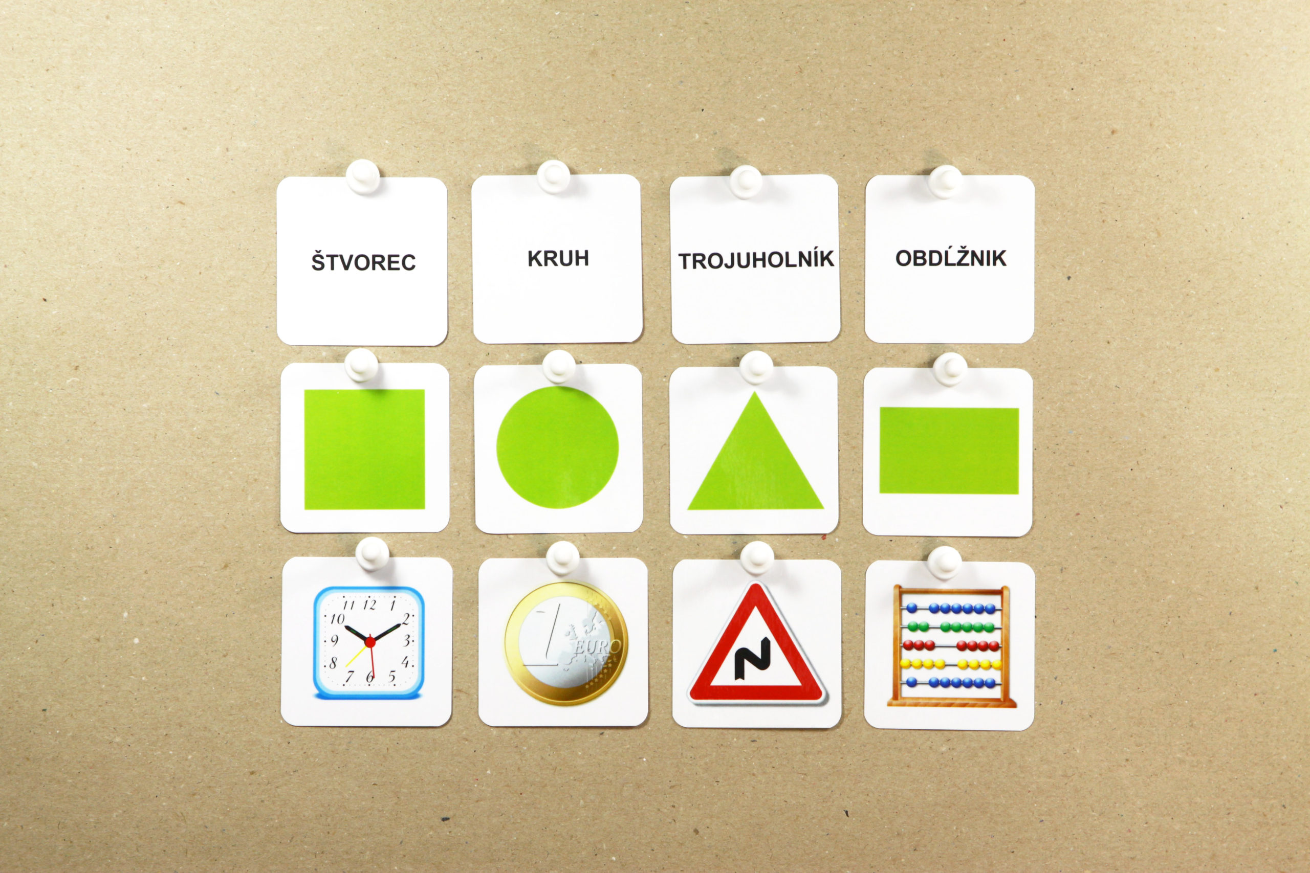 2. Zvolíte si ľubovoľný geometrický tvar a deti hľadajú spomedzi obrázkov len tie, ktoré patria k danému tvaru. Po otočení kariet si dieťa skontroluje správnosť riešenia. Všetky karty by mali mať rovnakú farebnú plochu.