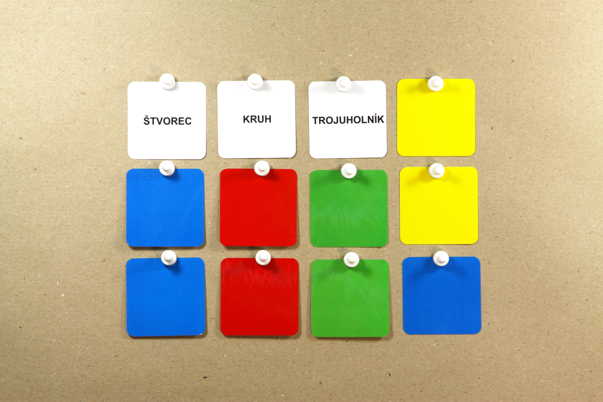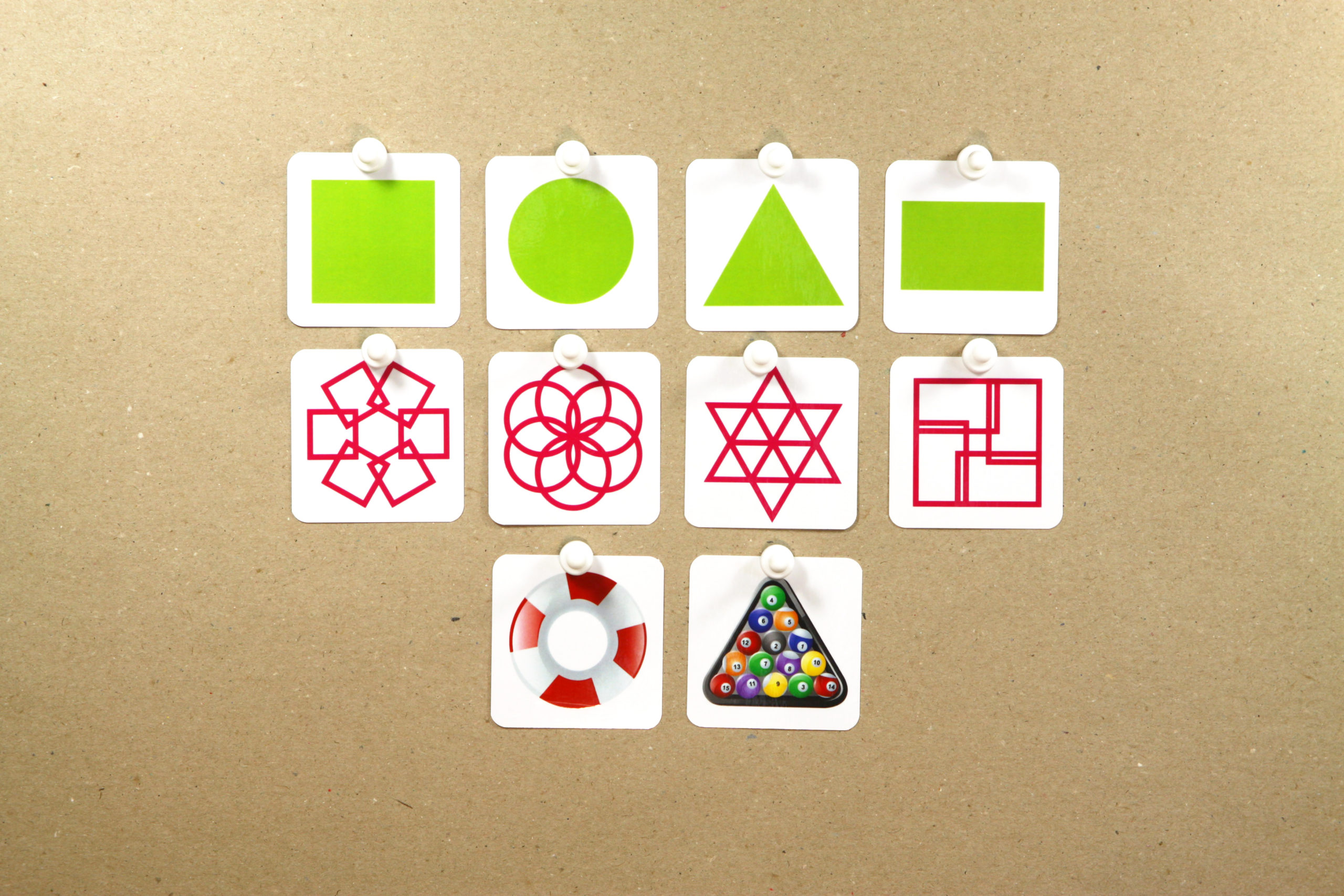 1. Vyložte niekoľko základných kariet s geometrickým tvarom. Úlohou detí je priradiť k tvarom príslušnú malú kartu. Deti môžu priraďovať obrázky, obrysy tvarov, rozdvojené tvary, ornamenty alebo názvy geometrických tvarov. Po otočení kariet si dieťa skontroluje správnosť riešenia. Dvojica vytvorená z vrchnej a spodnej karty by mala mať rovnakú farebnú plochu.
