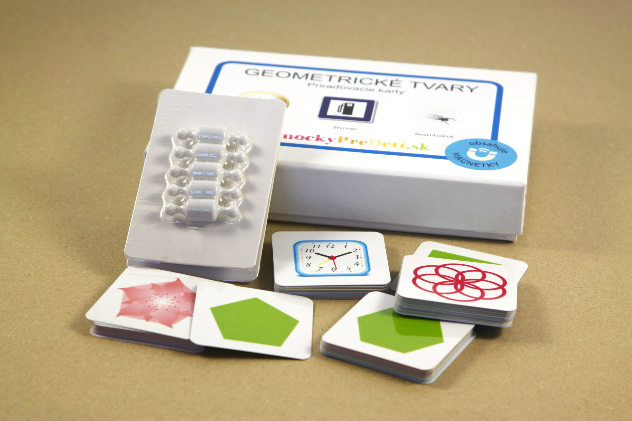 • 8 základných kariet s geometrickým tvarom – kruh, štvorec, trojuholník, obdĺžnik, lichobežník, päťuholník, šesťuholník, elipsa