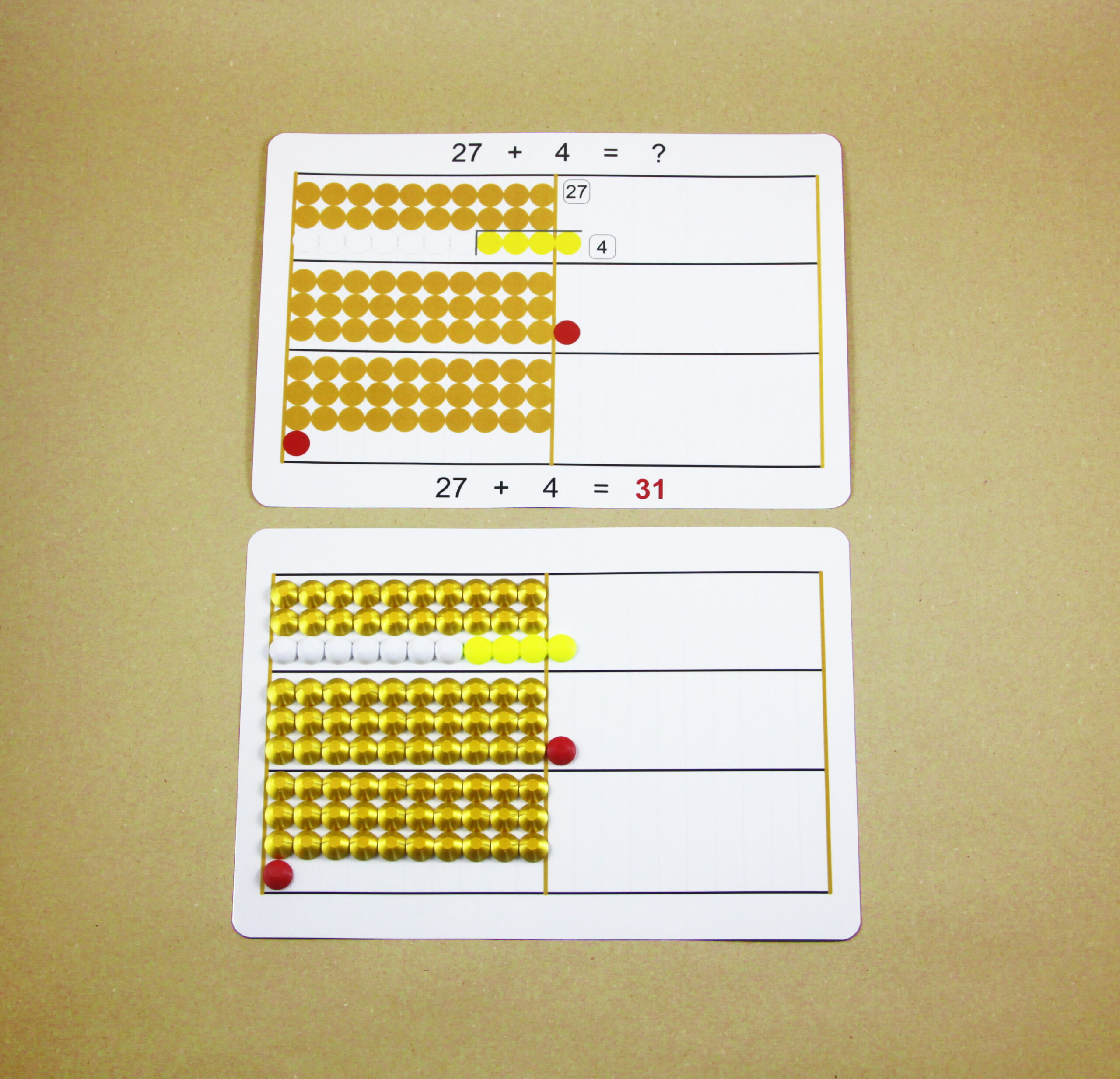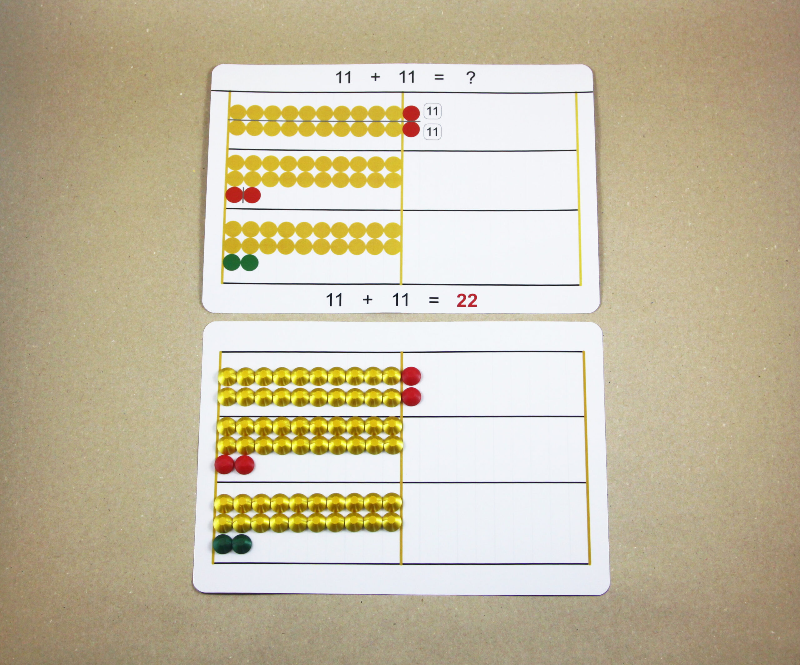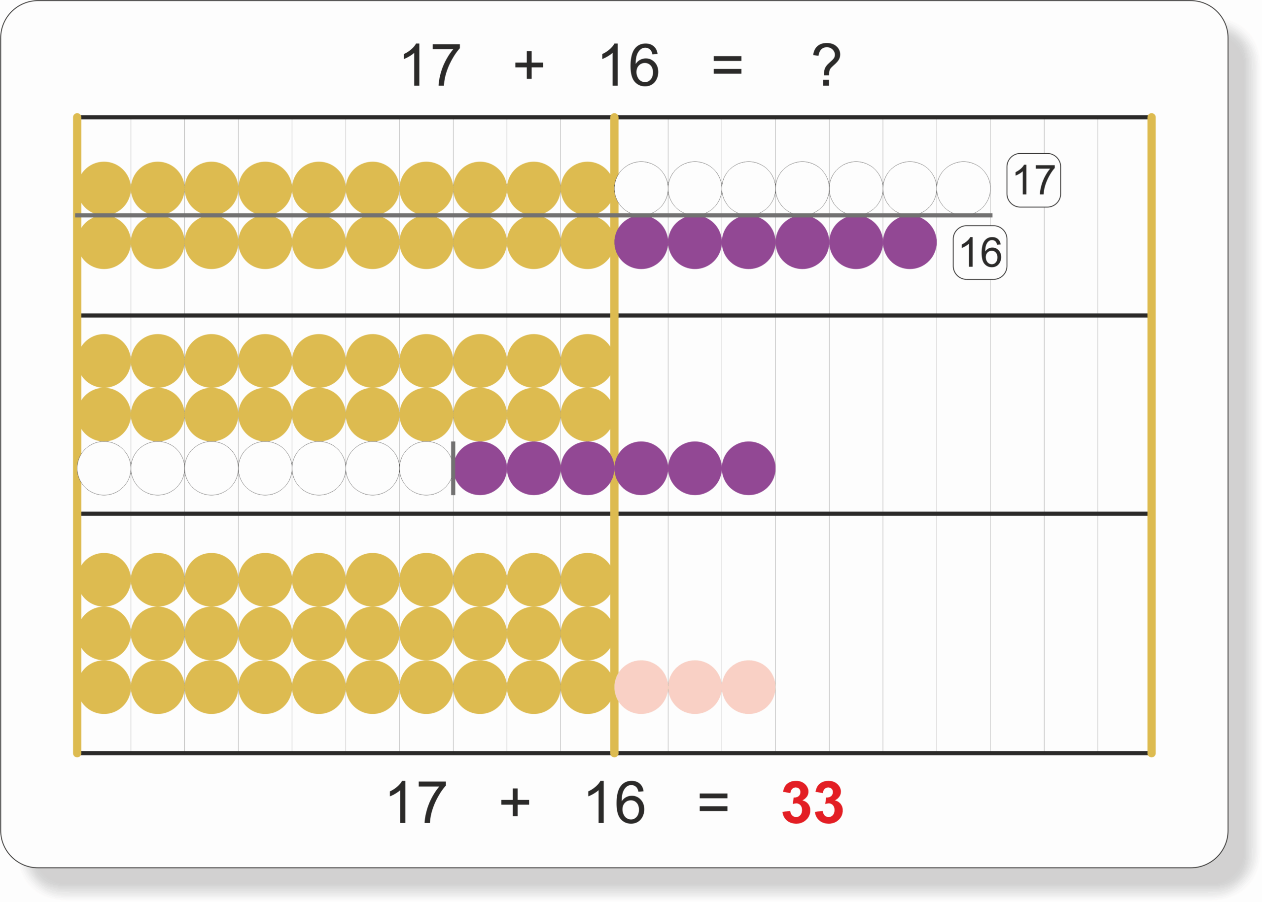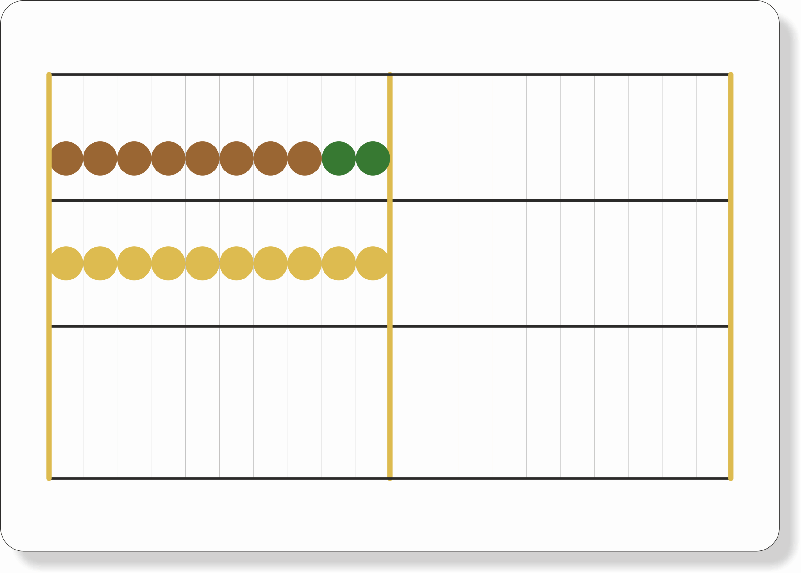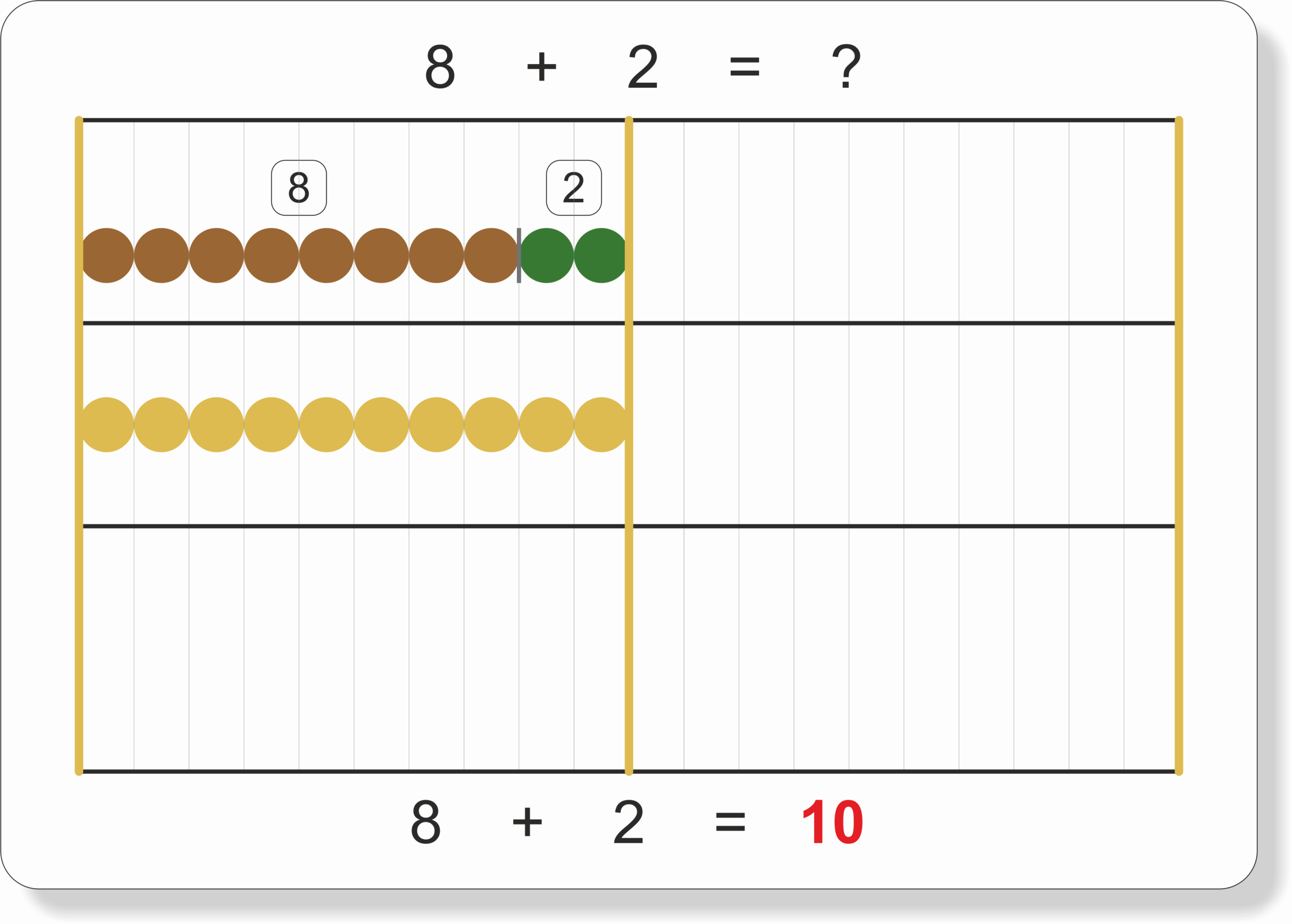 Na základnej karte je zobrazená mriežka, ktorá uľahčuje riešenie úlohy a posilňuje pochopenie prechodu cez desiatky. Hrubé horizontálne čierne čiary oddeľujú jednotlivé fázy riešenia úlohy. Tenké zvislé sivé čiary oddeľujú jednotky a hrubé zvislé zlaté čiary oddeľujú desiatky.