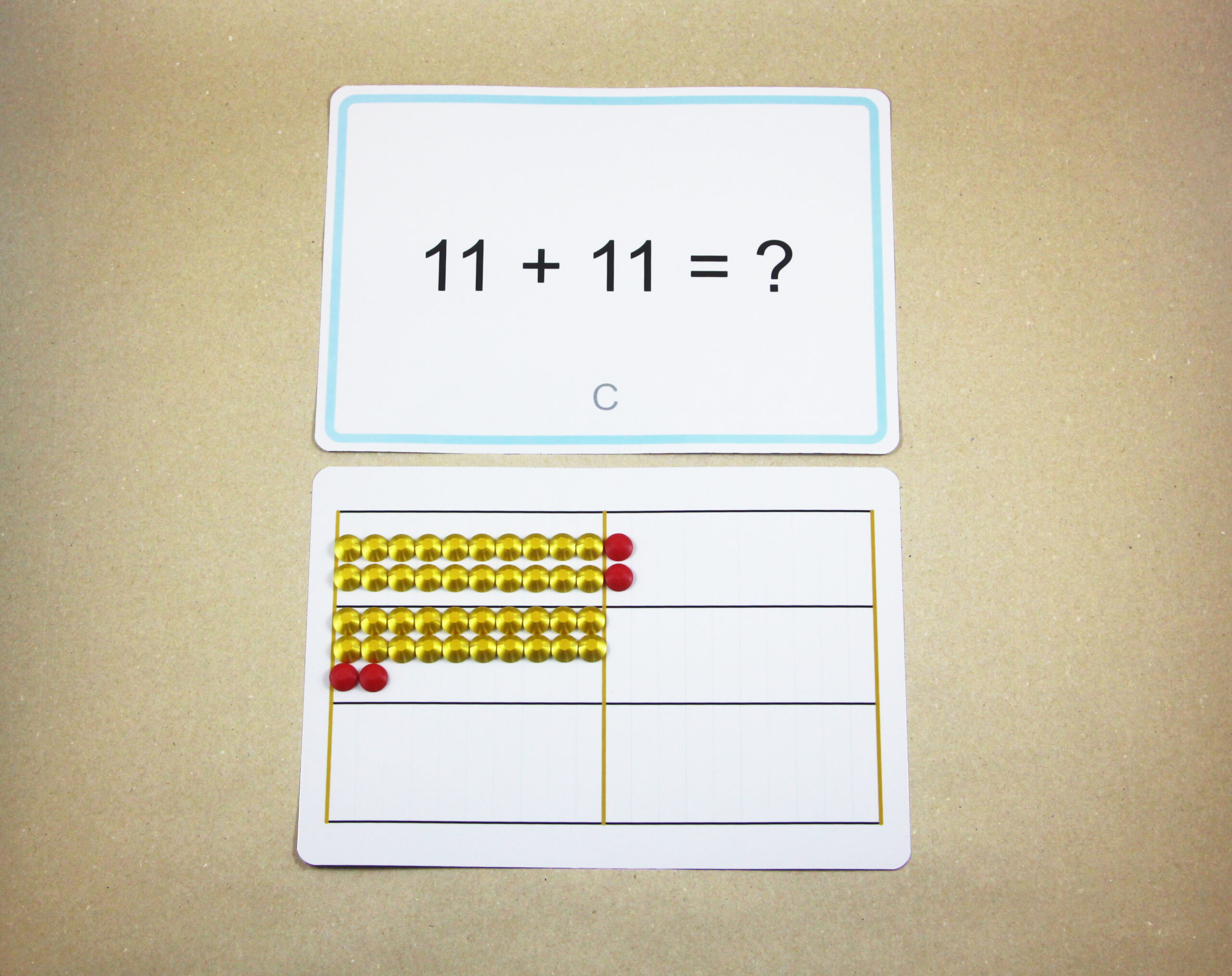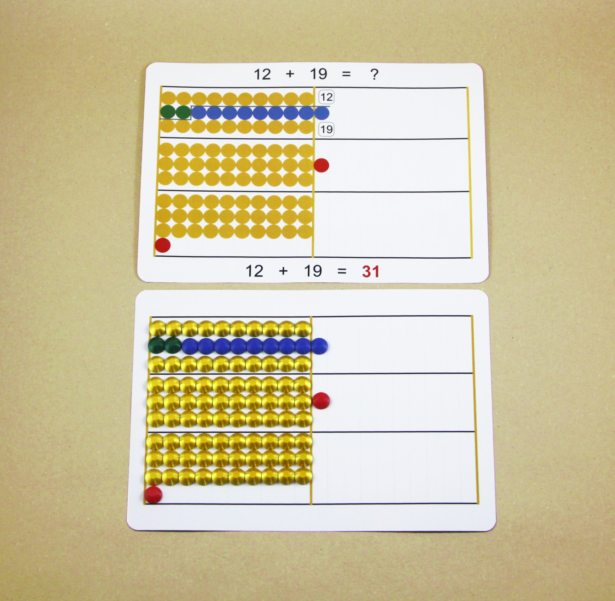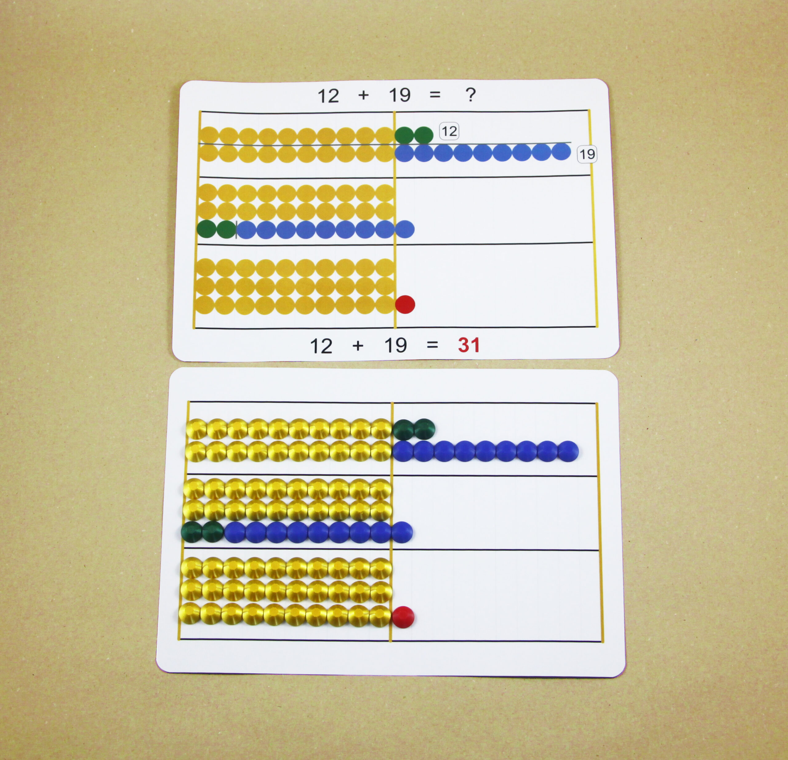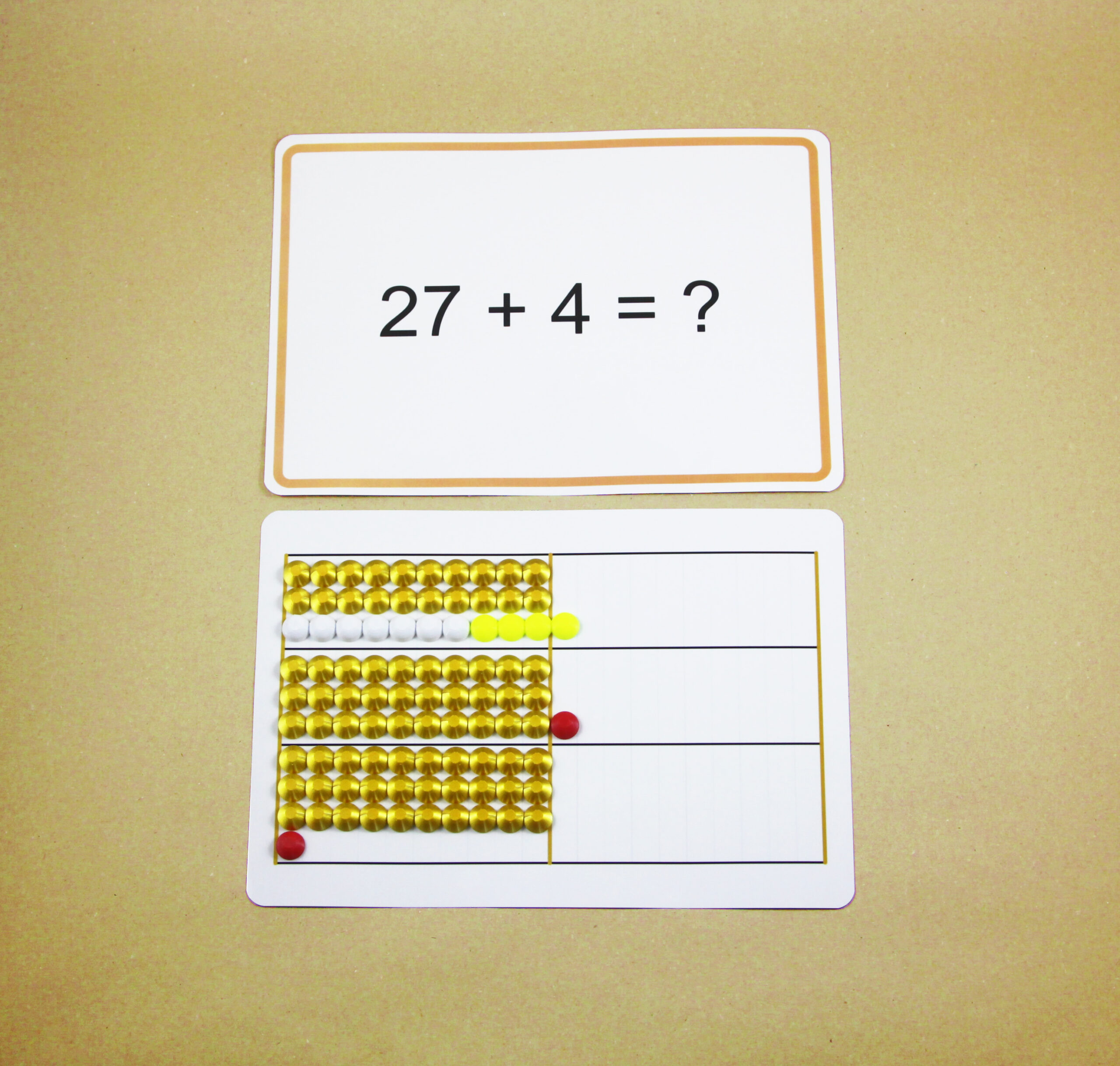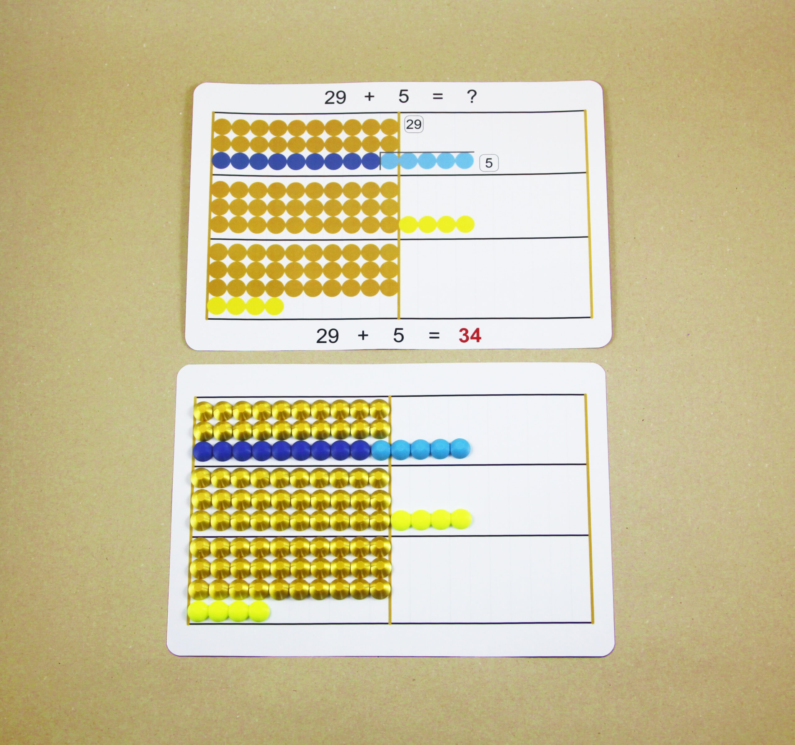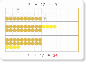 Na základnej karte je zobrazená mriežka, ktorá uľahčuje riešenie úlohy a posilňuje pochopenie prechodu cez desiatky. Hrubé horizontálne čierne čiary oddeľujú jednotlivé fázy riešenia úlohy. Tenké zvislé sivé čiary oddeľujú jednotky a hrubé zvislé zlaté čiary oddeľujú desiatky.