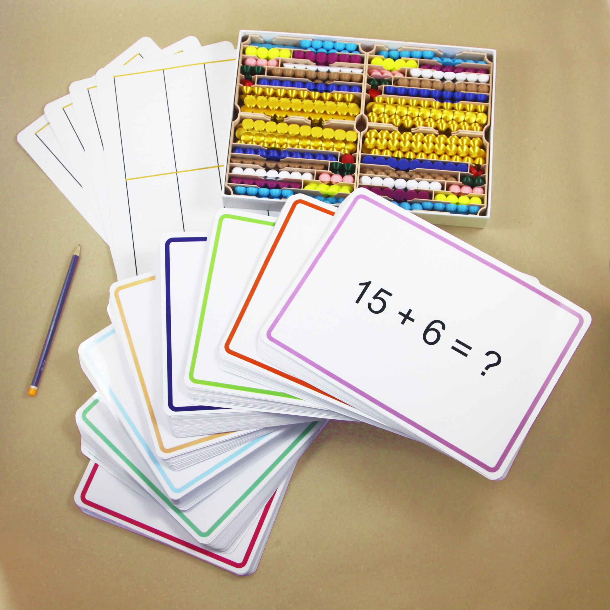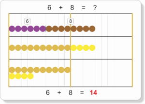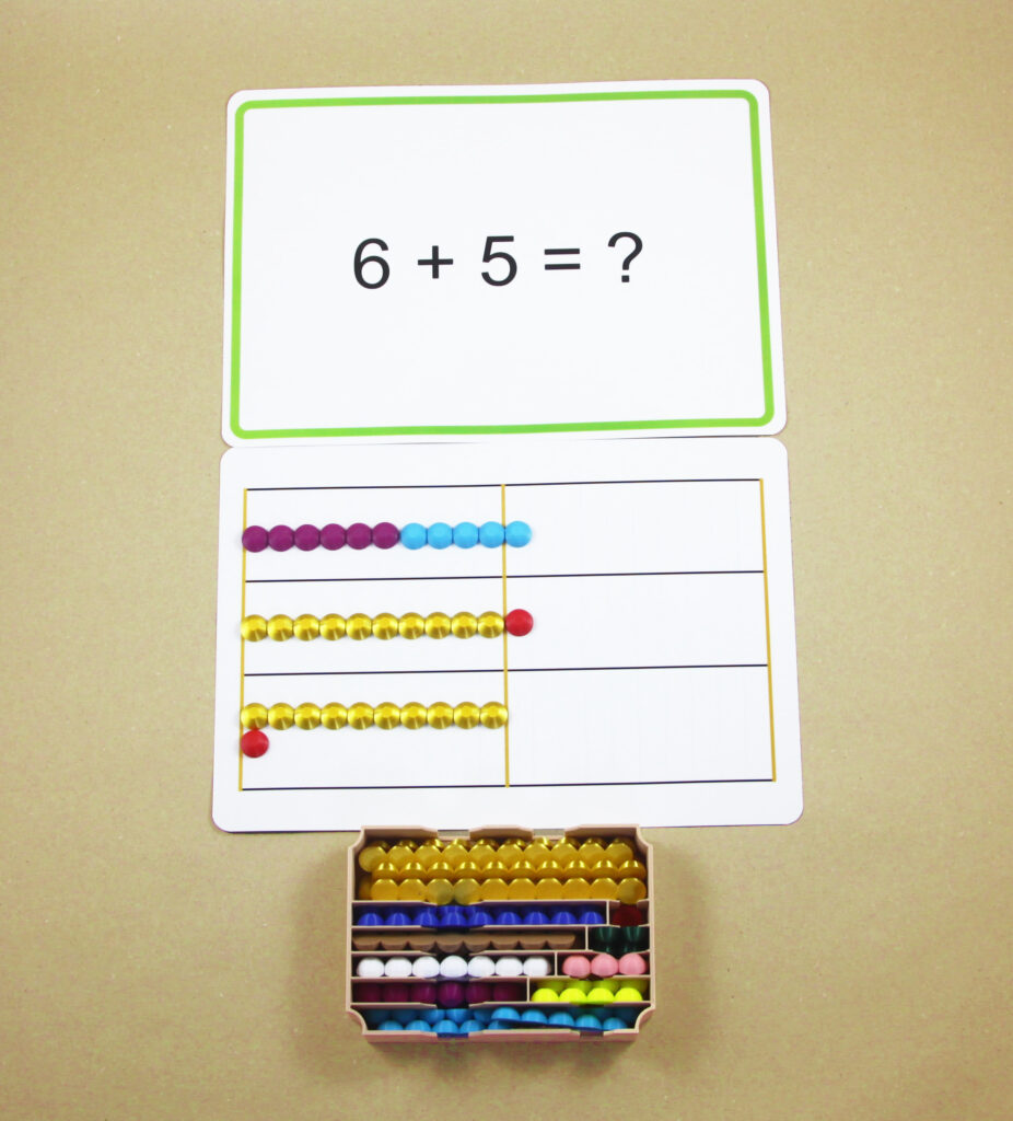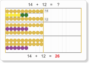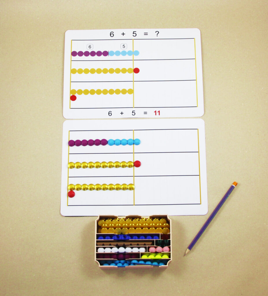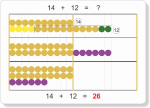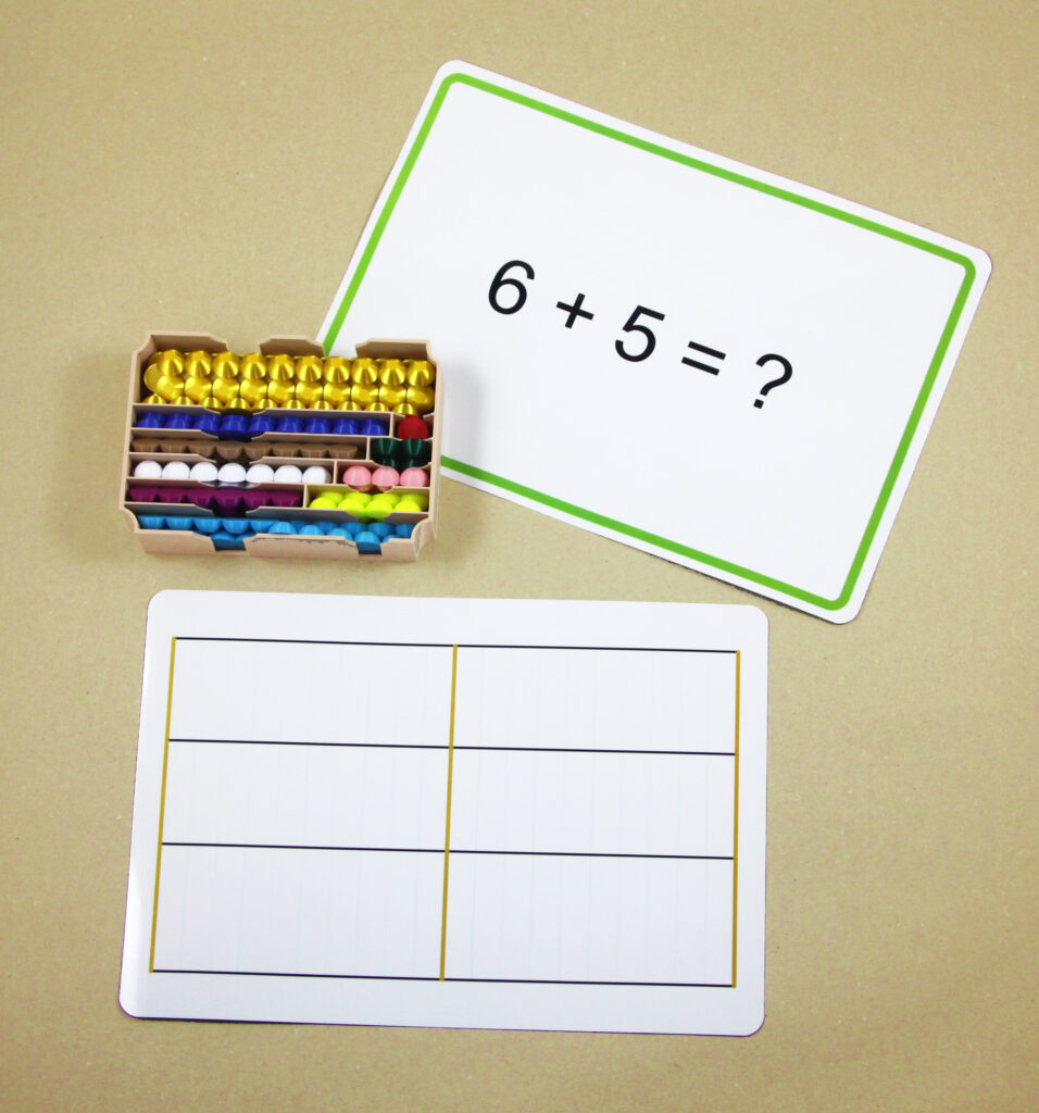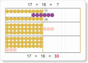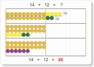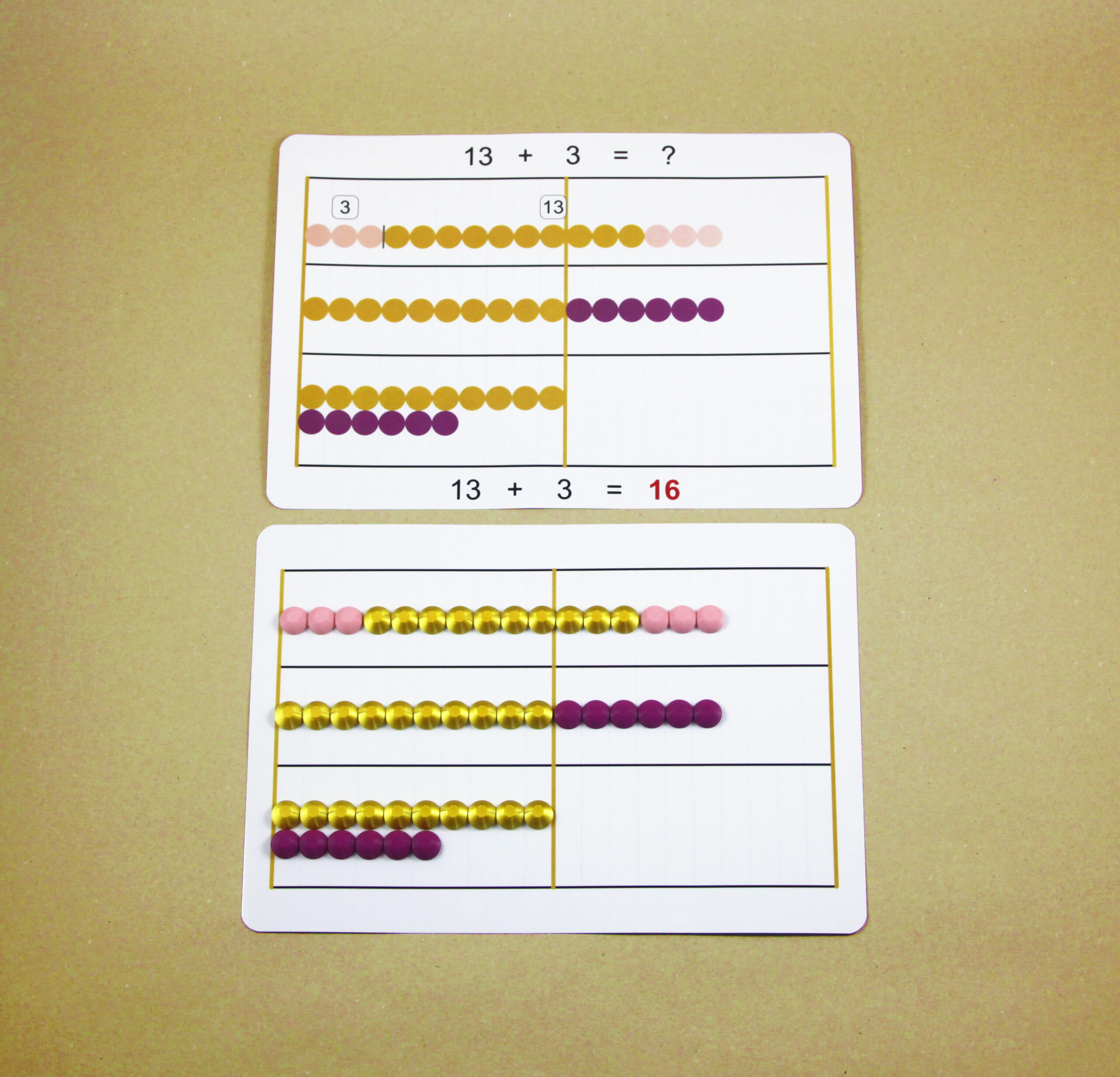 Na základnej karte je zobrazená mriežka, ktorá uľahčuje riešenie úlohy a posilňuje pochopenie prechodu cez desiatky. Hrubé horizontálne čierne čiary oddeľujú jednotlivé fázy riešenia úlohy. Tenké zvislé sivé čiary oddeľujú jednotky a hrubé zvislé zlaté čiary oddeľujú desiatky.