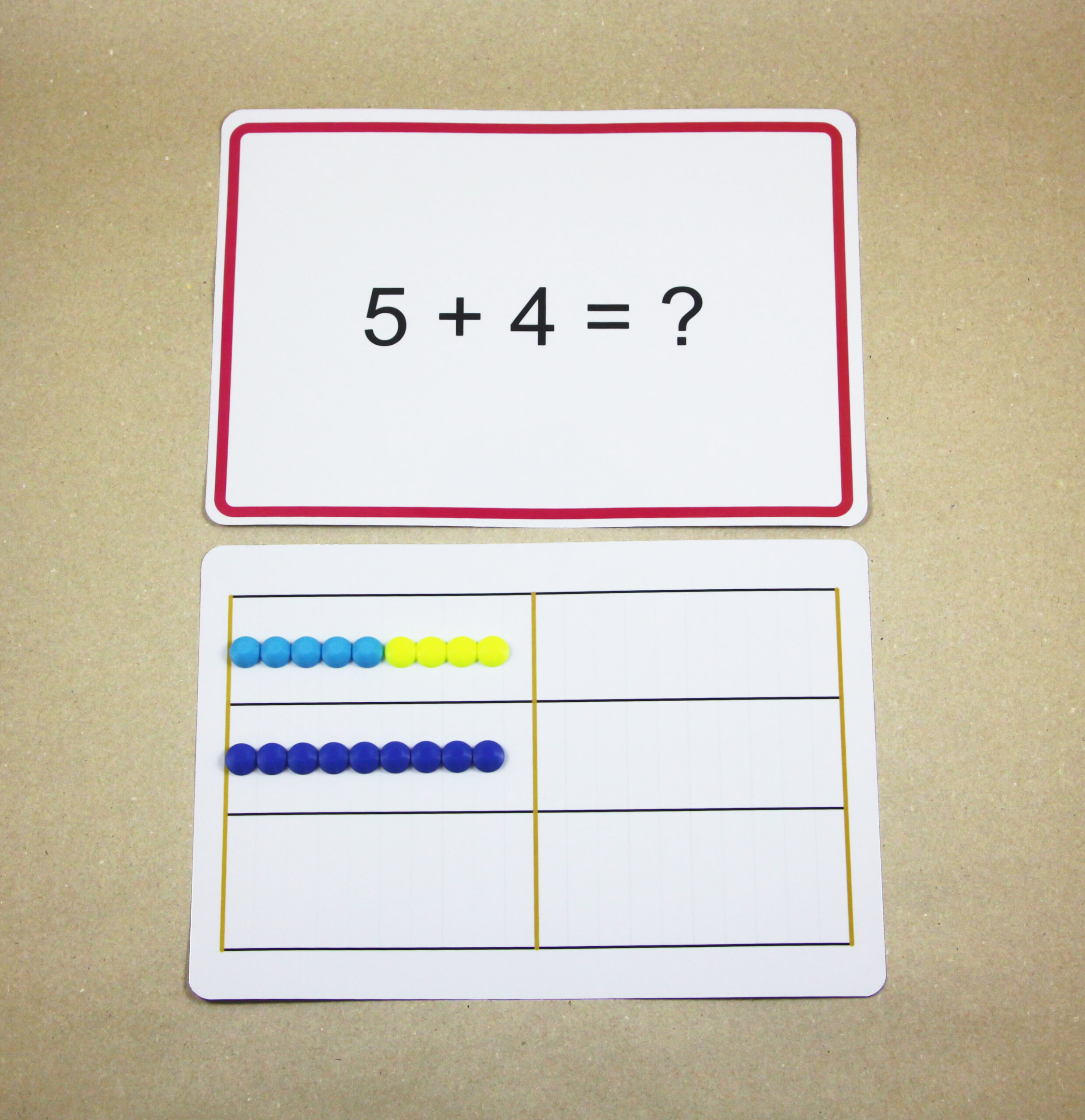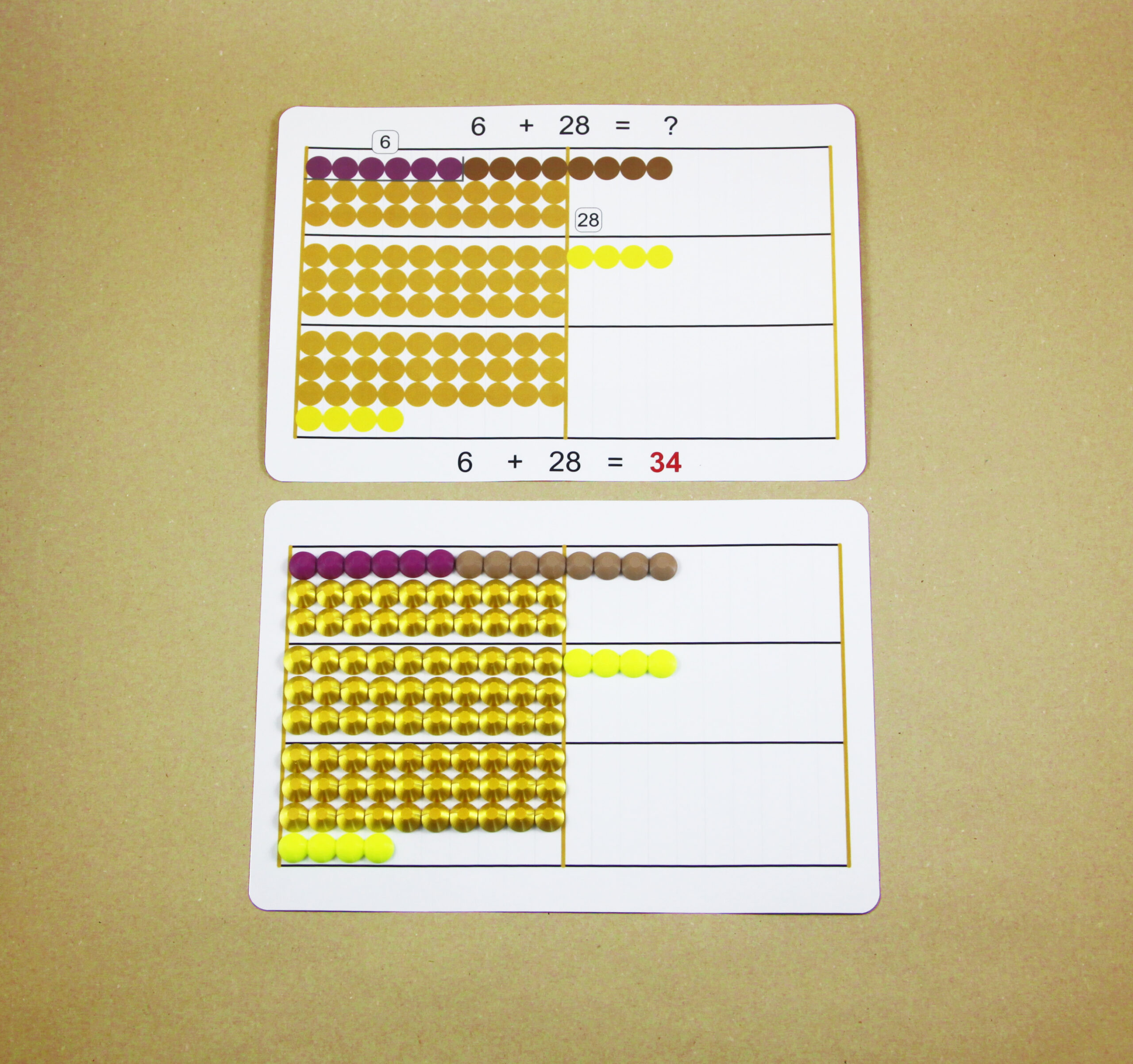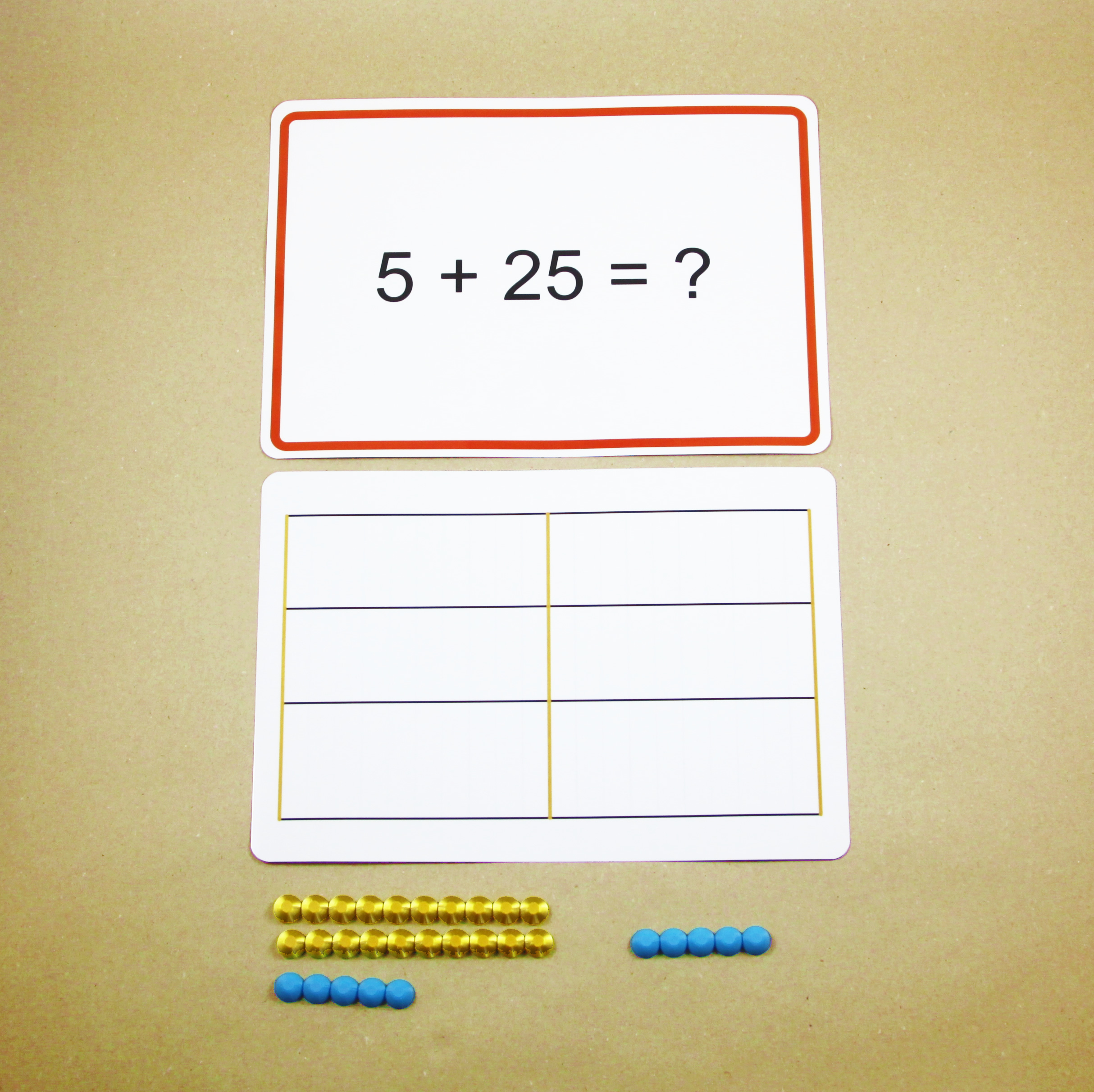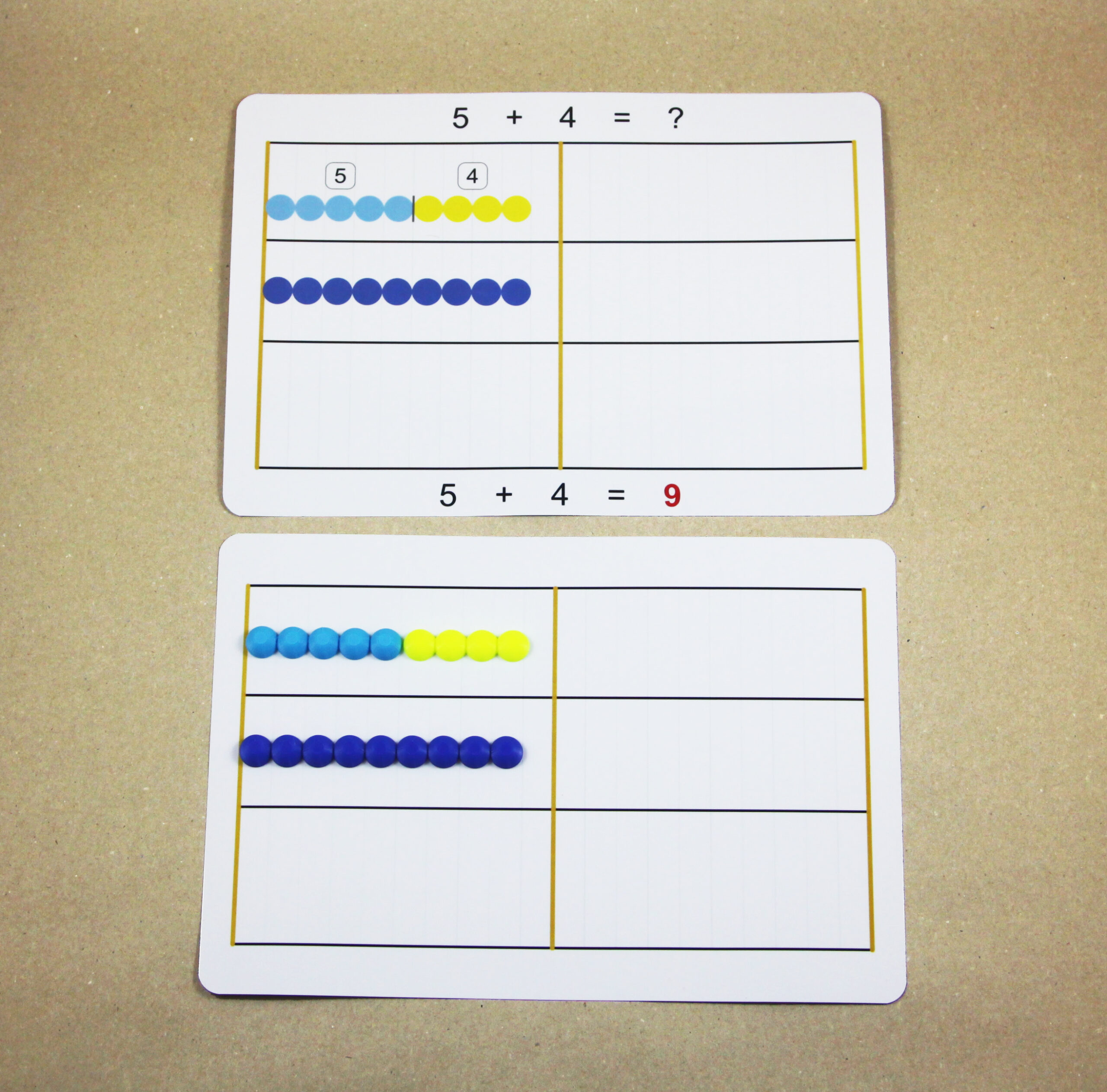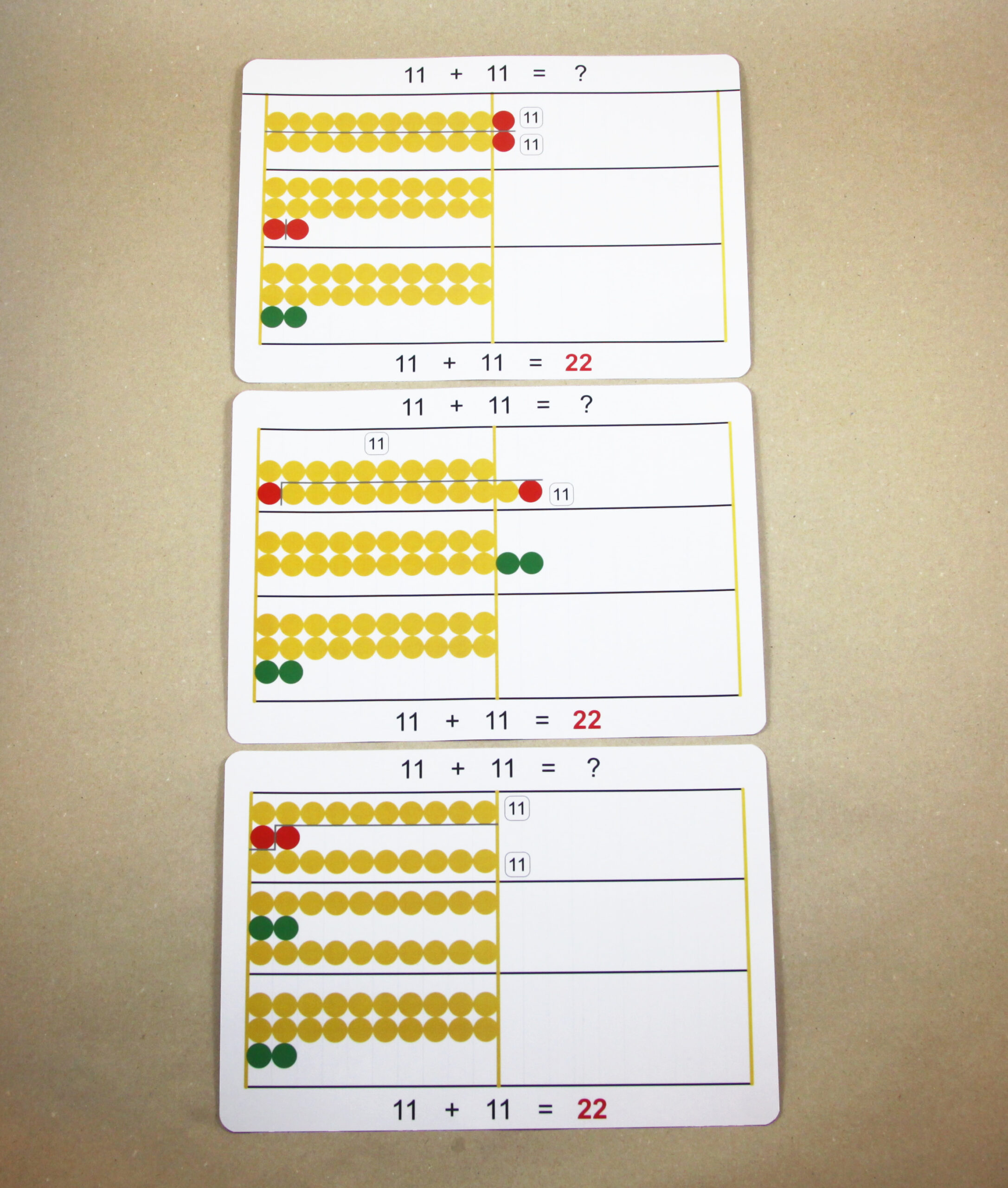 Deti znázorňujú zadanú úlohu na základnej karte pomocou farebných 3D modelov, teda postupne prikladajú farebné modely s príslušnými počtami, čím znázorňujú jednotlivé fázy sčítania, až kým sa nedopracujú k výsledku.