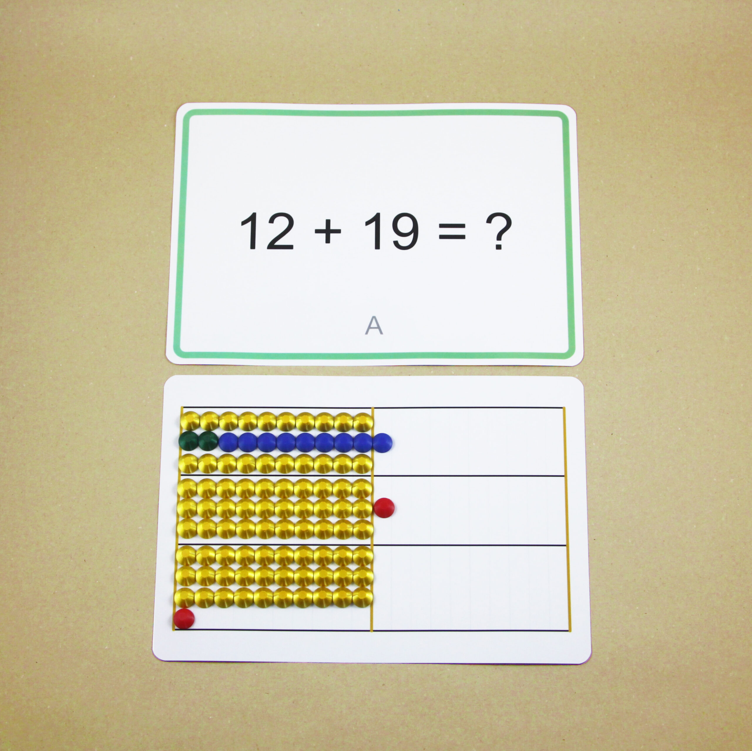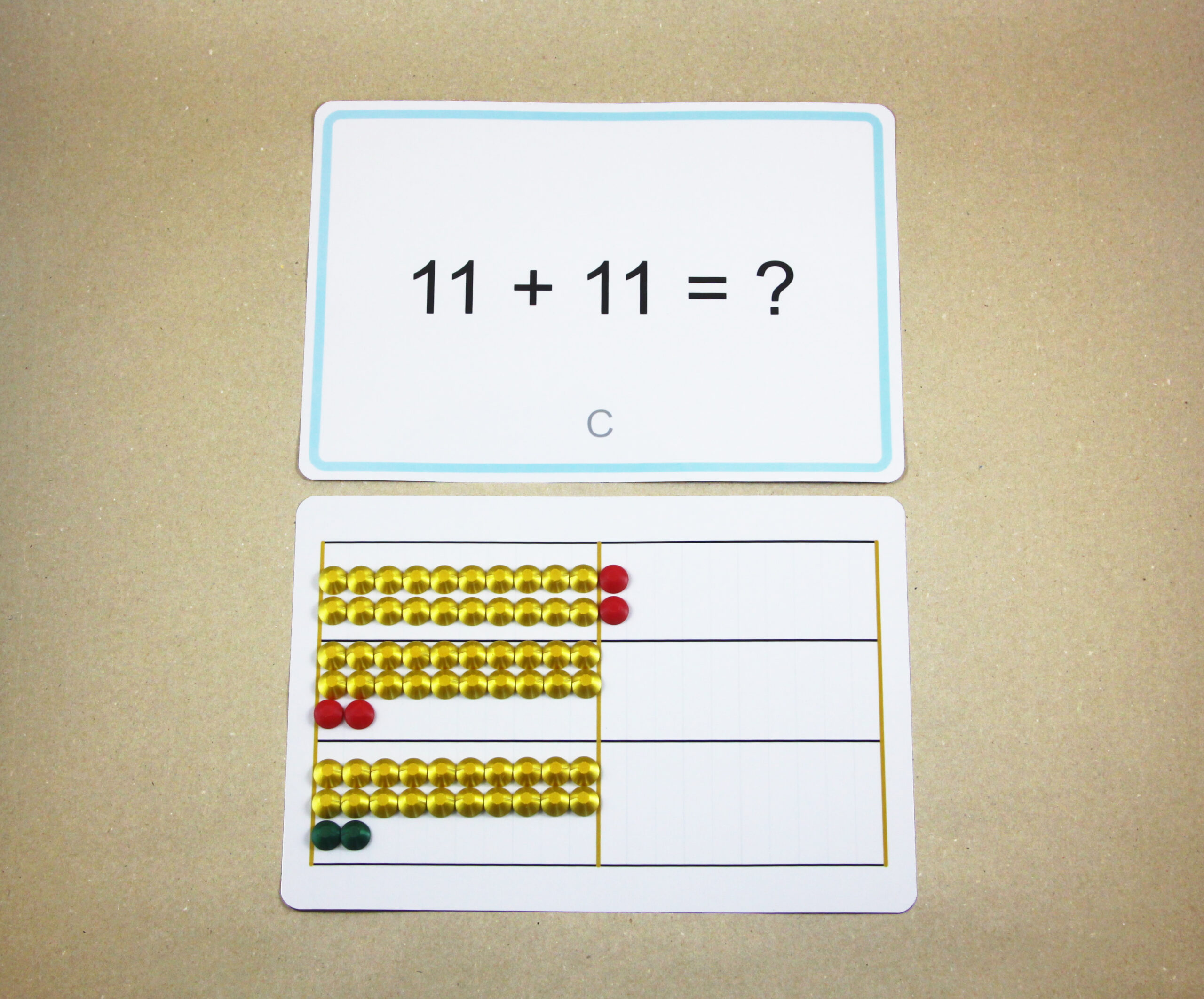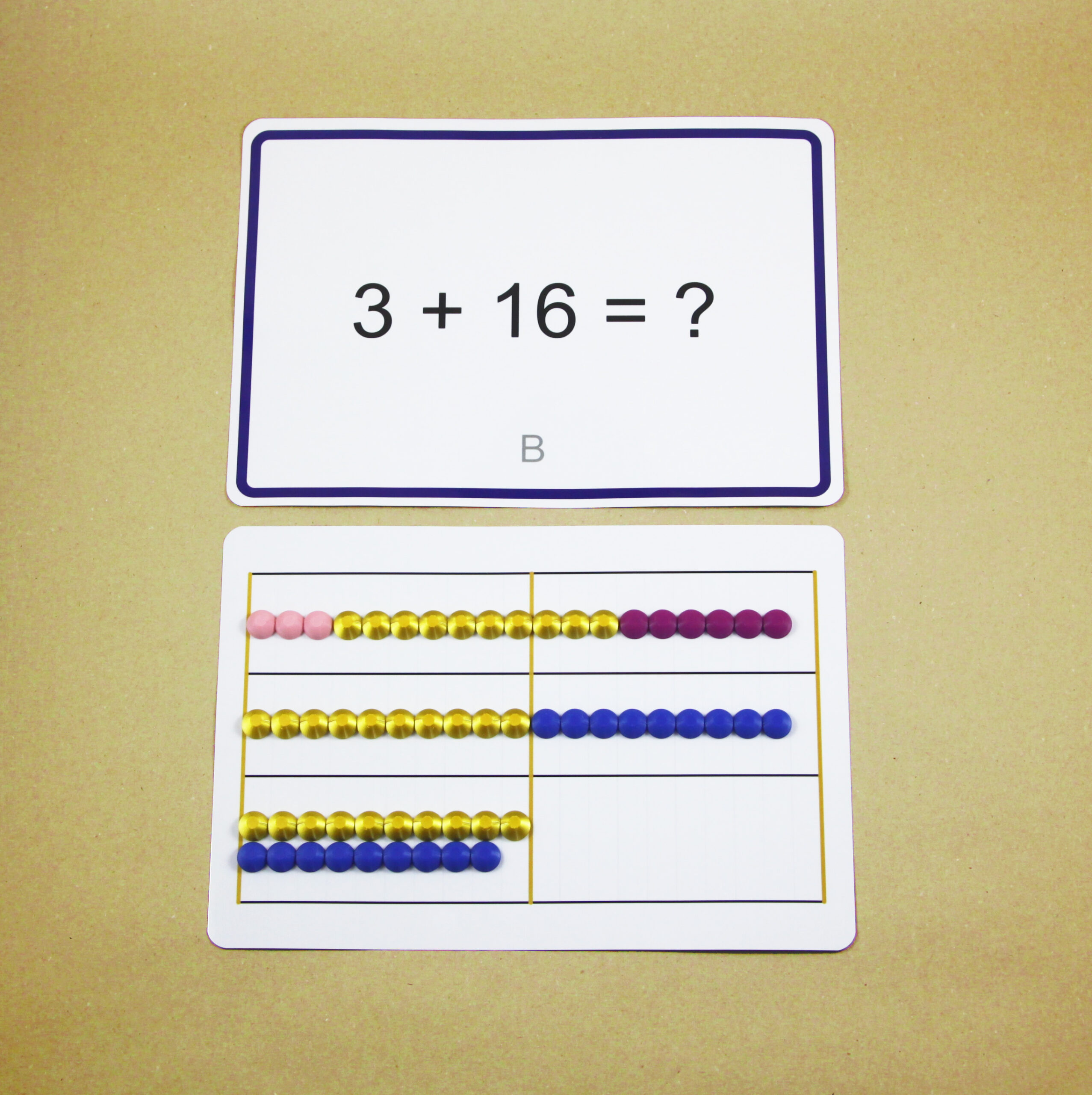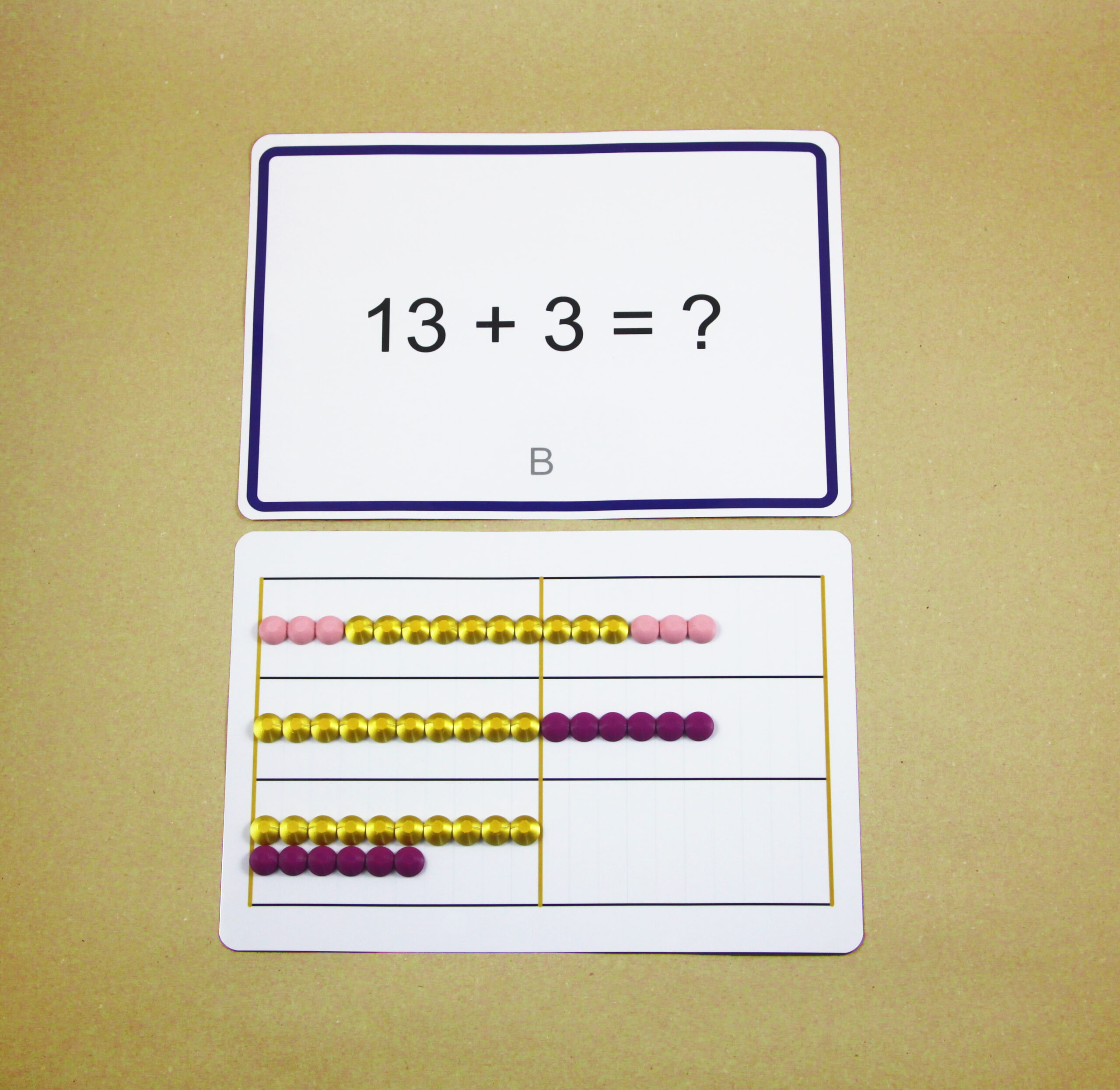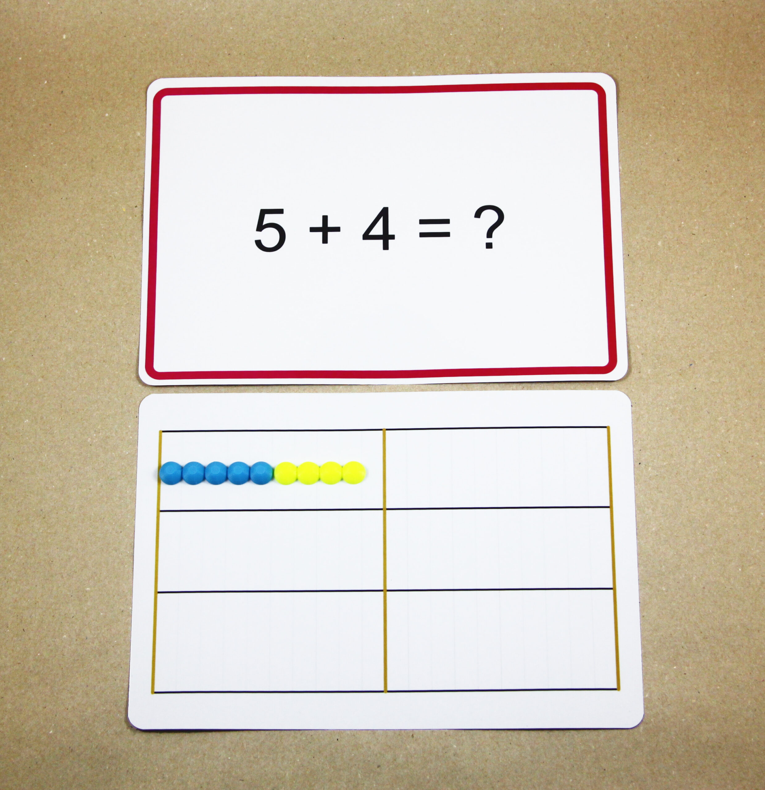 Deti znázorňujú zadanú úlohu na základnej karte pomocou farebných 3D modelov, teda postupne prikladajú farebné modely s príslušnými počtami, čím znázorňujú jednotlivé fázy sčítania, až kým sa nedopracujú k výsledku.