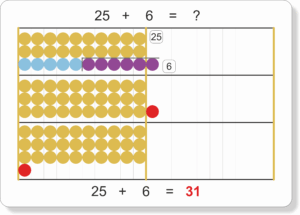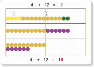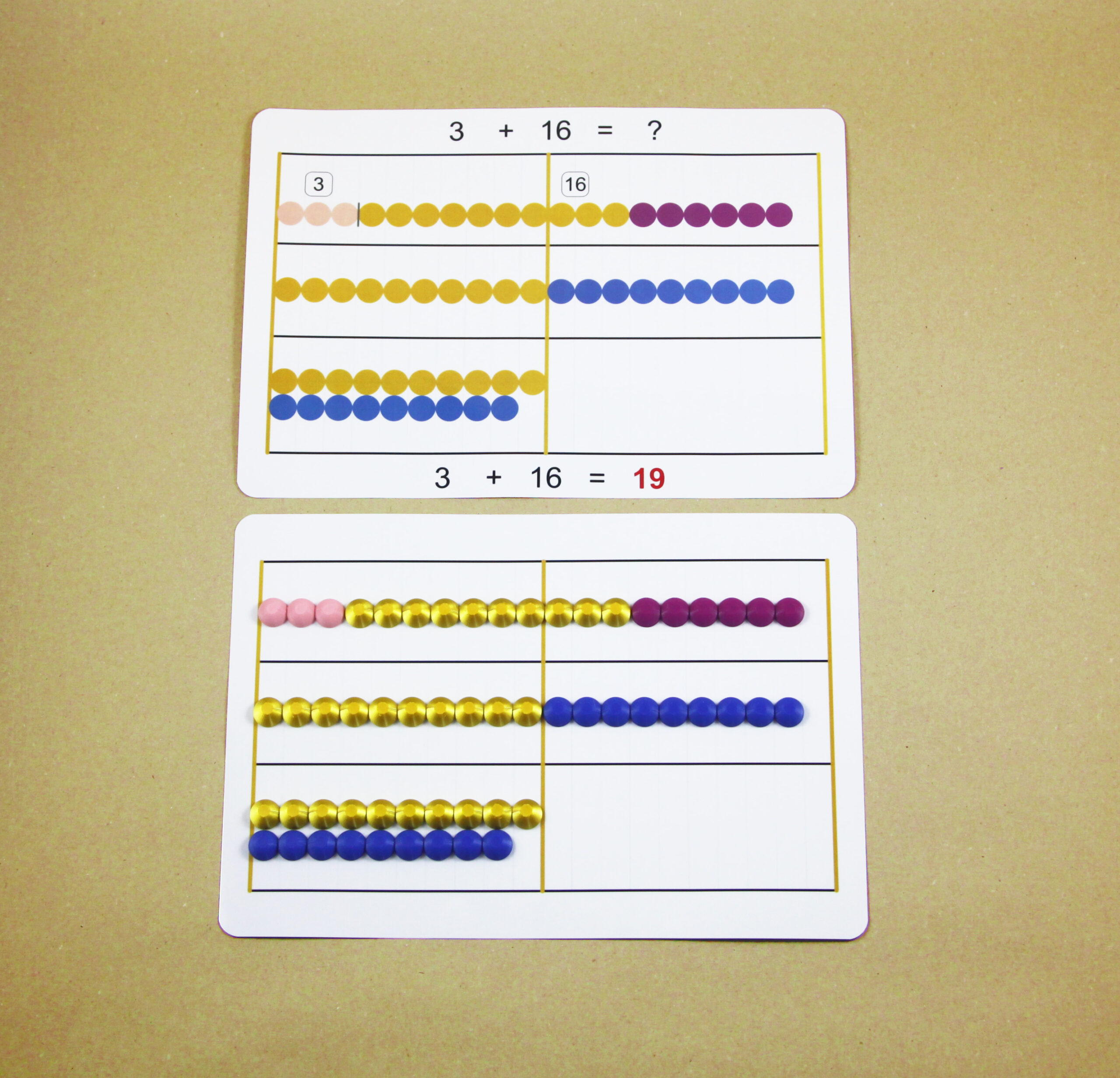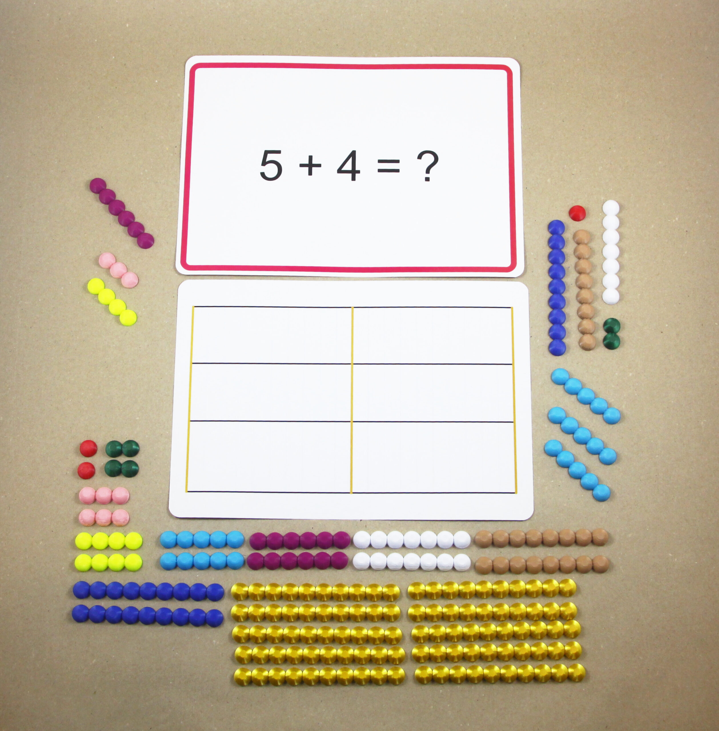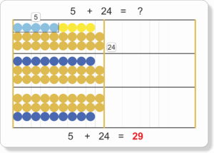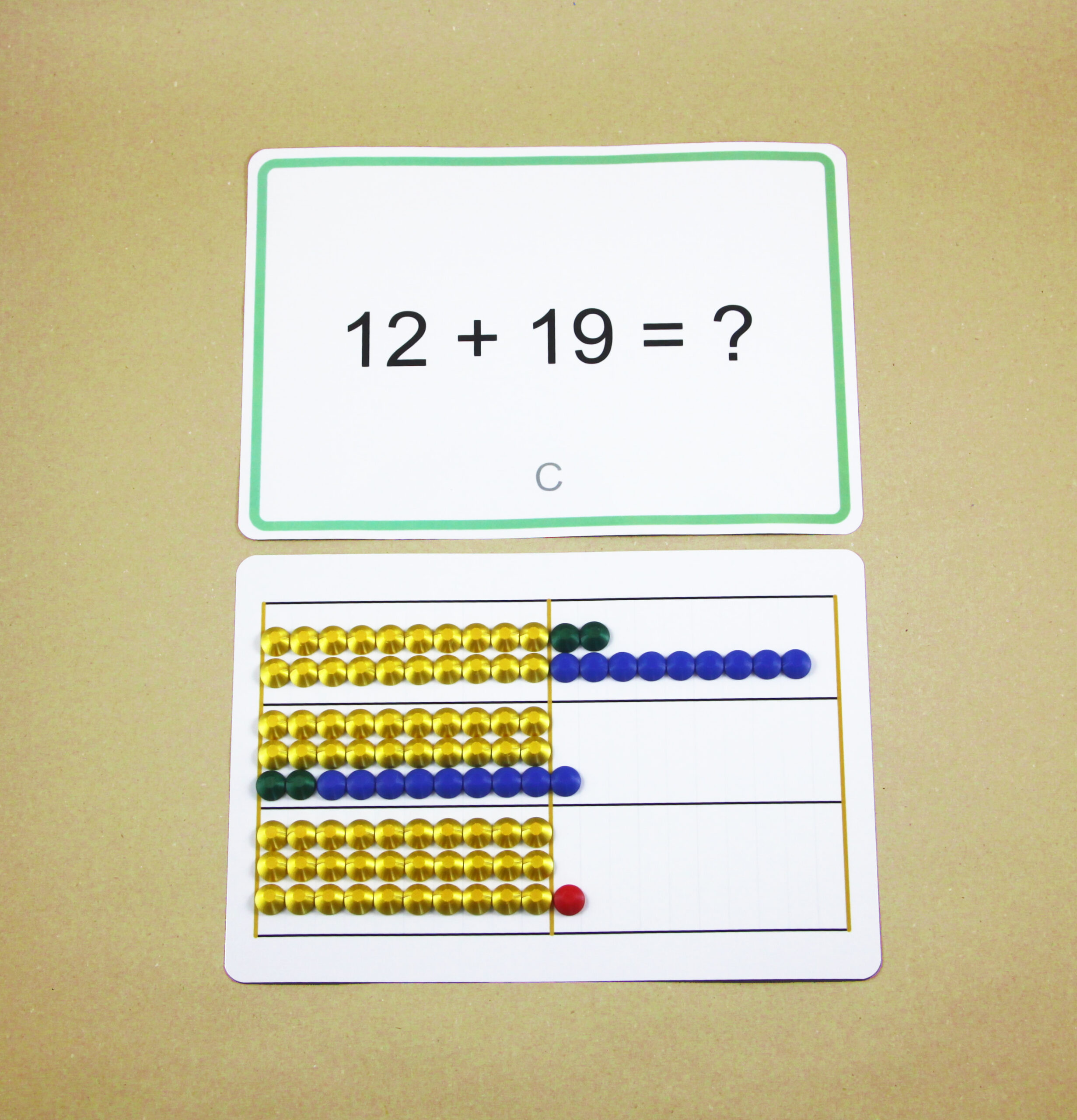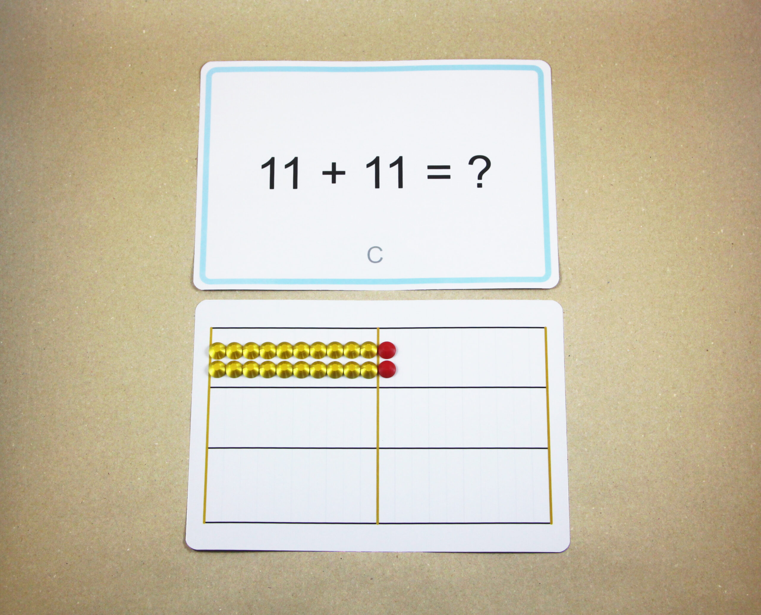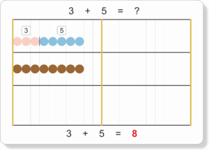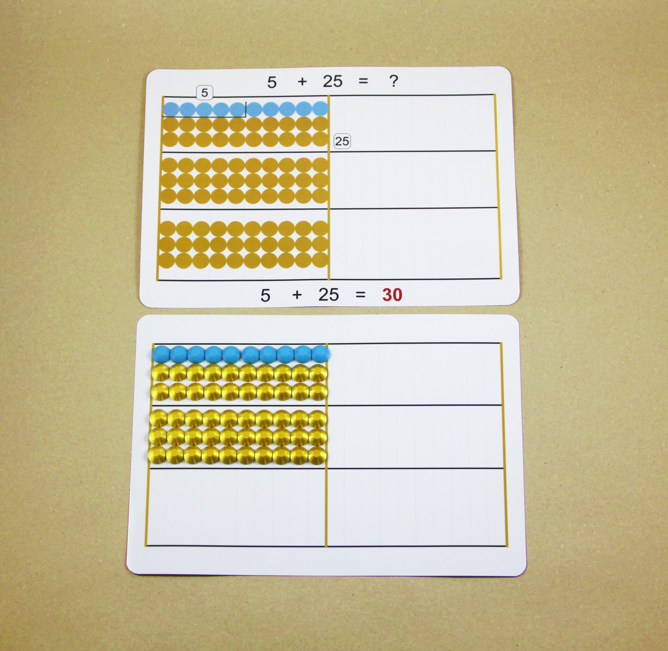 Deti znázorňujú zadanú úlohu na základnej karte pomocou farebných 3D modelov, teda postupne prikladajú farebné modely s príslušnými počtami, čím znázorňujú jednotlivé fázy sčítania, až kým sa nedopracujú k výsledku.