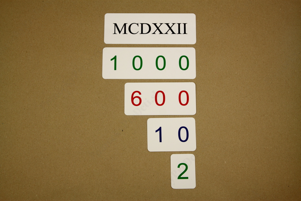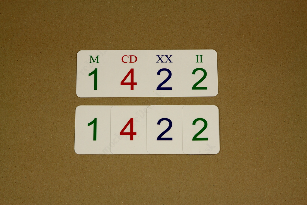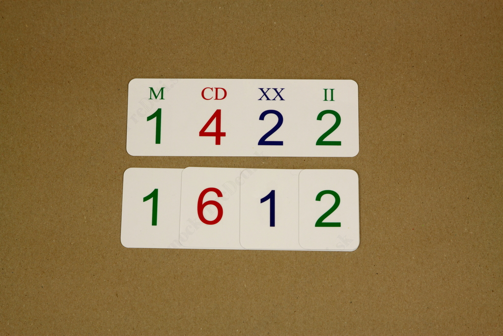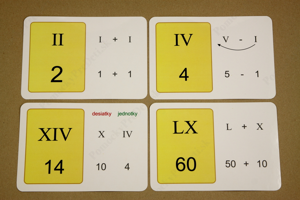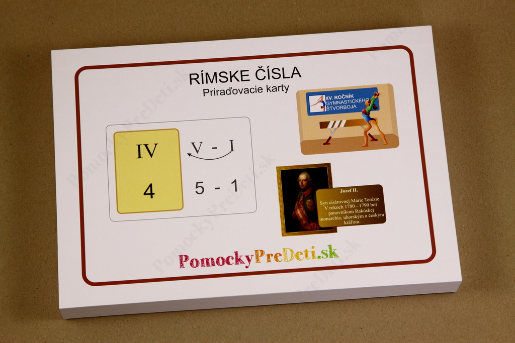 Výukové karty deťom sprístupňujú históriu vzniku rímskych čísel a princíp ich zápisu. Účelom priraďovacích kariet je následný tréning prevodu rímskych čísel na arabské čísla. Karty obsahujú jednoduché príklady až po zložitejšie trojciferné a štvorciferné čísla. Súpravy kariet s farebne odlíšenými arabskými jednotkami, desiatkami, stovkami a tisíckami pomôžu deťom ľahšie rozčleniť rímske čísla na jednotlivé rády. Karty sú autokorekčné, umožňujú teda samostatnú kontrolu správnosti.