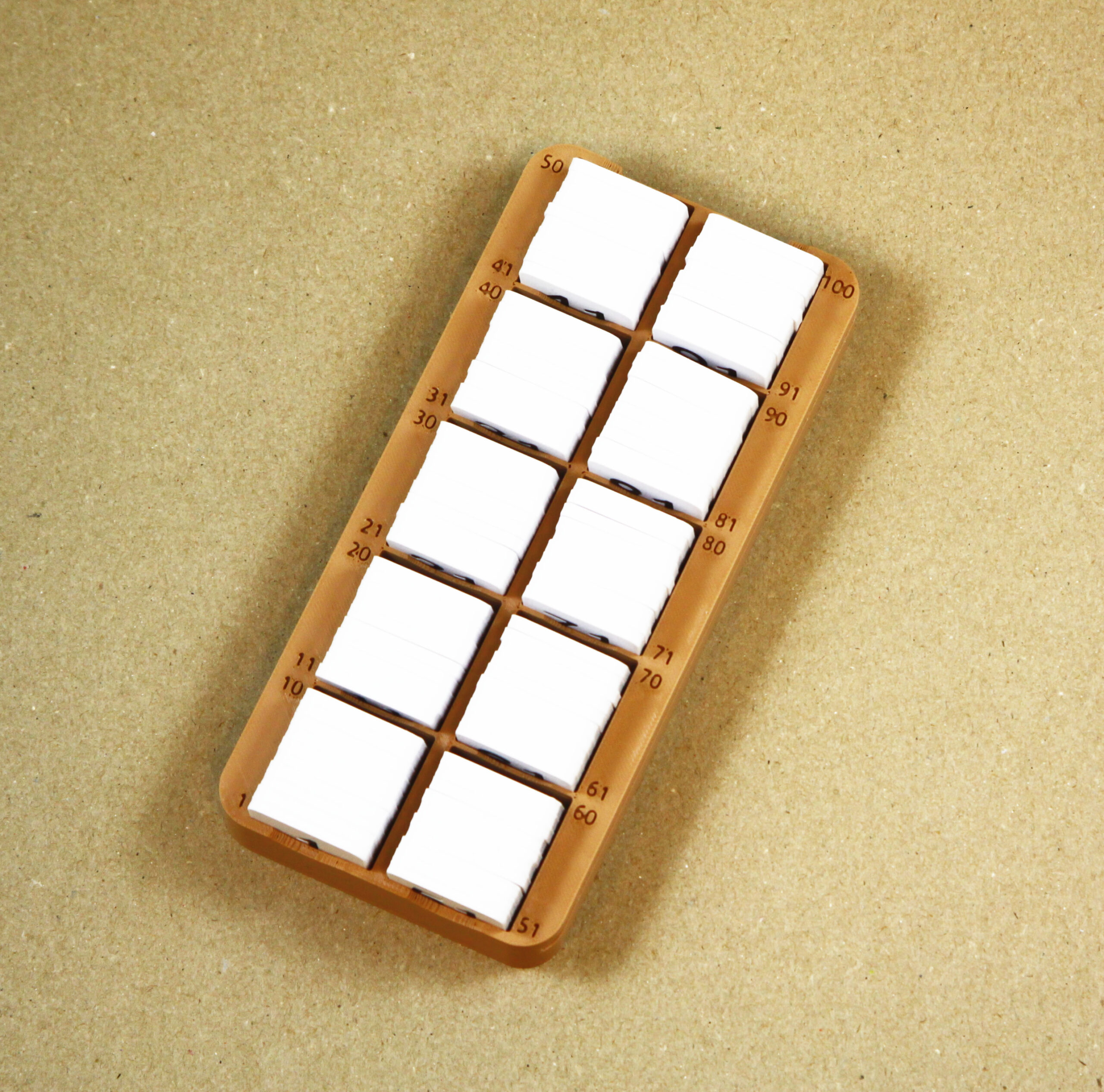 • Triediaci regálik na štvorčeky s číslami má desiatky označené intervalmi (napr. 1 – 10, 11 – 20 atď.), čo uľahčuje triedenie.