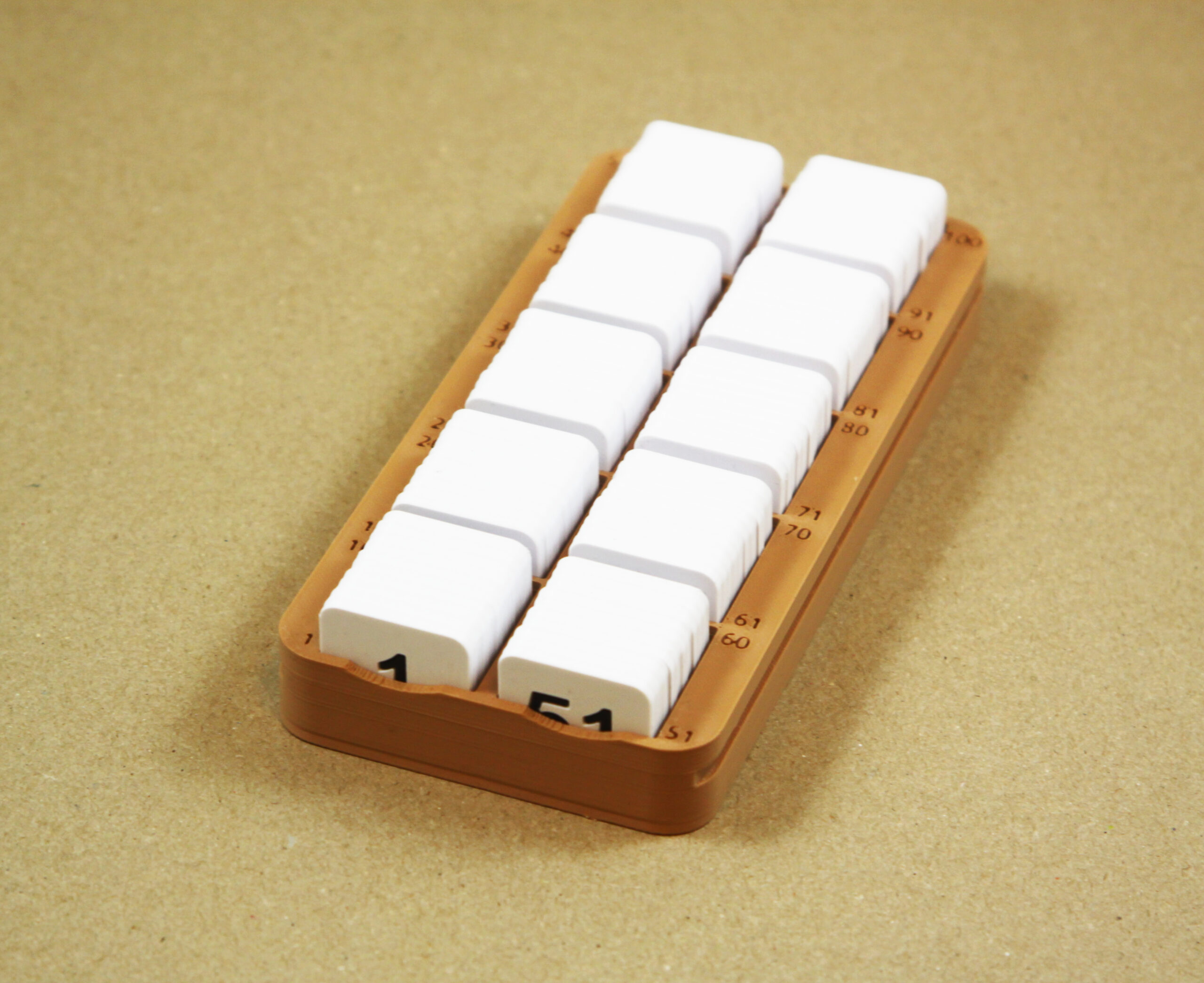 • Triediaci regálik na štvorčeky s číslami je uzatvárateľný, pri prenášaní pomôcky nehrozí rozsypanie a pomiešanie čísel, čo veľmi urýchľuje prípravu na prácu s pomôckou.