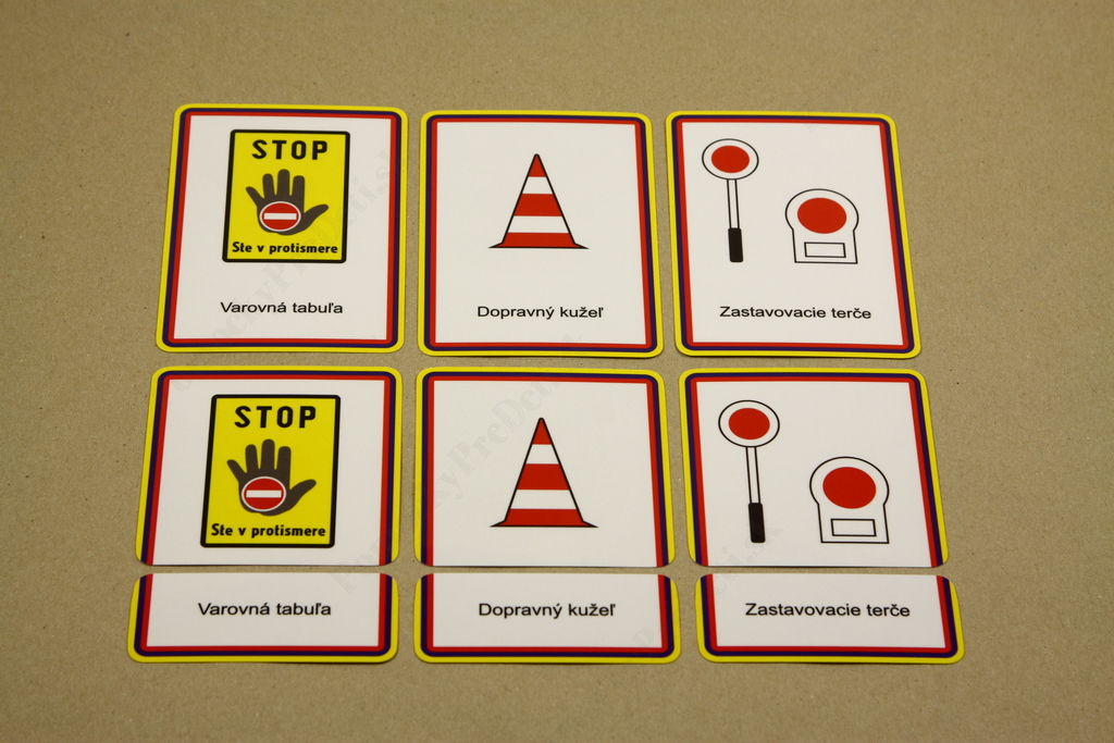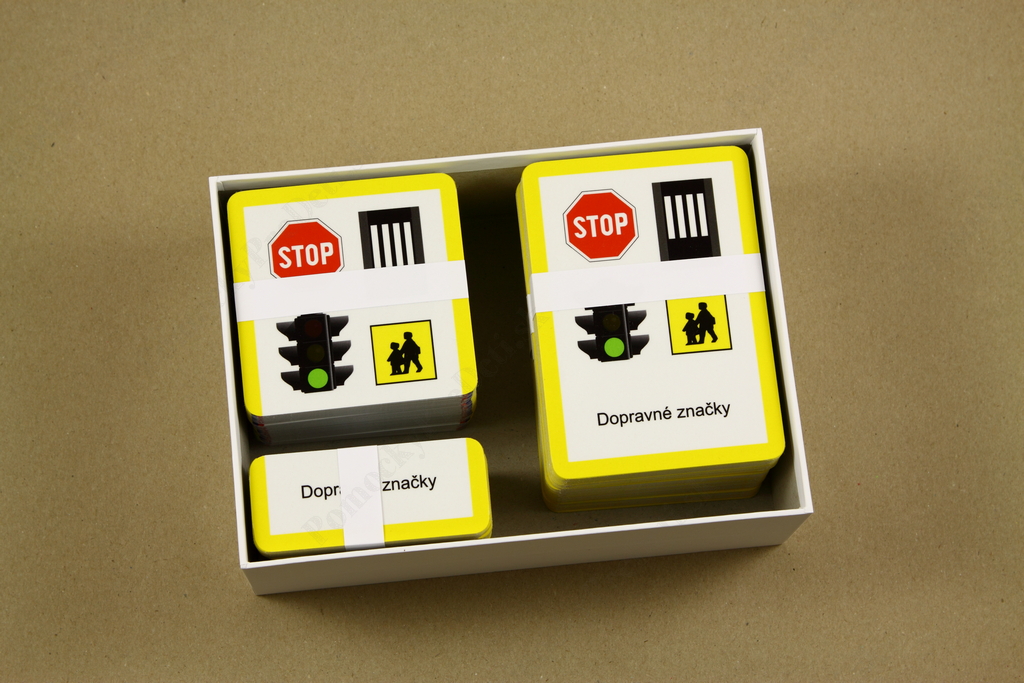 Prostredníctvom obrázkových a textových kariet deti spoznávajú jednotlivé dopravné značky. Úlohou detí je prikladať karty s názvom ku kartám s dopravnou značkou. Priložením tretej – kontrolnej karty si môžu samy overiť správnosť riešenia. Pomôcka teda plní poznávaciu funkciu, ale zároveň zábavnou formou zdokonaľuje čitateľské zručnosti.