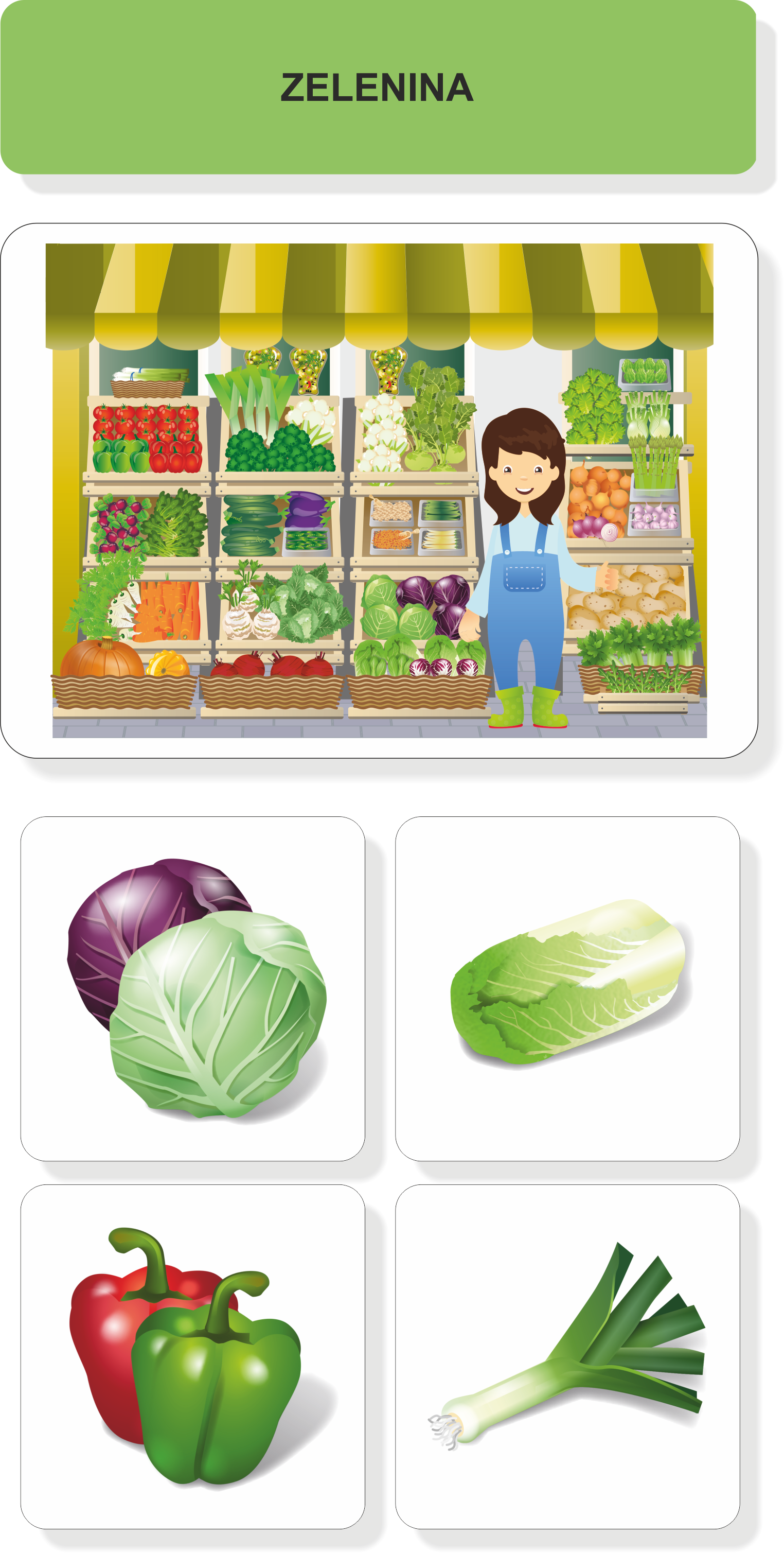 Zelenina – kapusta, kel, karfiol, brokolica, kaleráb, hlávkový šalát, špenát, čakanka, pekinská kapusta, čínska kapusta, rukola, mrkva, petržlen, zeler, cvikla, reďkovka, paradajka / rajčina, paprika, baklažán, uhorka, cuketa, tekvica, patizón, zemiak, cibuľa, cesnak, pór, jarná cibuľka, stonkový zeler, špargľa, hrach, fazuľa, cícer, šošovica, artičoka, fenikel, oliva