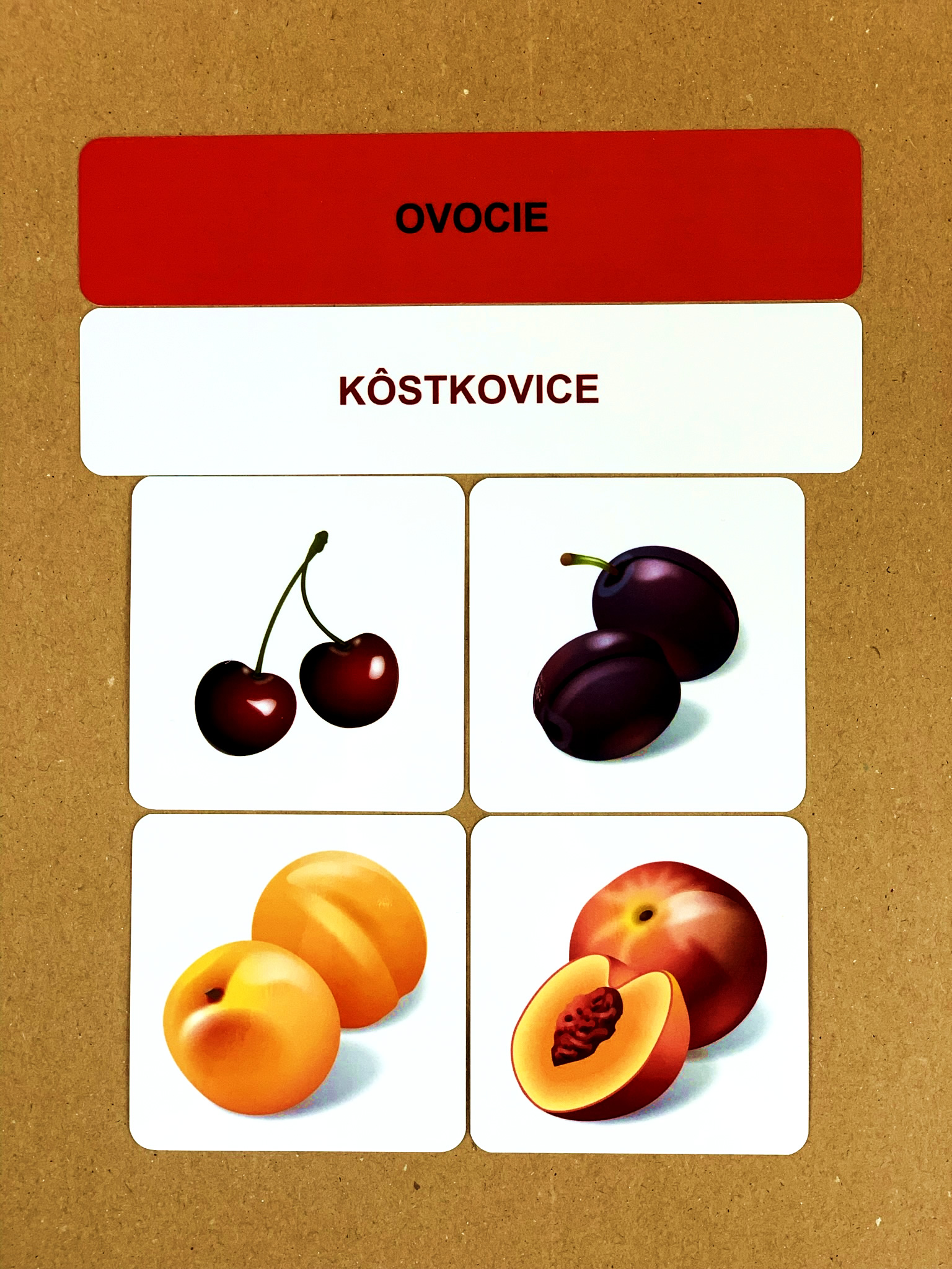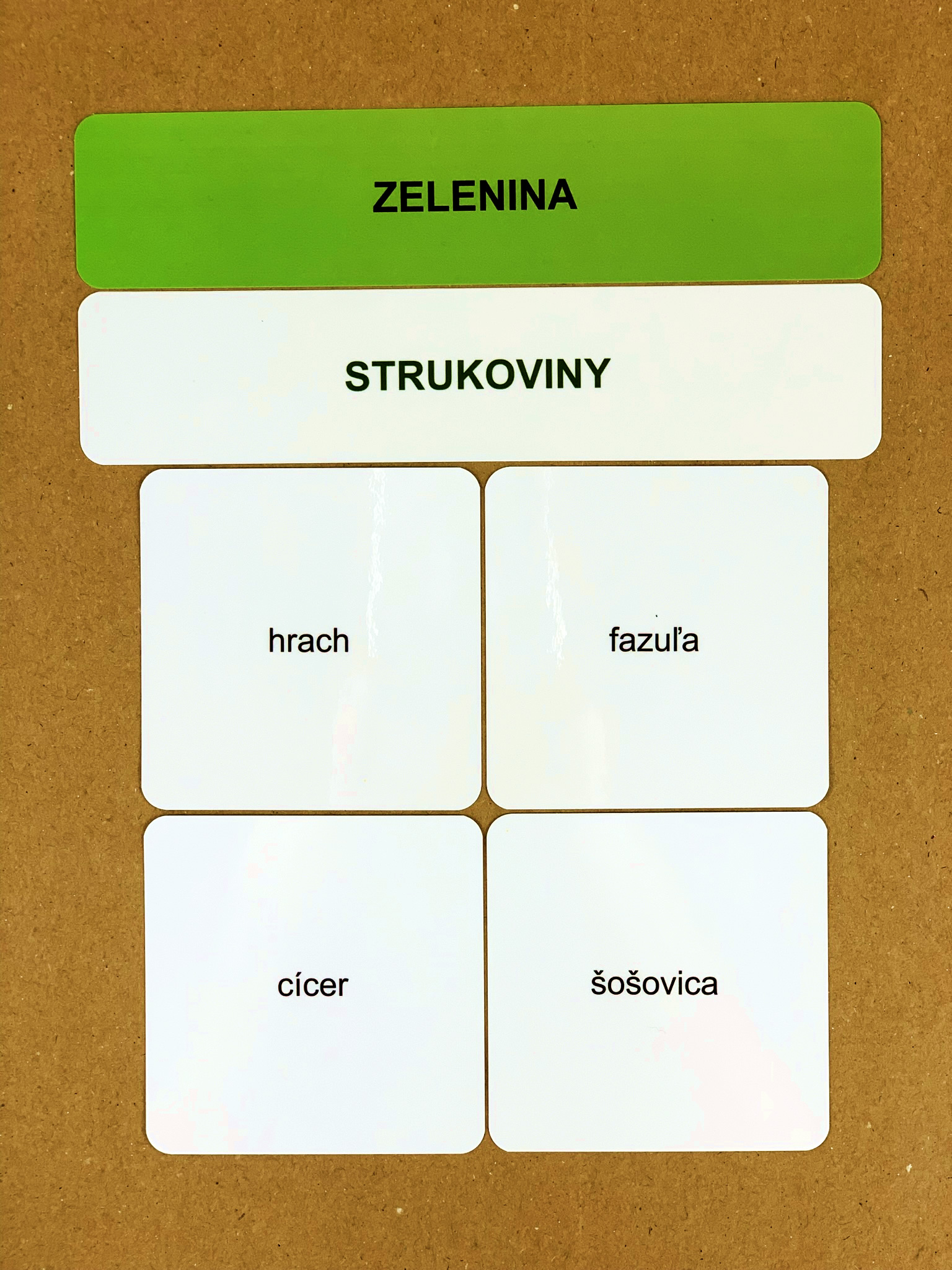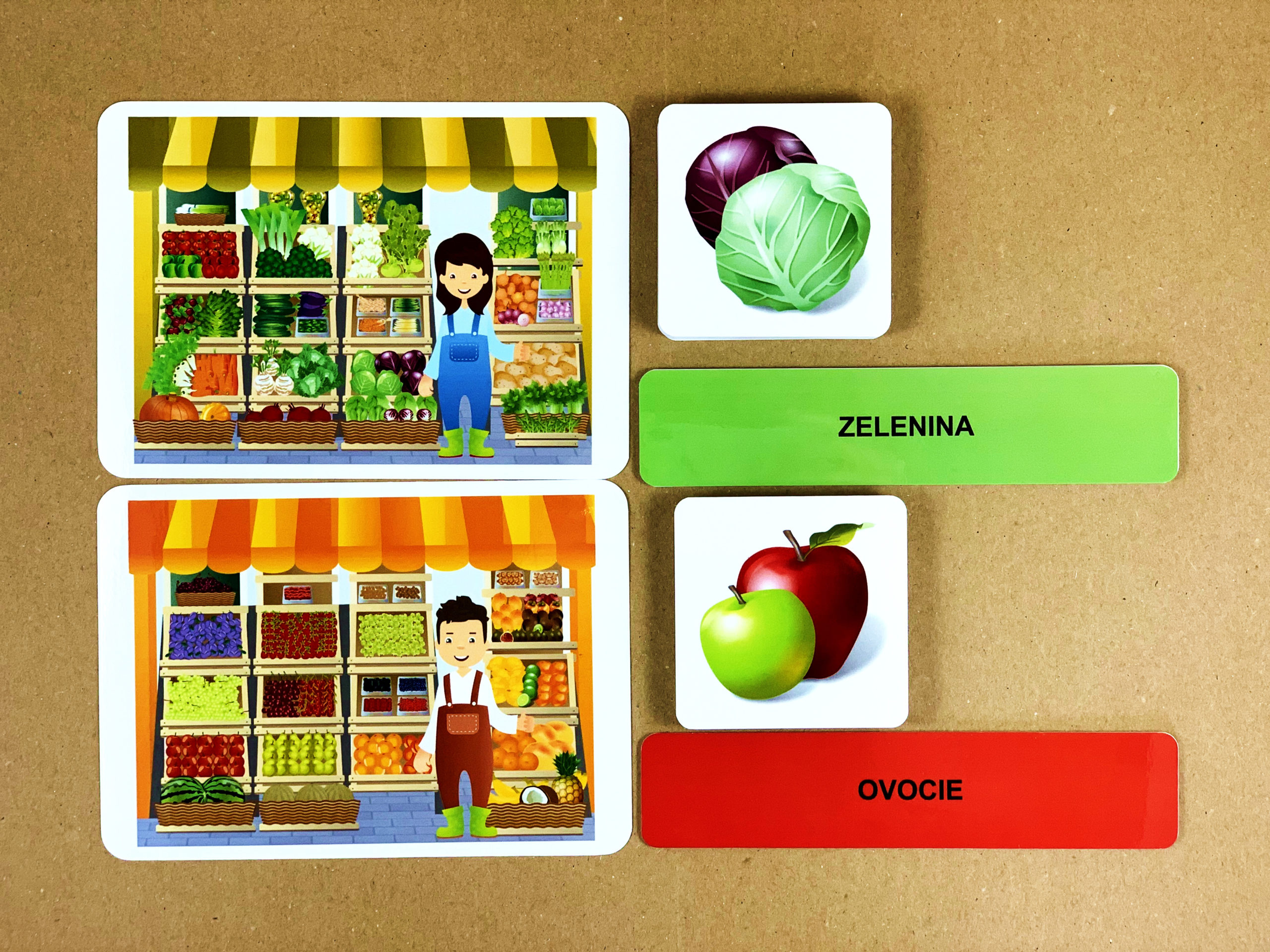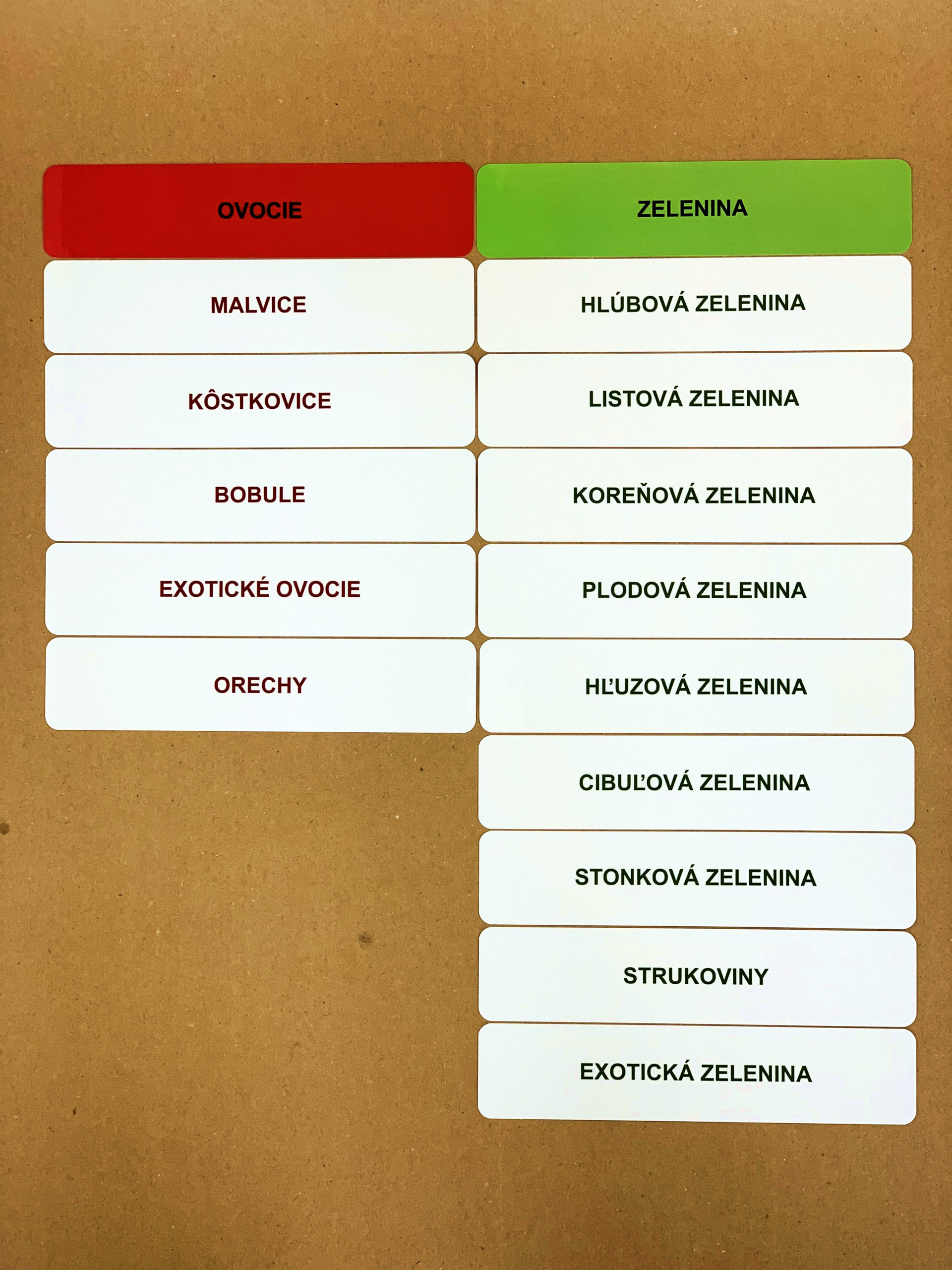 Úlohou detí je prikladať malé obrázkové karty s ovocím resp. zeleninou k správnej skupine. Pri triedení môžete použiť aj textové karty.