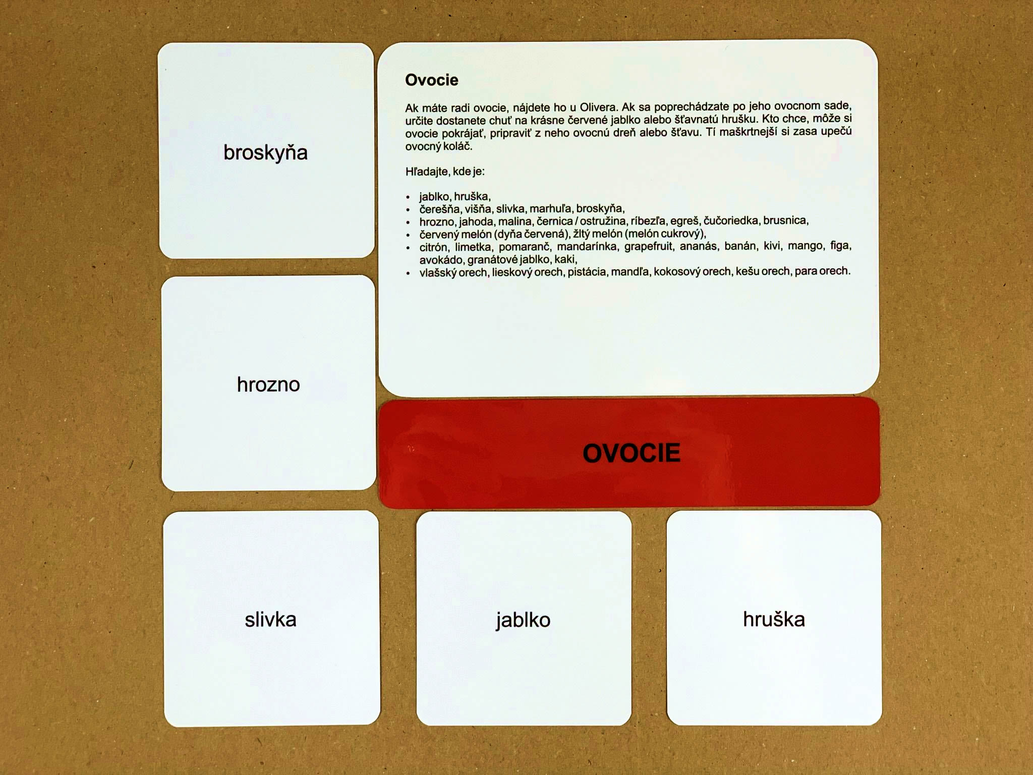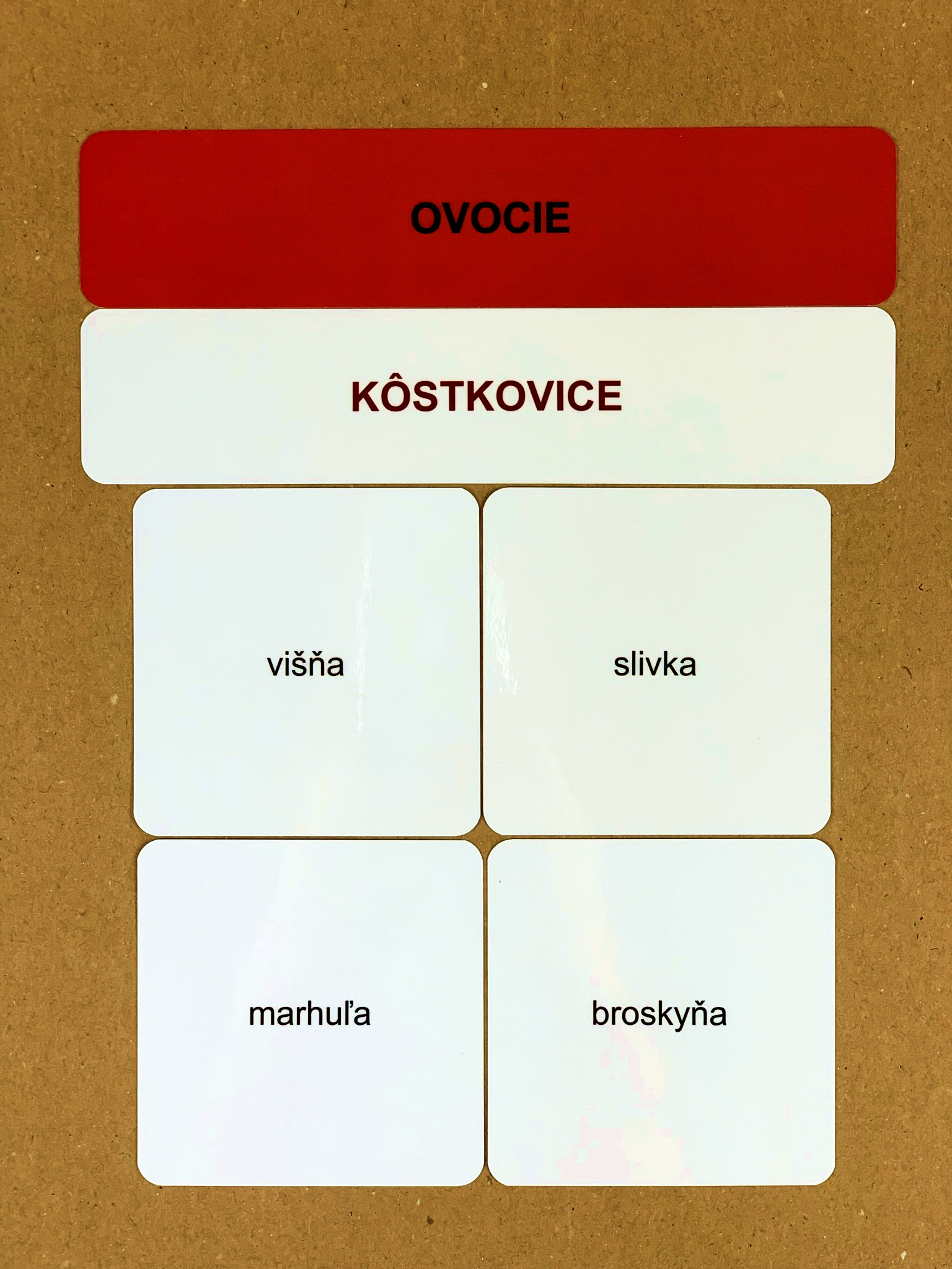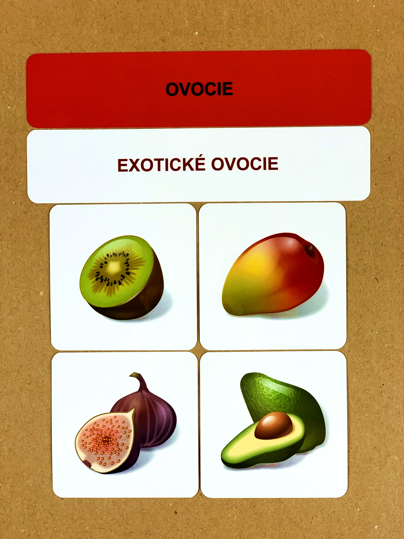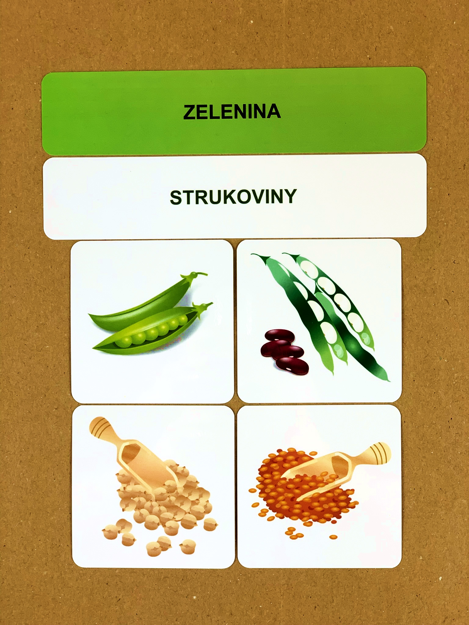 Úlohou detí je prikladať malé obrázkové karty s ovocím resp. zeleninou k správnej skupine. Pri triedení môžete použiť aj textové karty.