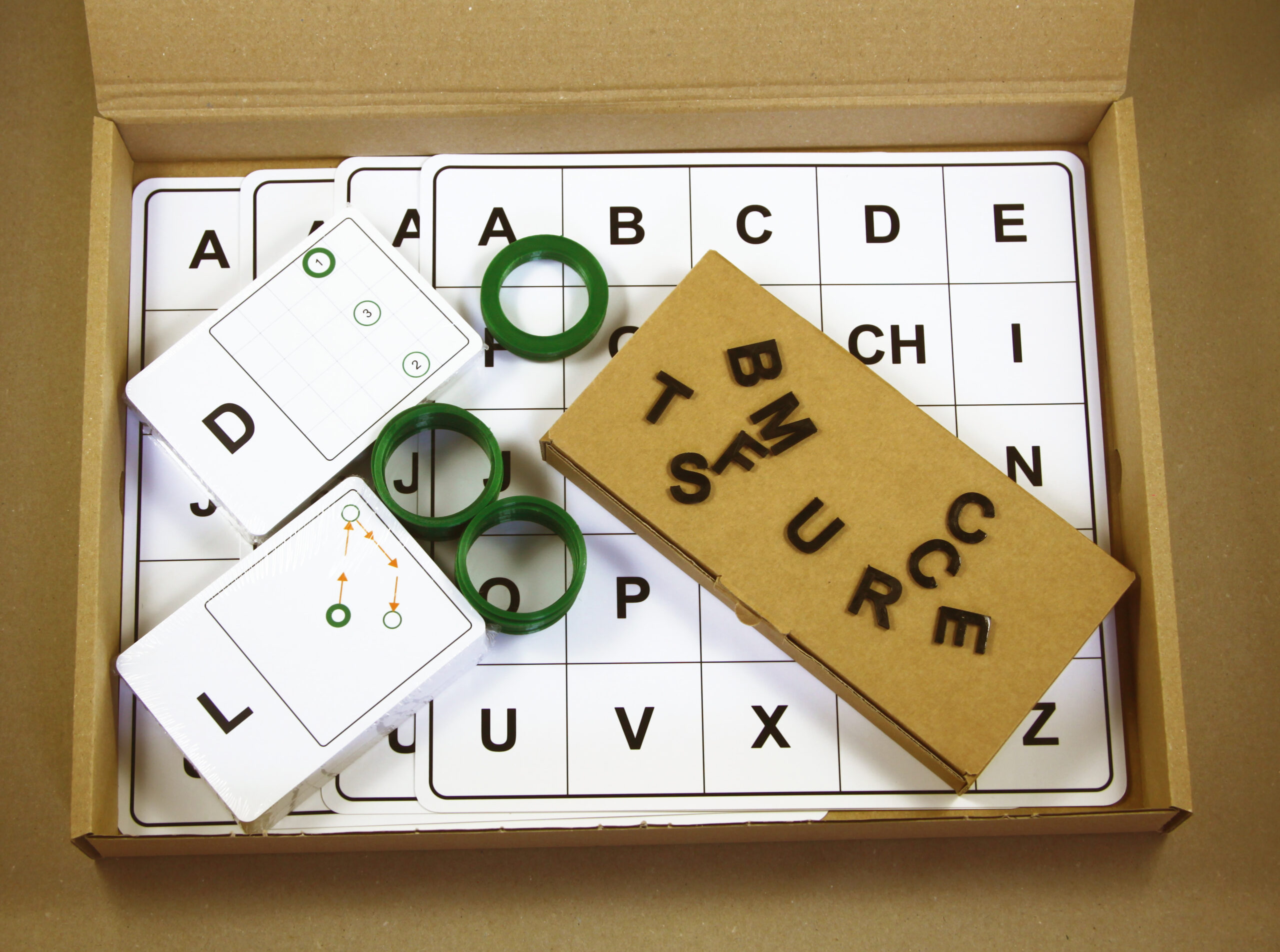 Súprava herných plánov, autokorekčných kariet s úlohami a modelov hlások.