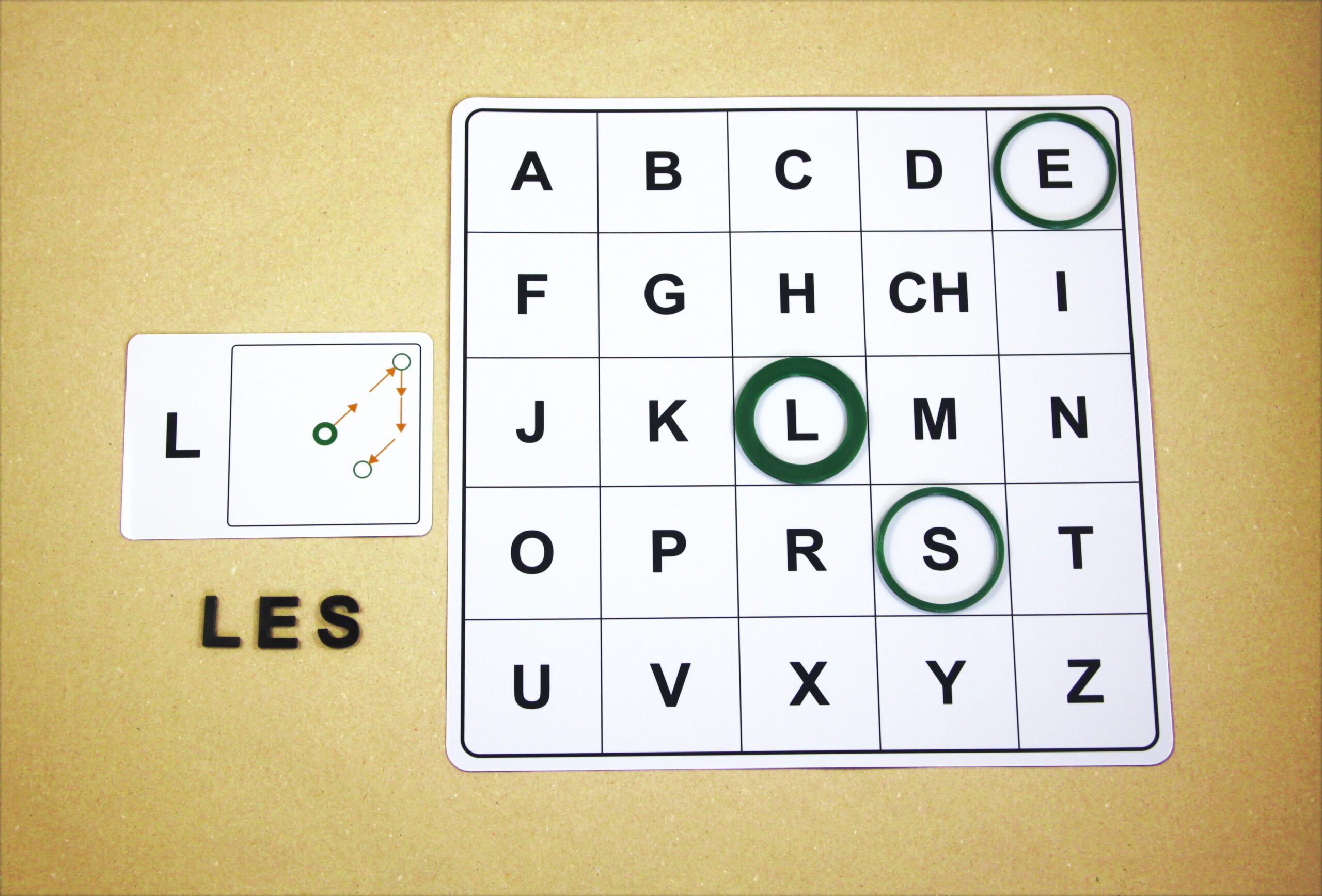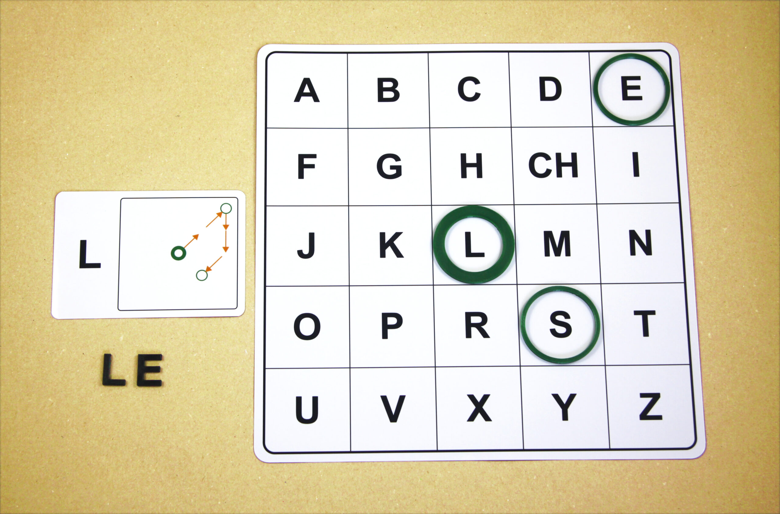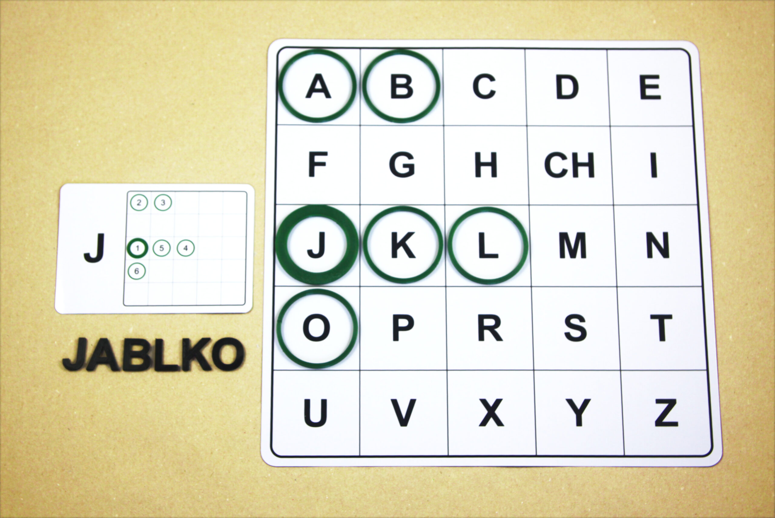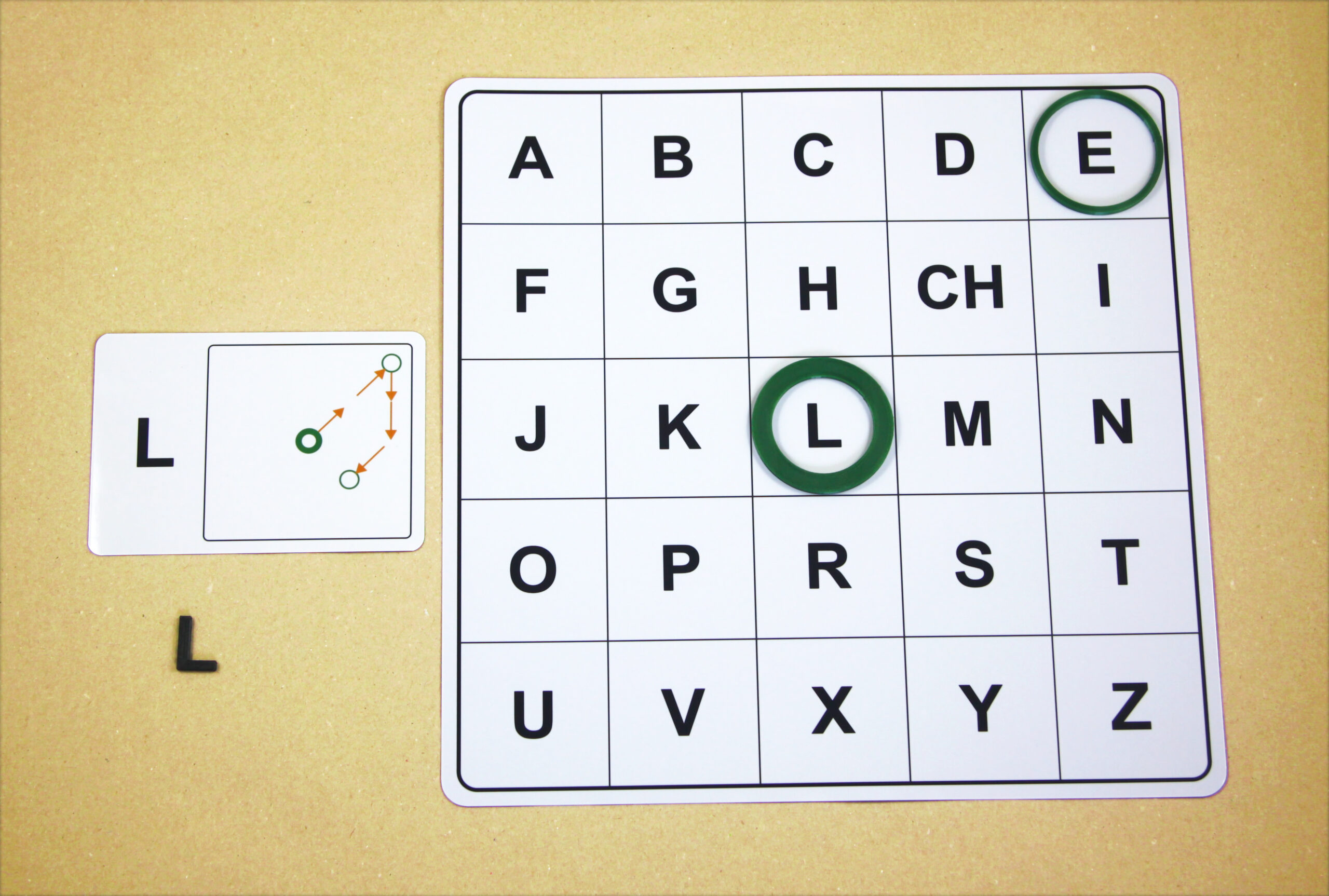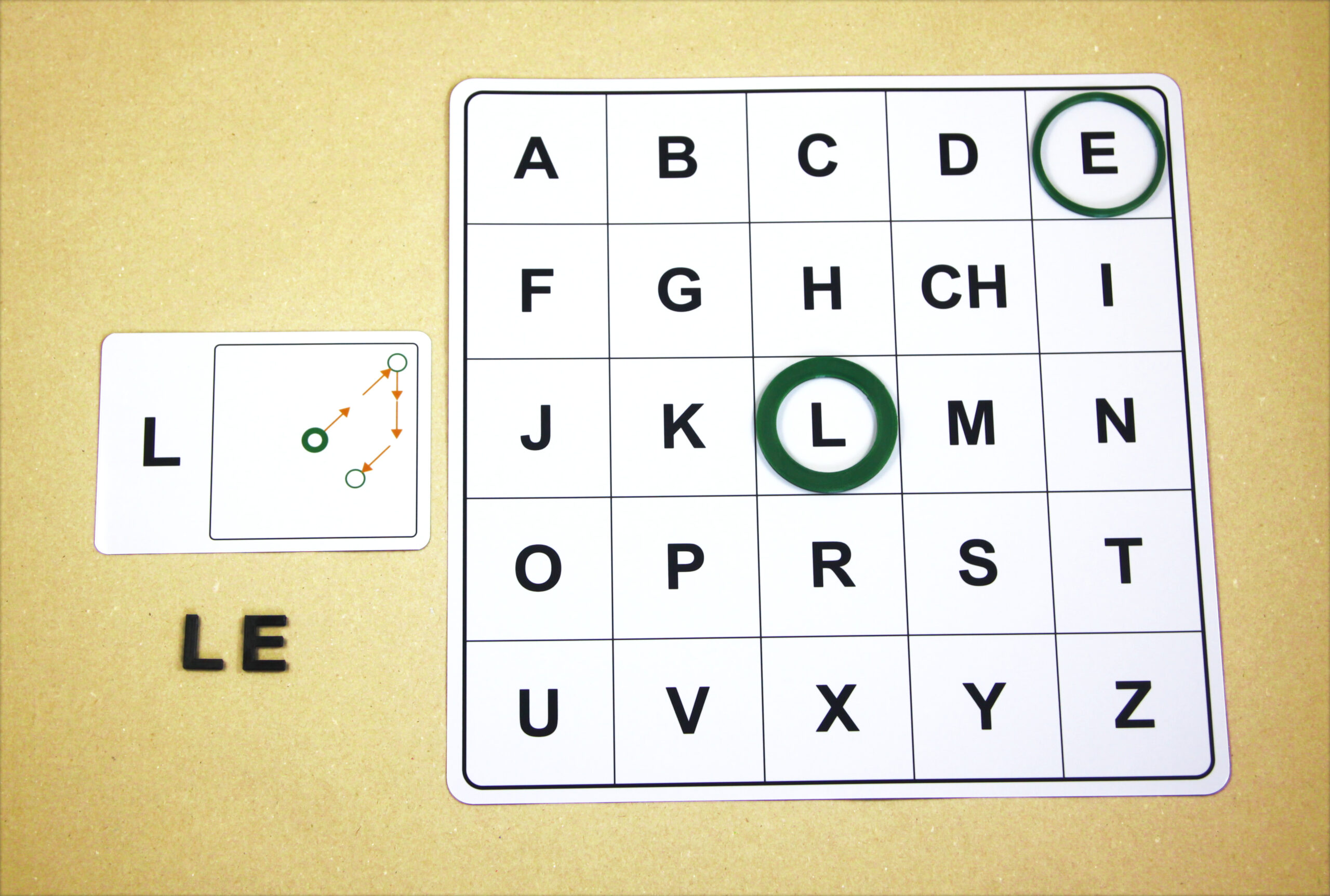Na hernom pláne sa posúvajú podľa smeru šípok a orientačnú značku (tenší kruh) položia na pole s hláskou E.