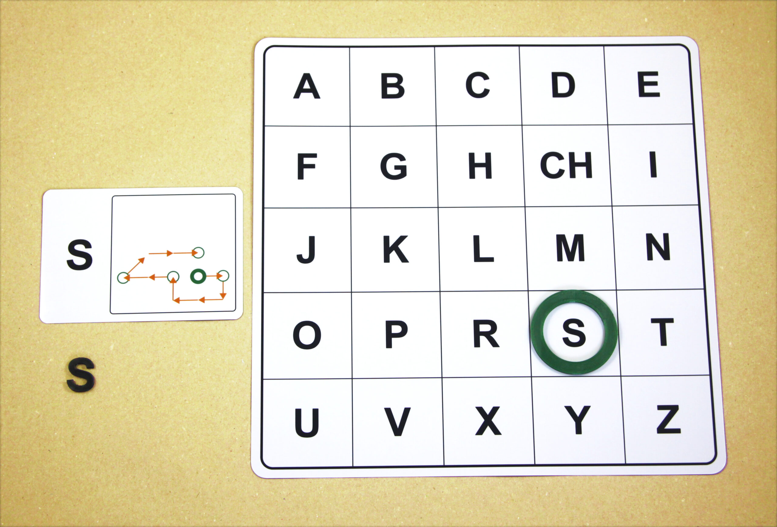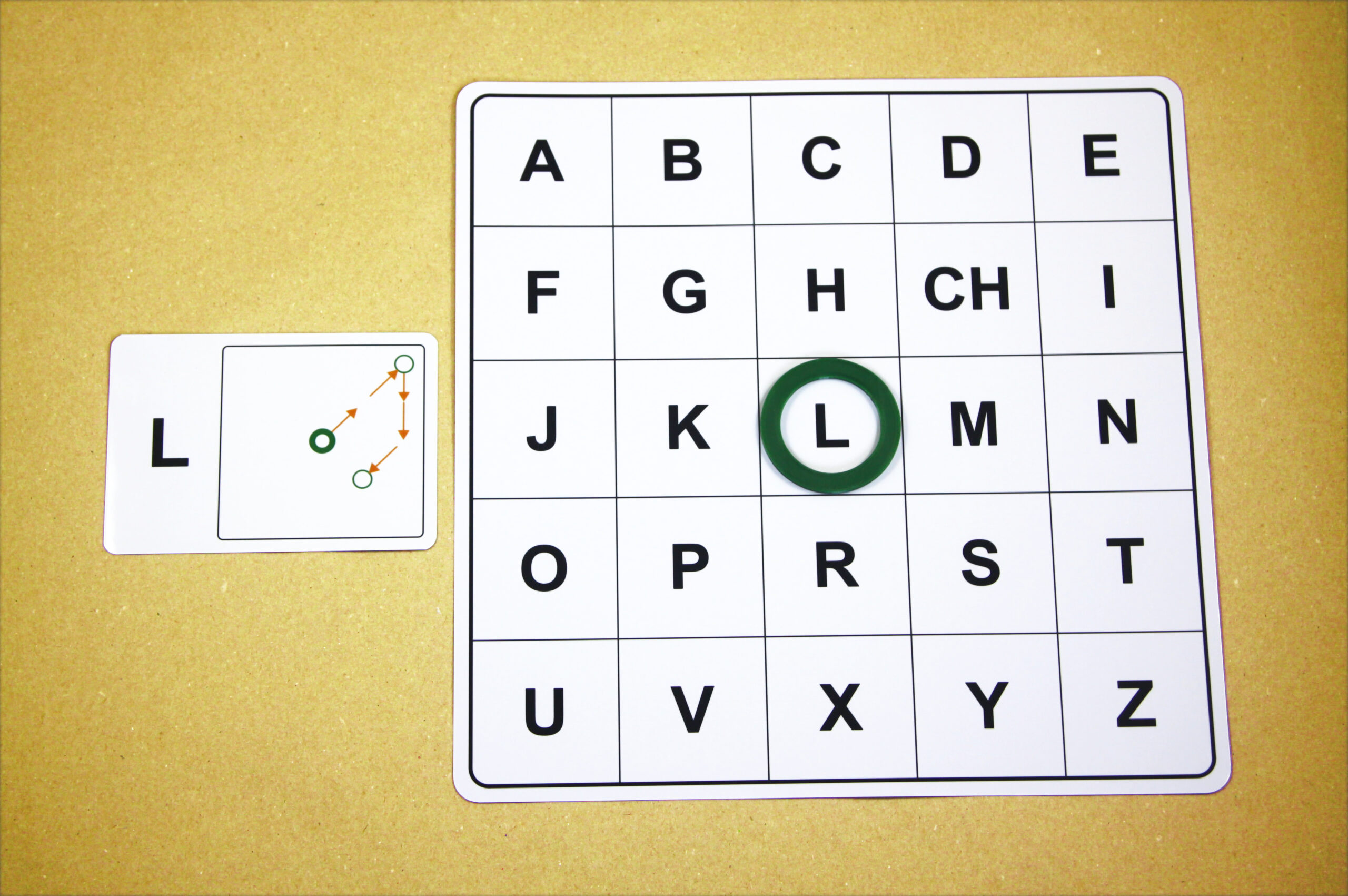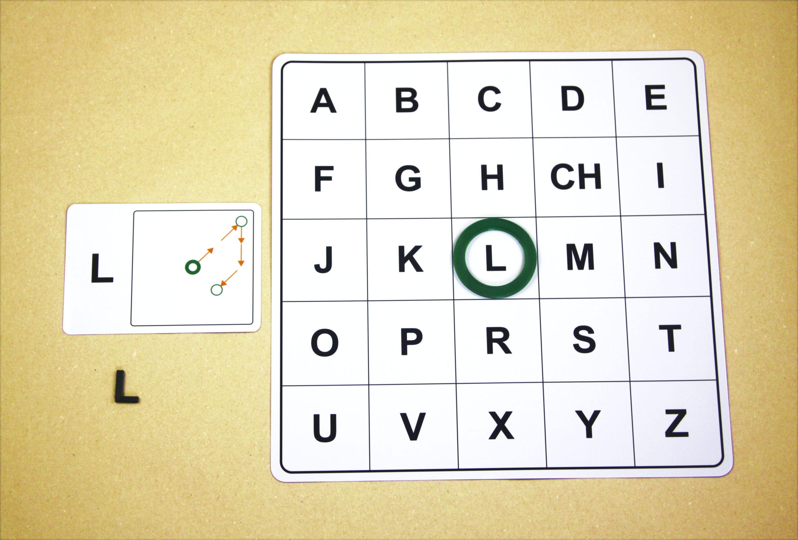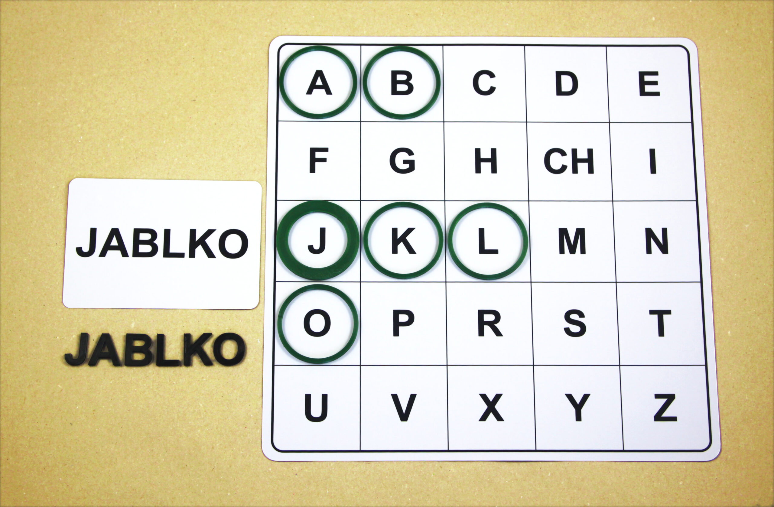 Na hernom pláne sa posúvajú podľa smeru šípok a orientačnú značku (tenší kruh) položia na pole s hláskou E.