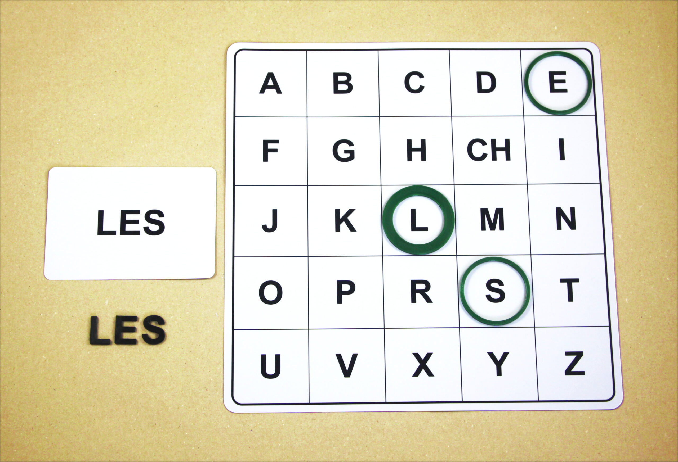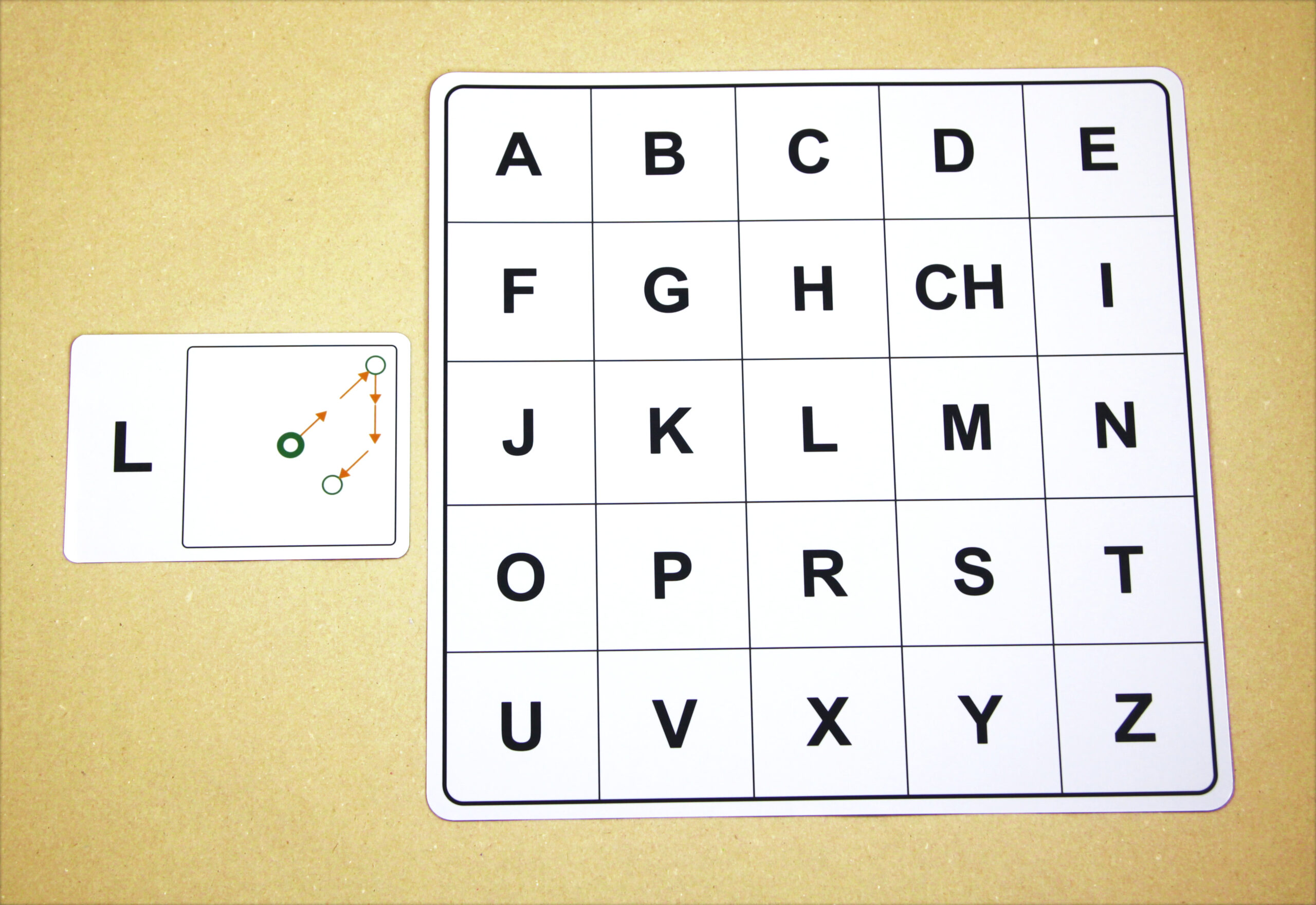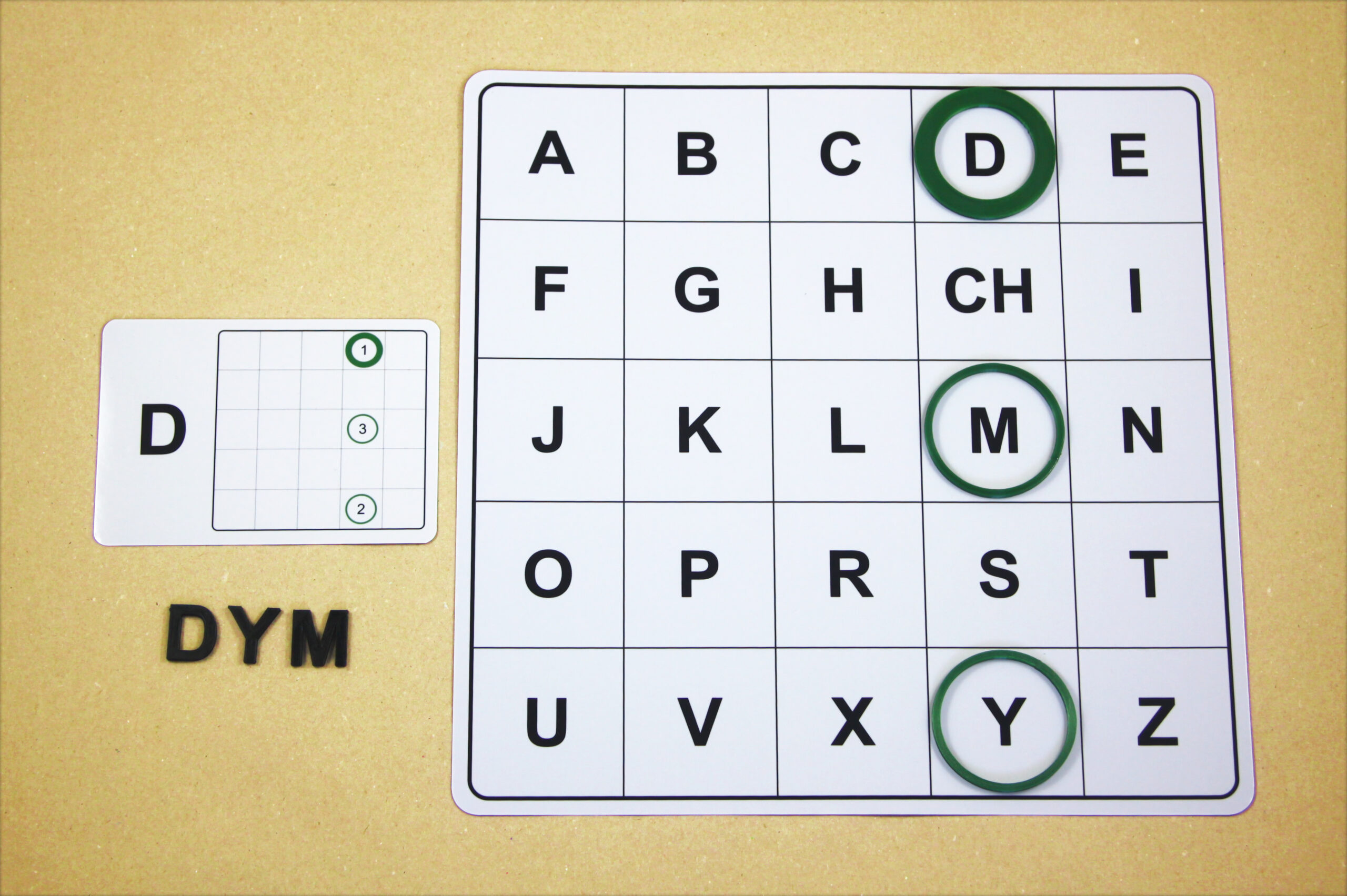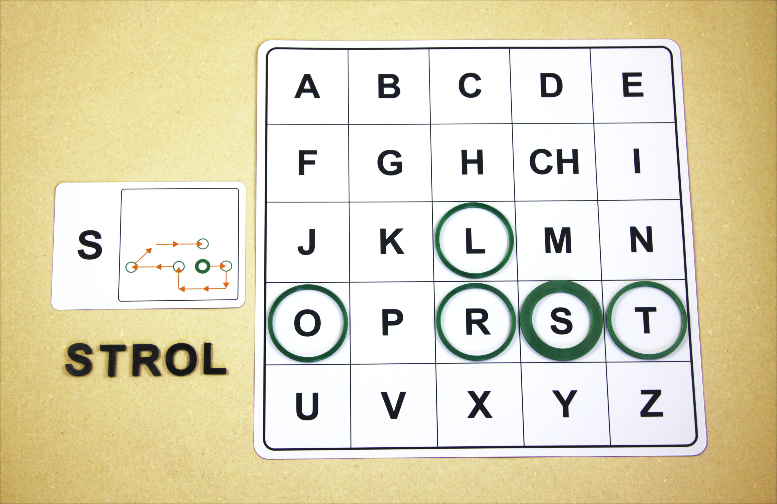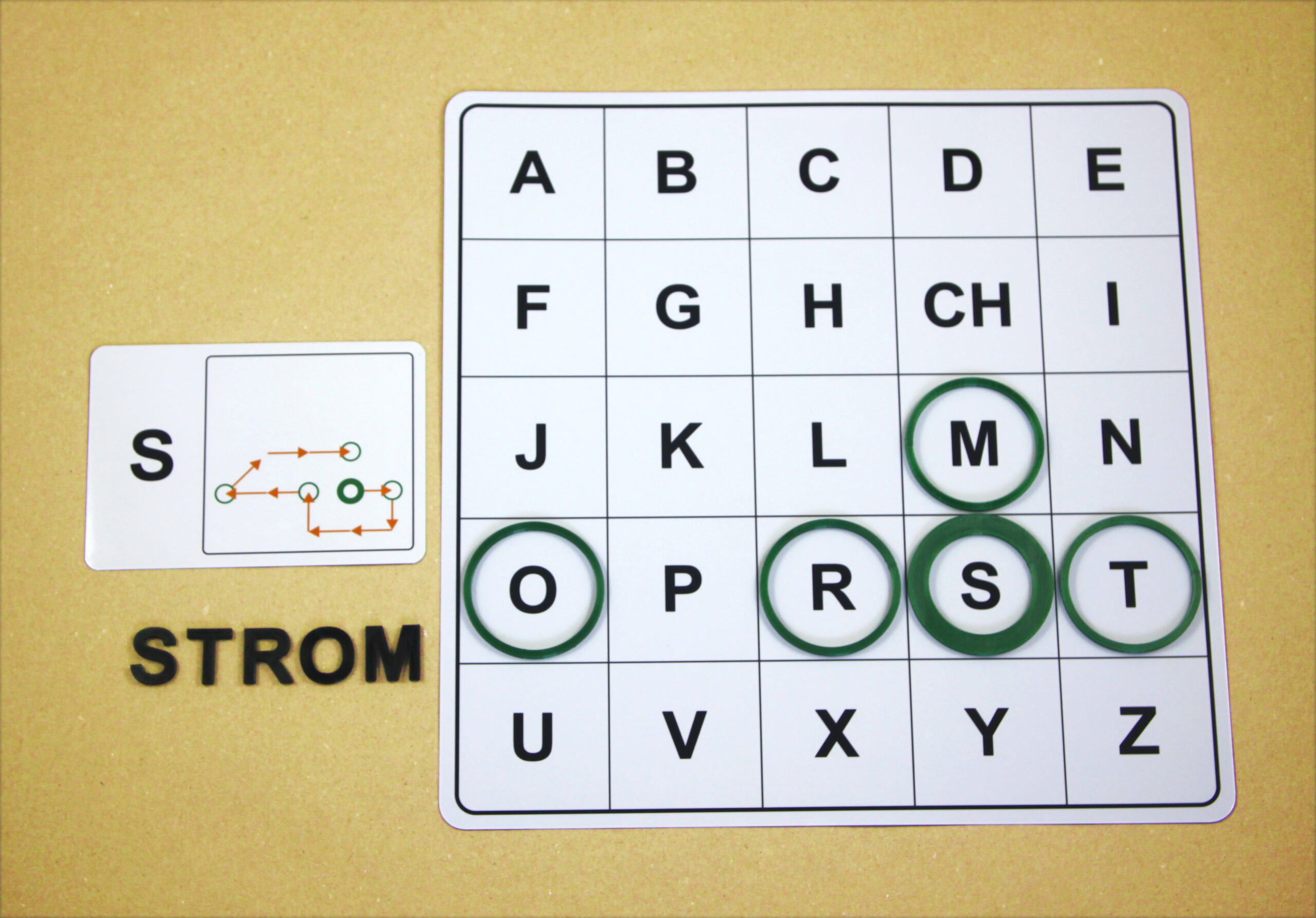 Na hernom pláne sa posúvajú podľa smeru šípok a orientačnú značku (tenší kruh) položia na pole s hláskou E.