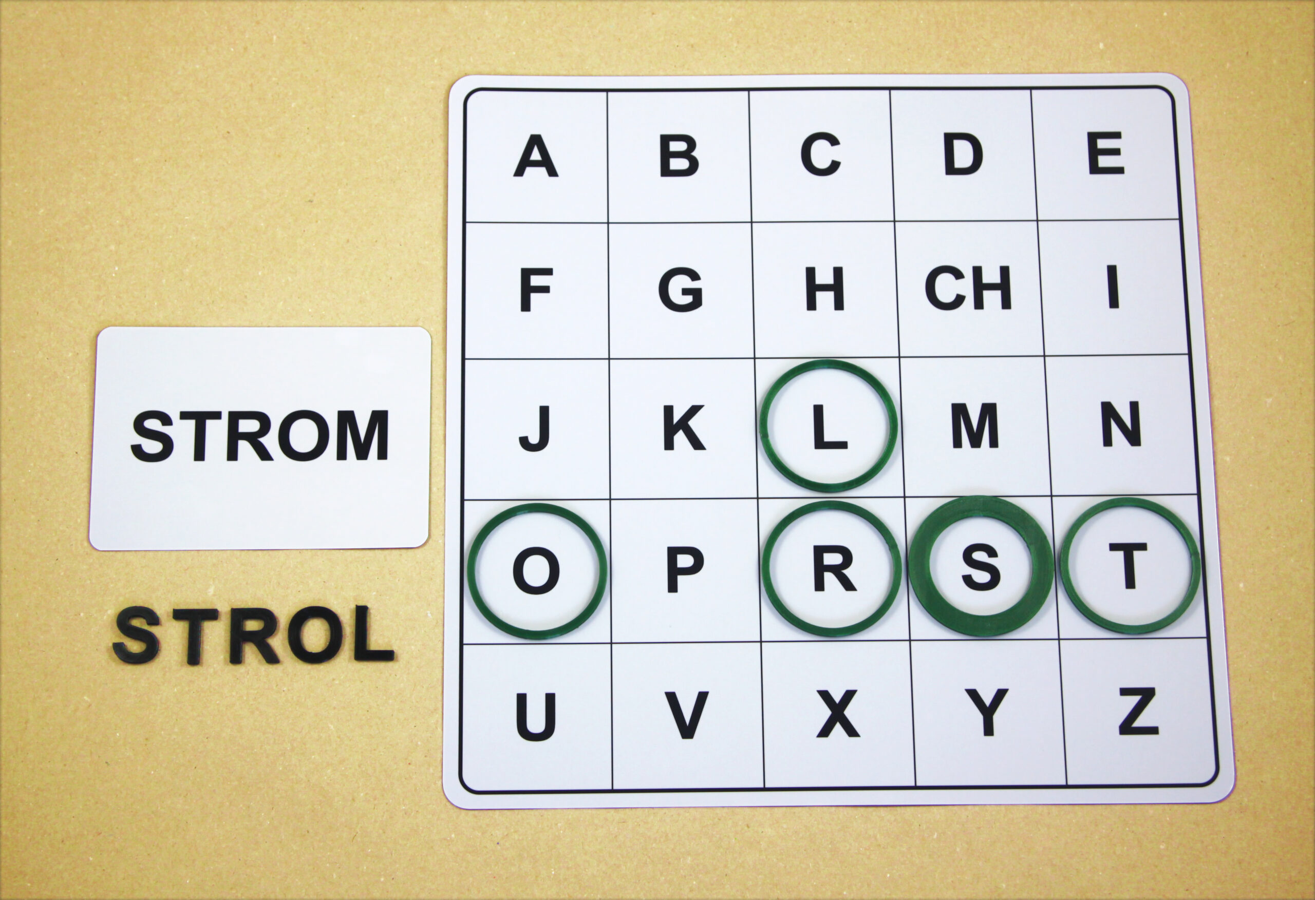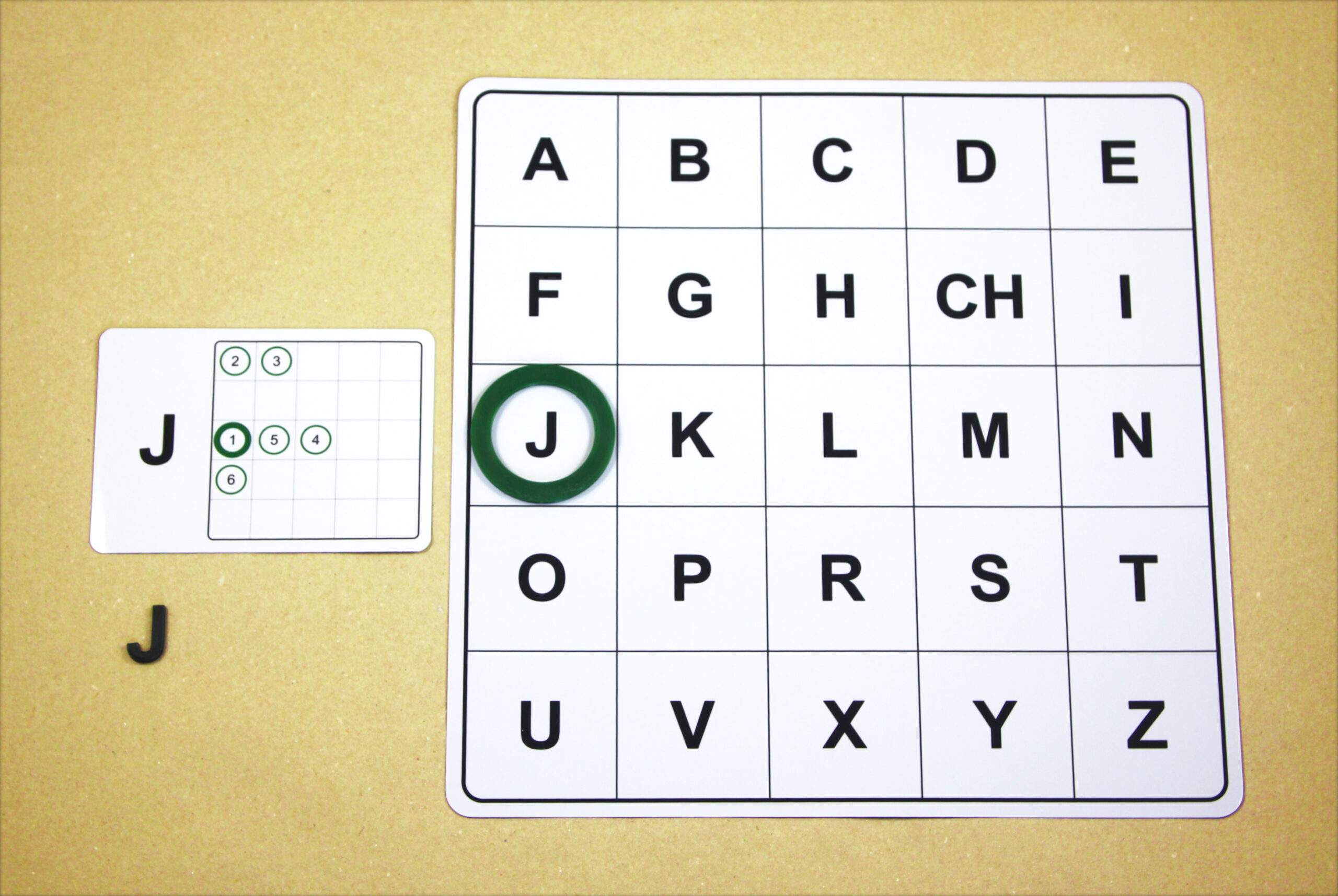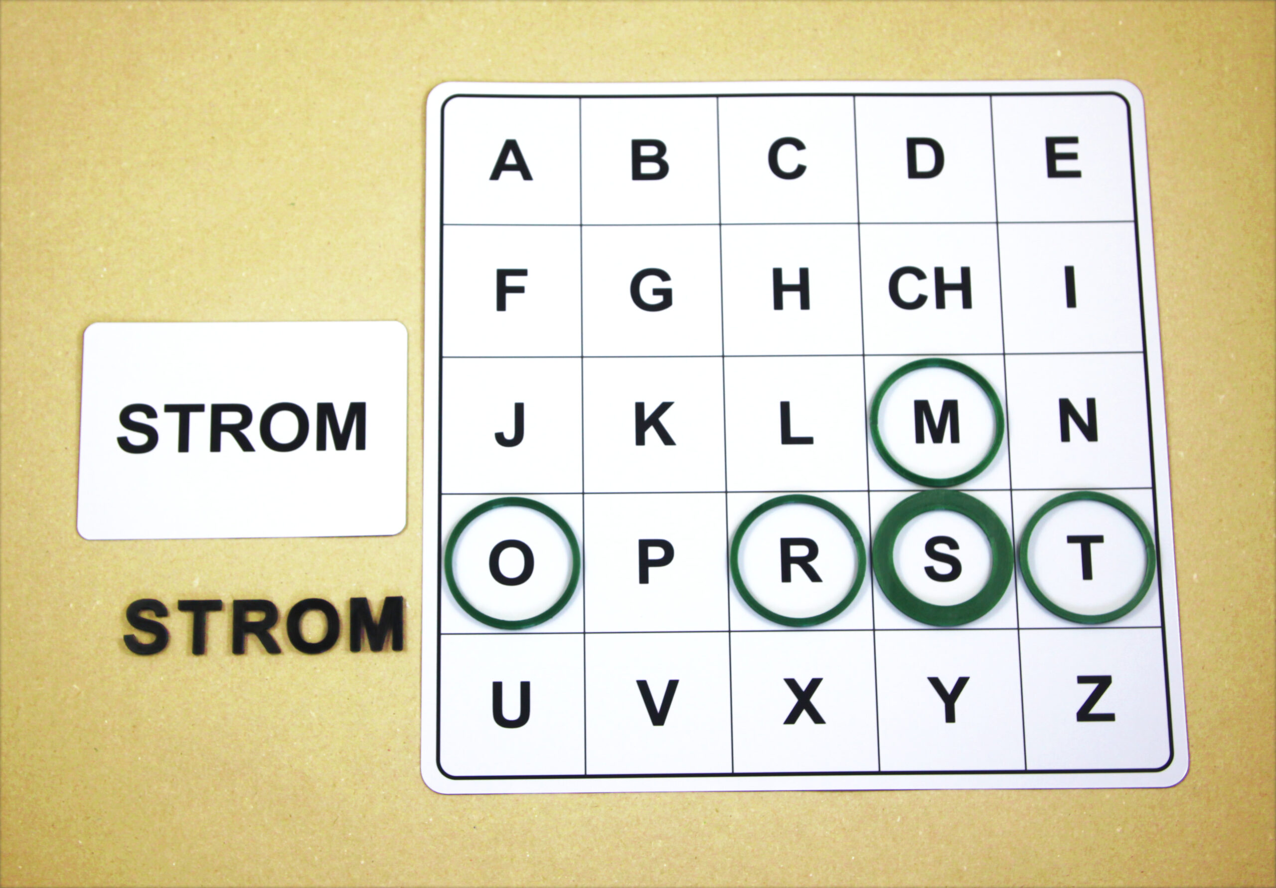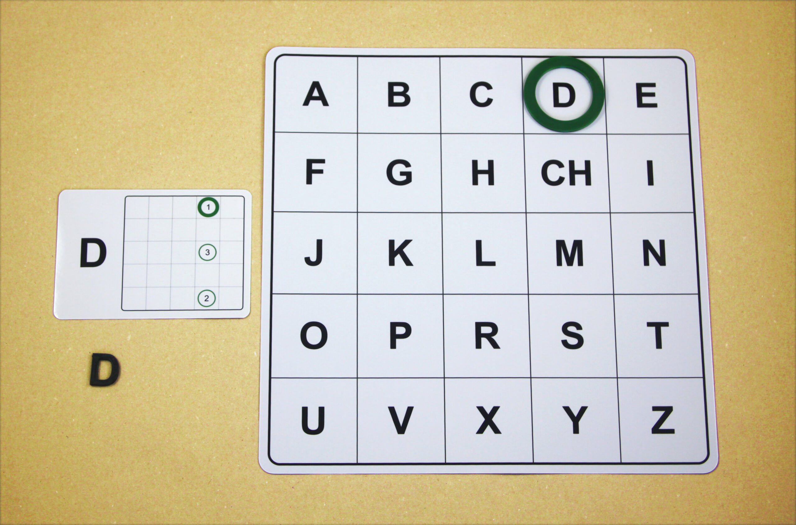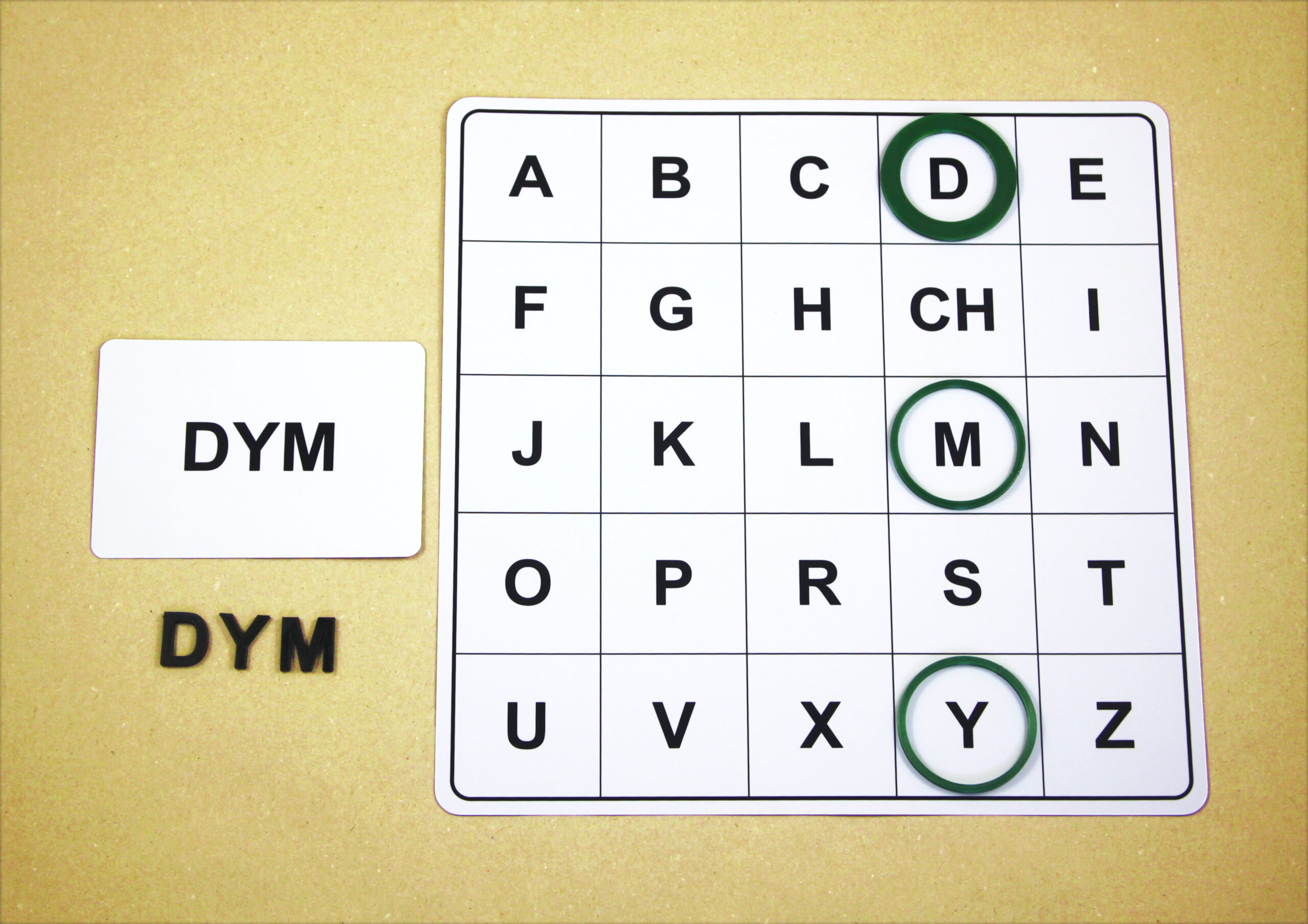 Na hernom pláne sa posúvajú podľa smeru šípok a orientačnú značku (tenší kruh) položia na pole s hláskou E.