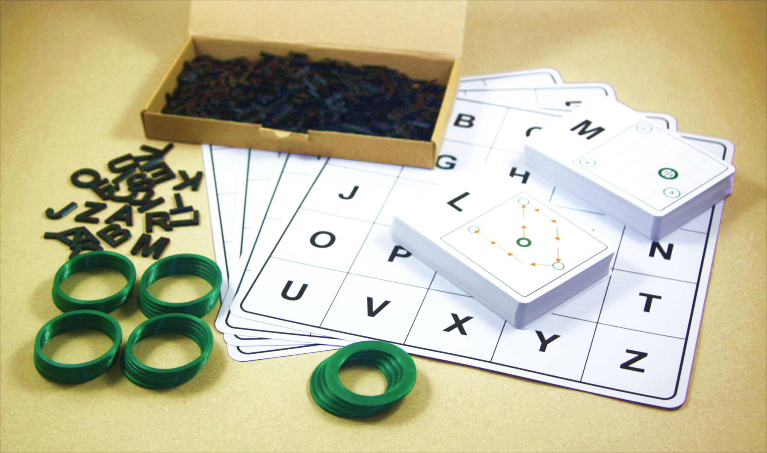 Plastové modely hlások sú v krabičke roztriedené v mriežke, deti ich ľahko nájdu; tiež ľahko a rýchlo pripravíte hlásky na hru.