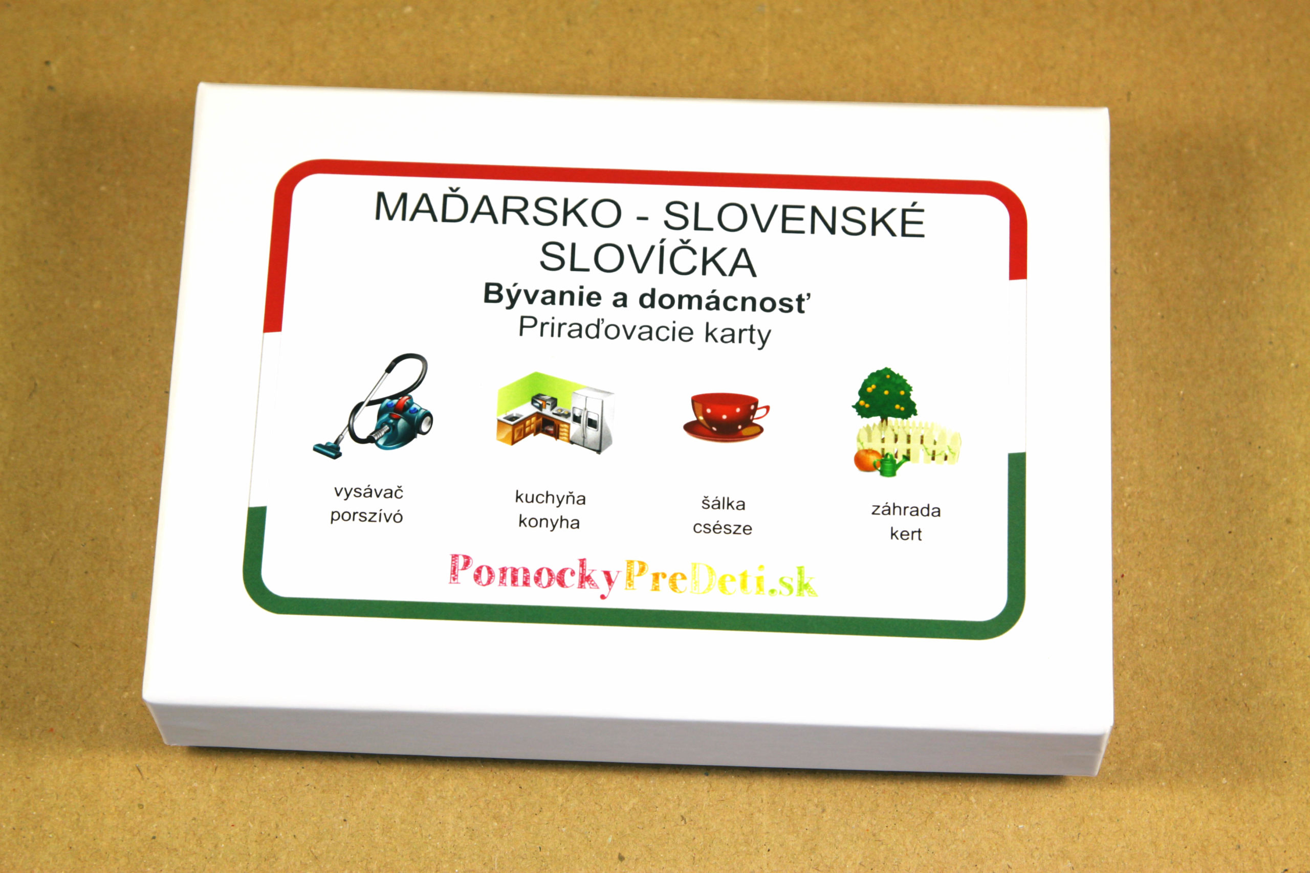 Učebná pomôcka Slovenské slovíčka pre deti z materinským jazykom maďarským – Bývanie a domácnosť (priraďovacie karty) je určená maďarským deťom školského veku, ktoré sa učia slovenčinu ako cudzí jazyk. Prostredníctvom obrázkových a textových kariet si deti zábavným a účinným spôsobom rozvíjajú a upevňujú základnú slovnú zásobu v slovenskom jazyku.