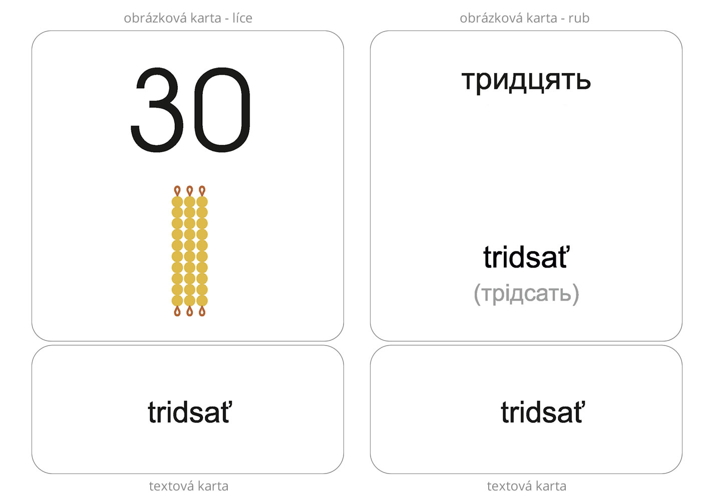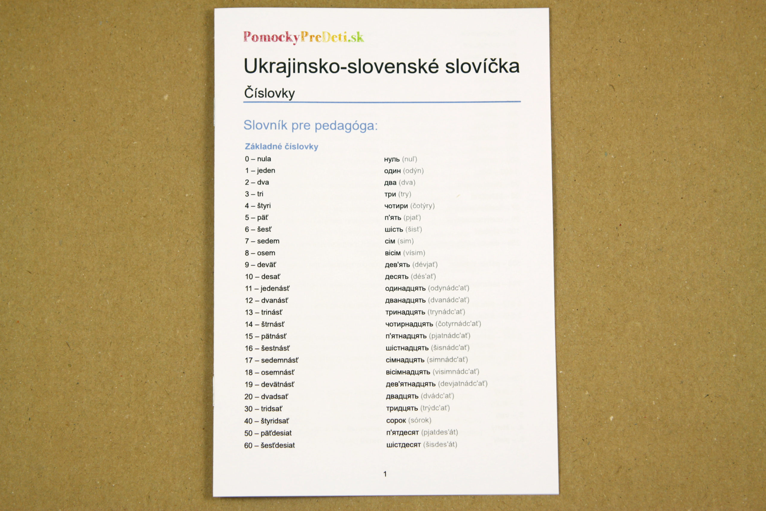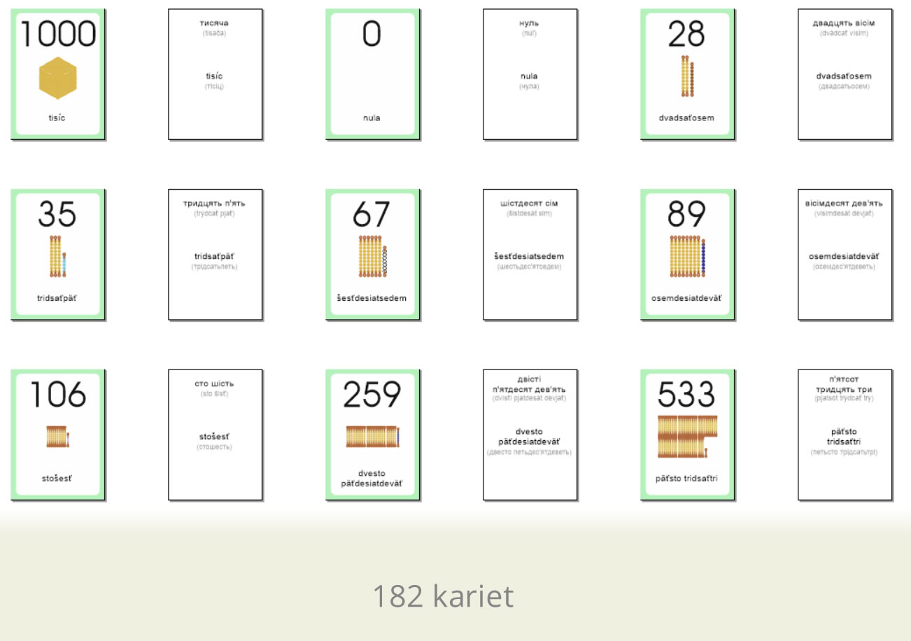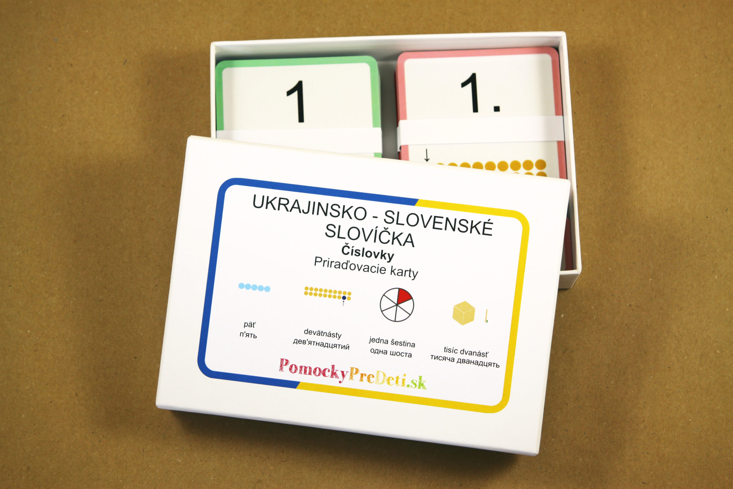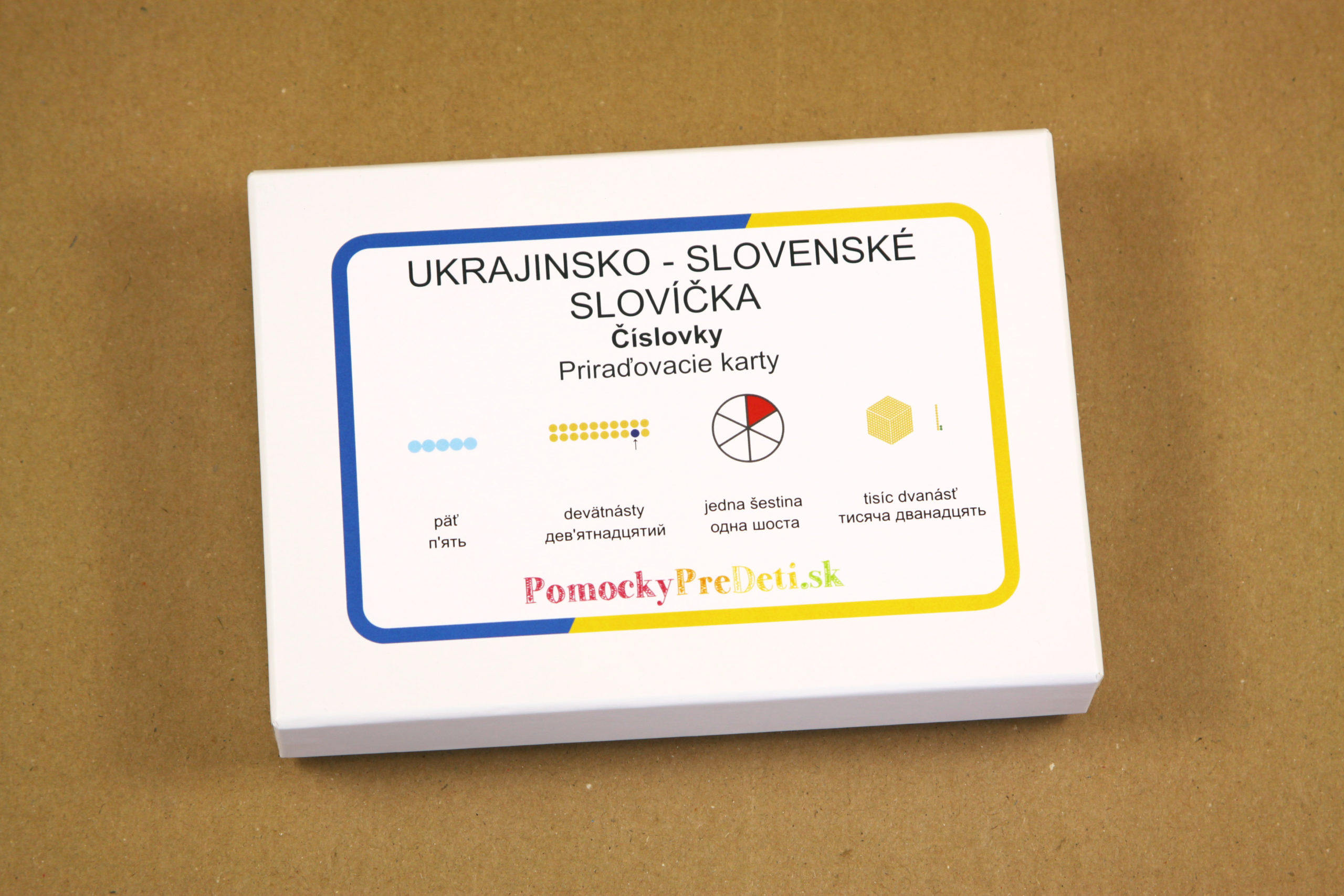 Učebná pomôcka Slovenské slovíčka pre deti z Ukrajiny – Číslovky (priraďovacie karty) je určená ukrajinským deťom predškolského a školského veku, ktoré sa učia slovenčinu ako cudzí jazyk. Prostredníctvom obrázkových a textových kariet si deti zábavným spôsobom rozvíjajú a upevňujú základnú slovnú zásobu v slovenskom jazyku.