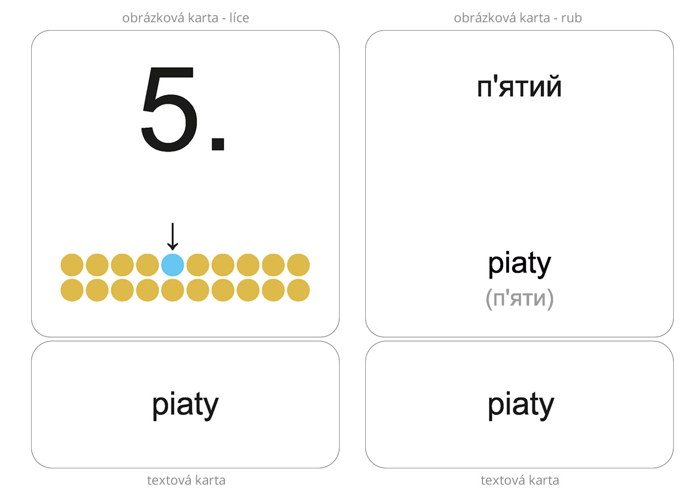 44 malých kariet s textom - tematický okruh Radové číslovky