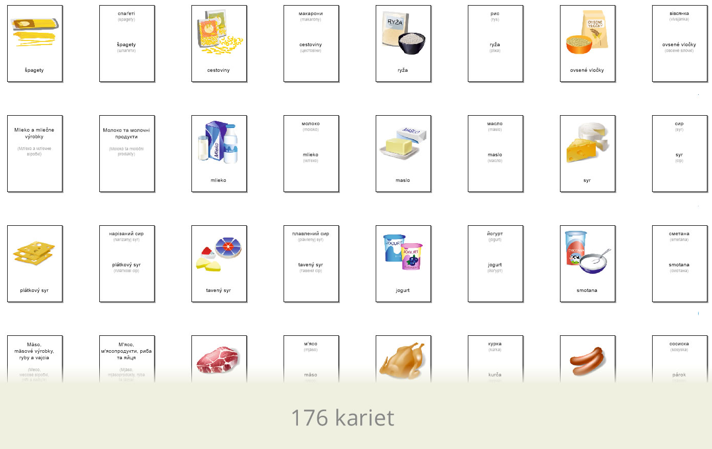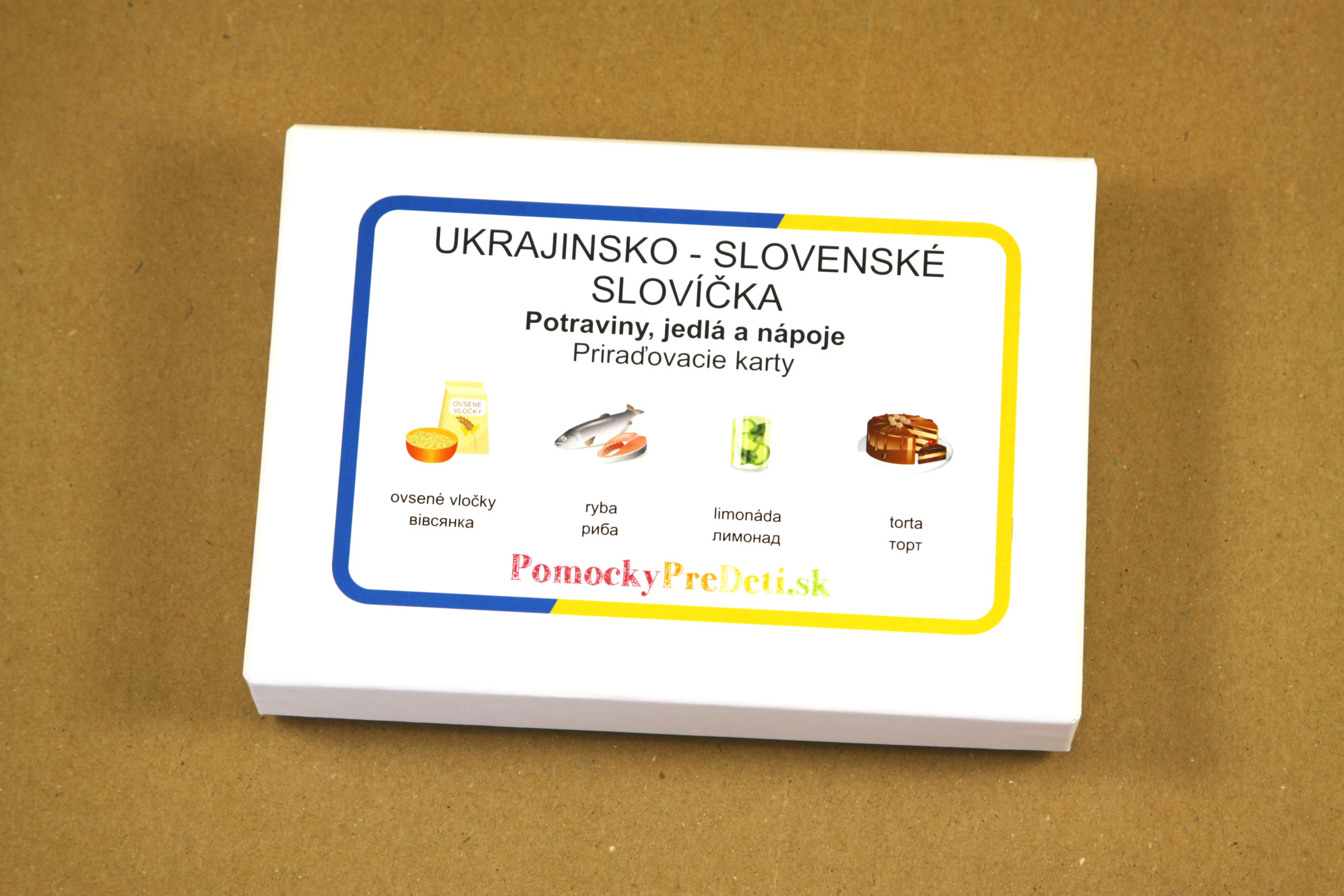 Učebná pomôcka Slovenské slovíčka pre deti z Ukrajiny – Potraviny, jedlá a nápoje (priraďovacie karty) je určená ukrajinským deťom predškolského a školského veku, ktoré sa učia slovenčinu ako cudzí jazyk. Prostredníctvom obrázkových a textových kariet si deti zábavným spôsobom rozvíjajú a upevňujú základnú slovnú zásobu v slovenskom jazyku.